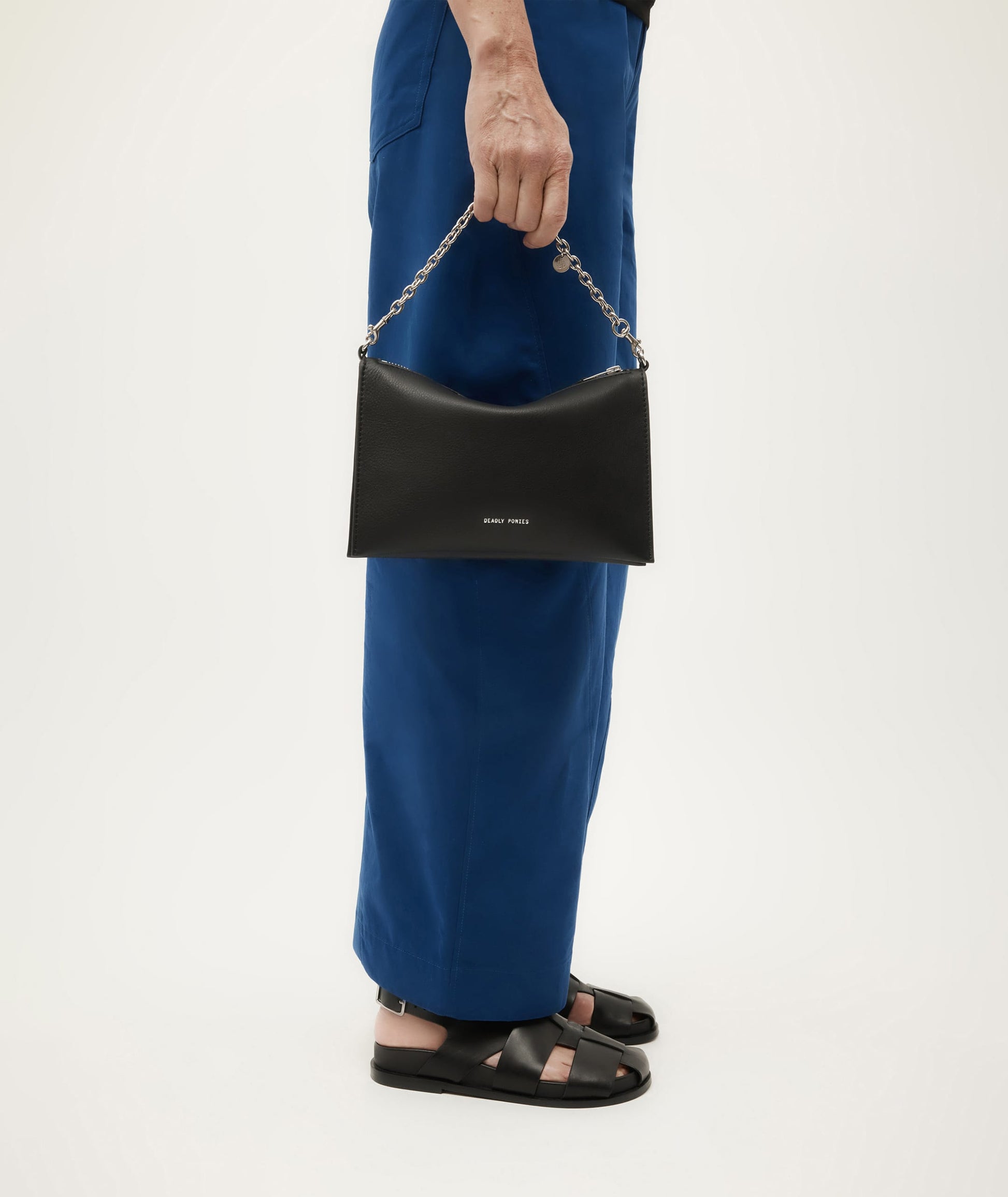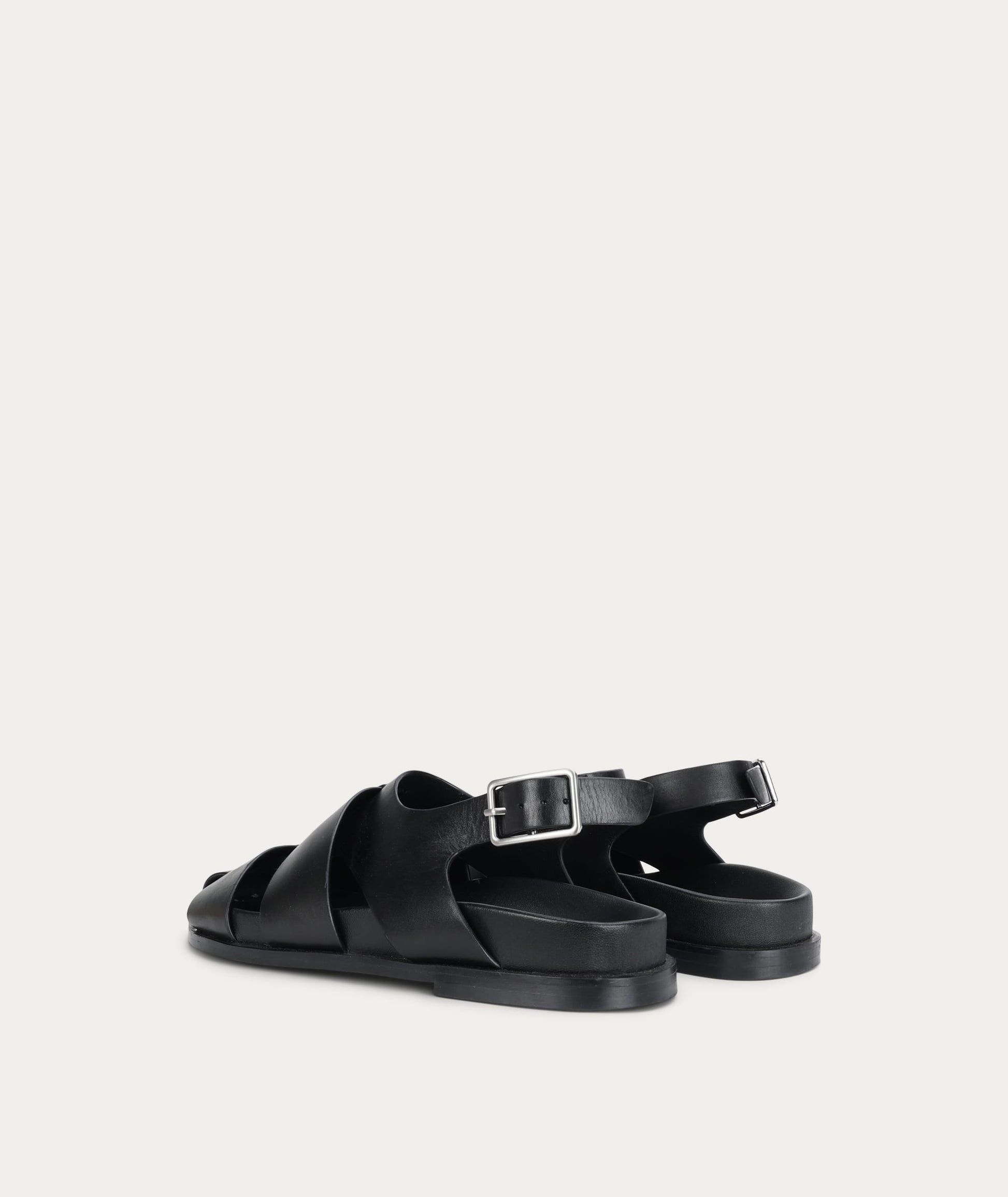 Fisherman-style sandal in Calf Nappa with Lamb Nappa lining sourced from LWG-certified suppliers. Triton Sandal in Black features a rounded toe, interlocking straps with an adjustable back buckle.