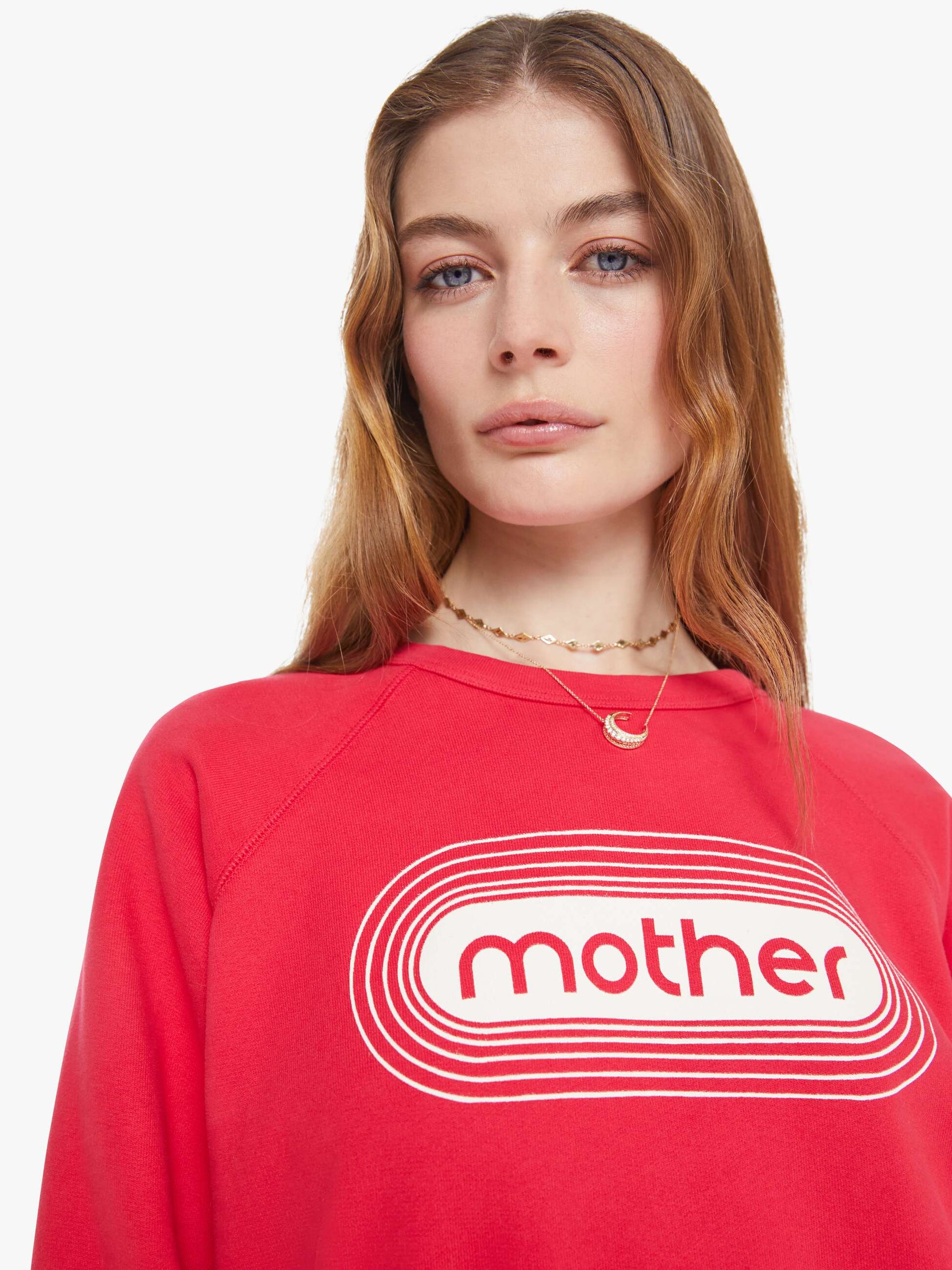 Tune in. A raglan sweatshirt with a crewneck, ribbed hems and a slightly oversized fit. Made from super-soft 100% cotton, the sweatshirt is designed in red with a white text graphic and MOTHER's name on the front.