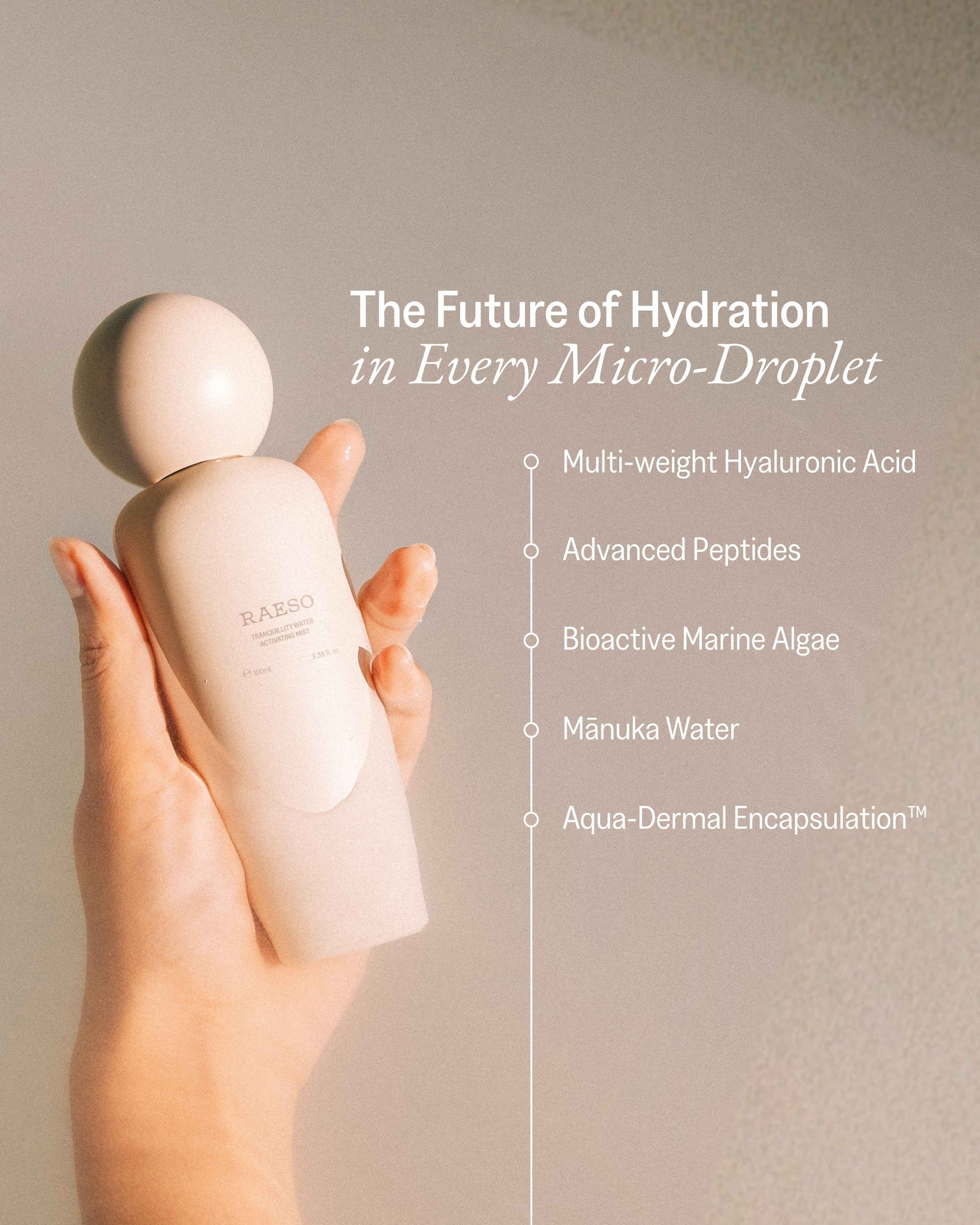 The future of hydration in every micro-droplet. This next-generation hydrating mist fuses New Zealand volcanic thermal water with Aqua-Dermal Encapsulation™ to deliver intelligent, long-lasting moisture in a fine, cooling cloud.