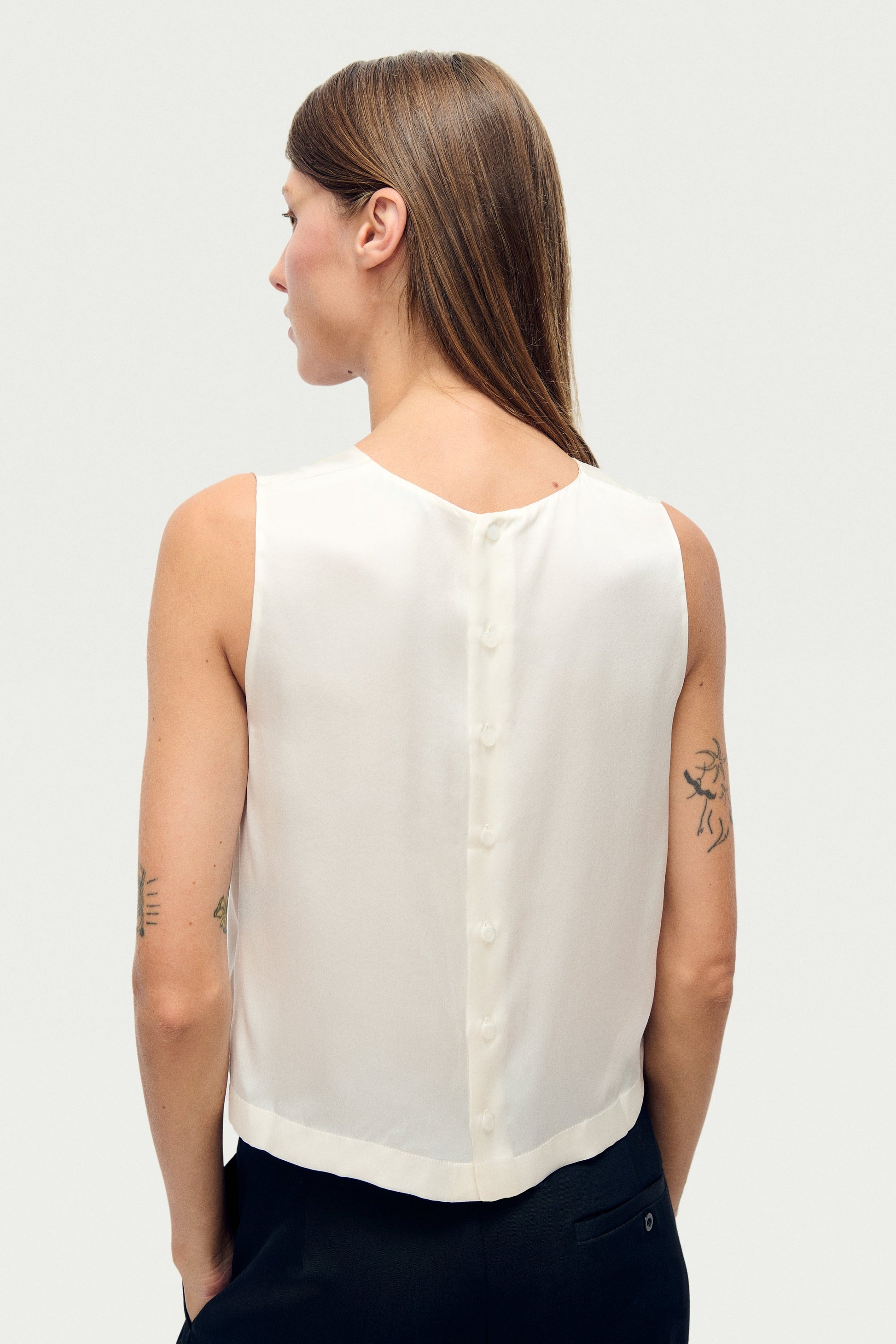 Silk Laundry Elena Top, made from 100% silk. Sleeveless, featuring a round neckline and bodice darts. Finished with button-down back.