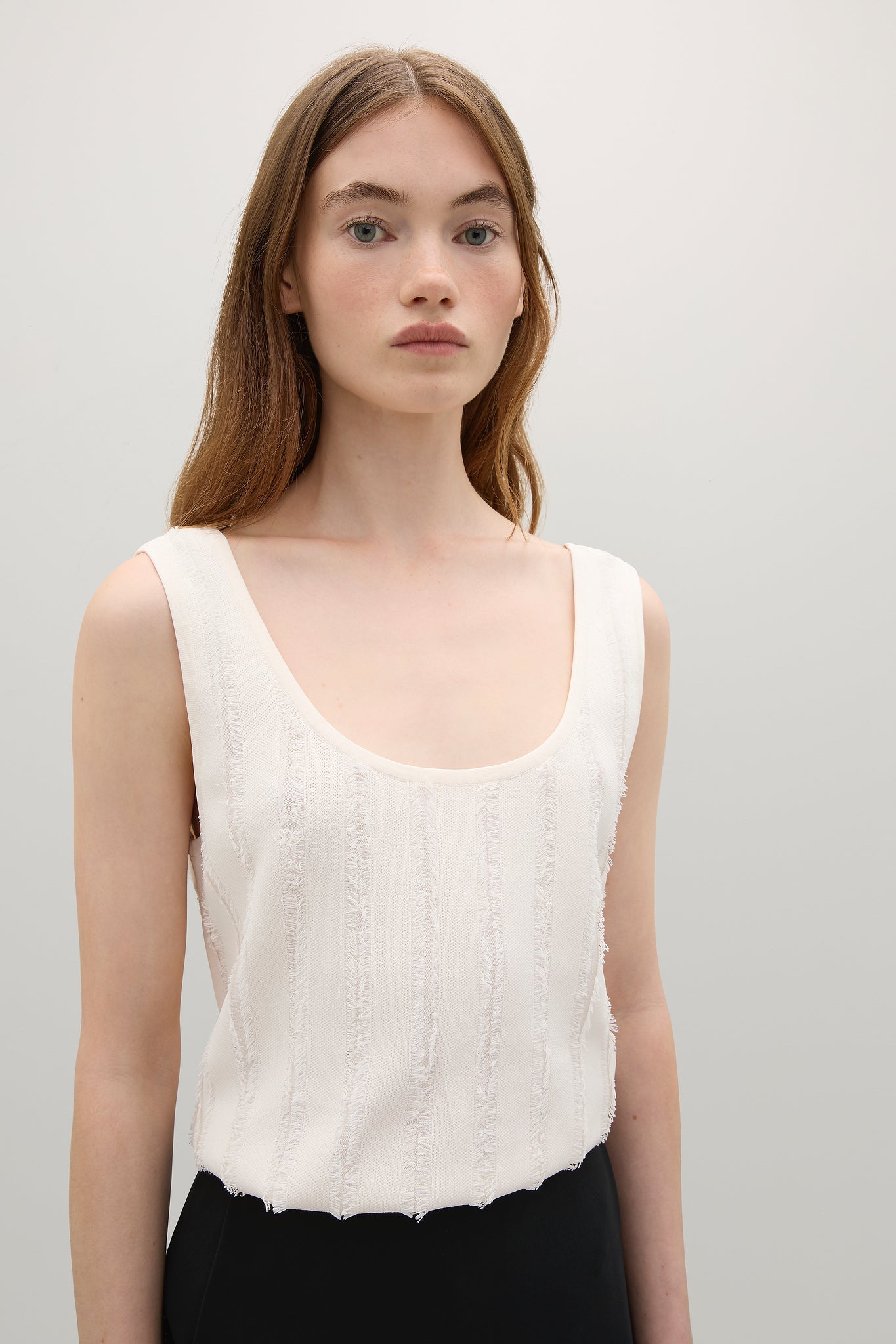 The Faye Tank is crafted from a fringe knit textile developed in house. With a classic tank shape designed for ease of wear, it’s destined to become a wardrobe staple.