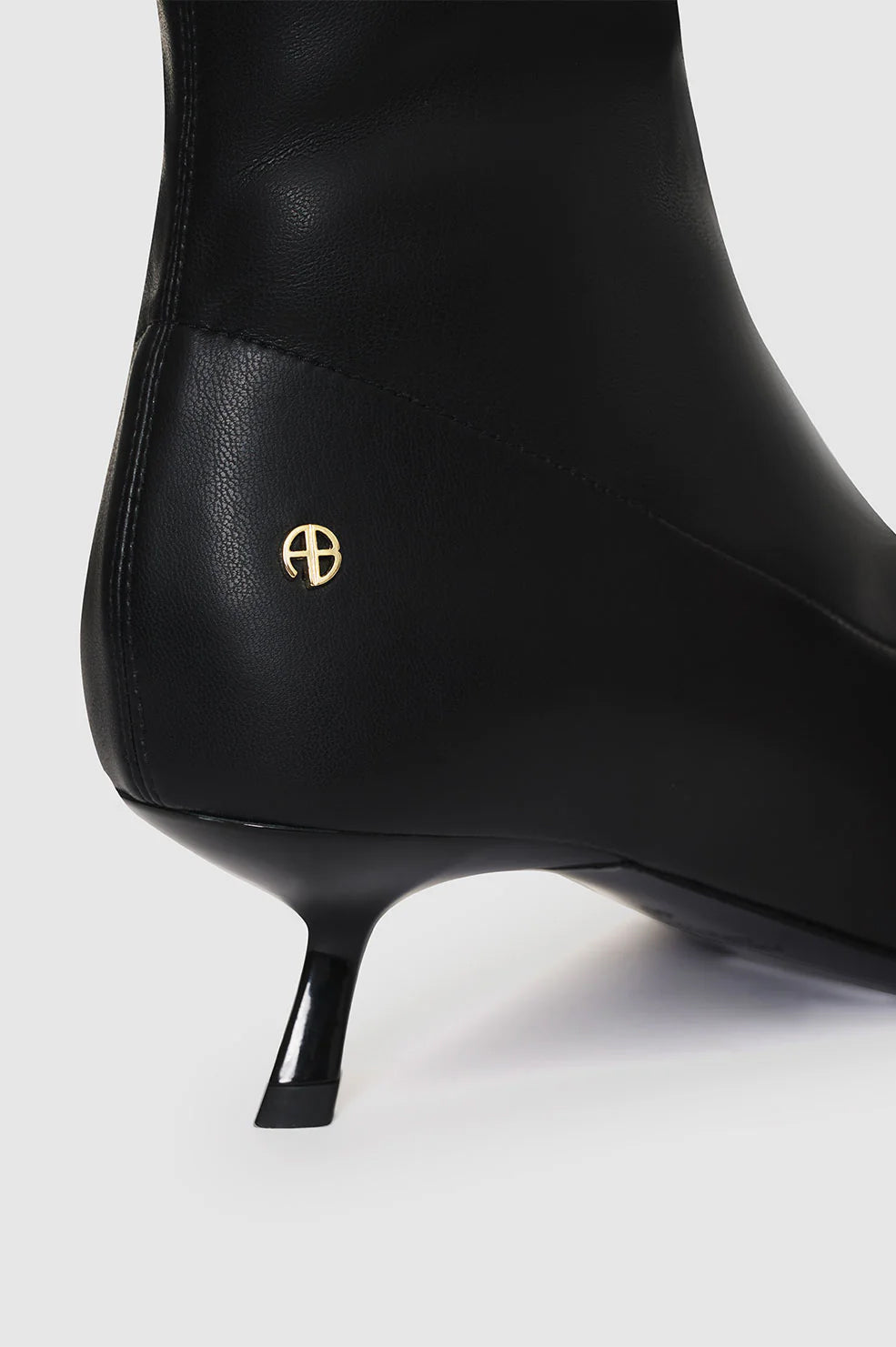 Modern sock booties made from stretch vegan leather with a slight sheen. The Hilda Boots' sleek construction features a sharp pointed toe, low slanted heel, and high-shine outsole. Accented with gold-tone ANINE BING hardware at each heel.