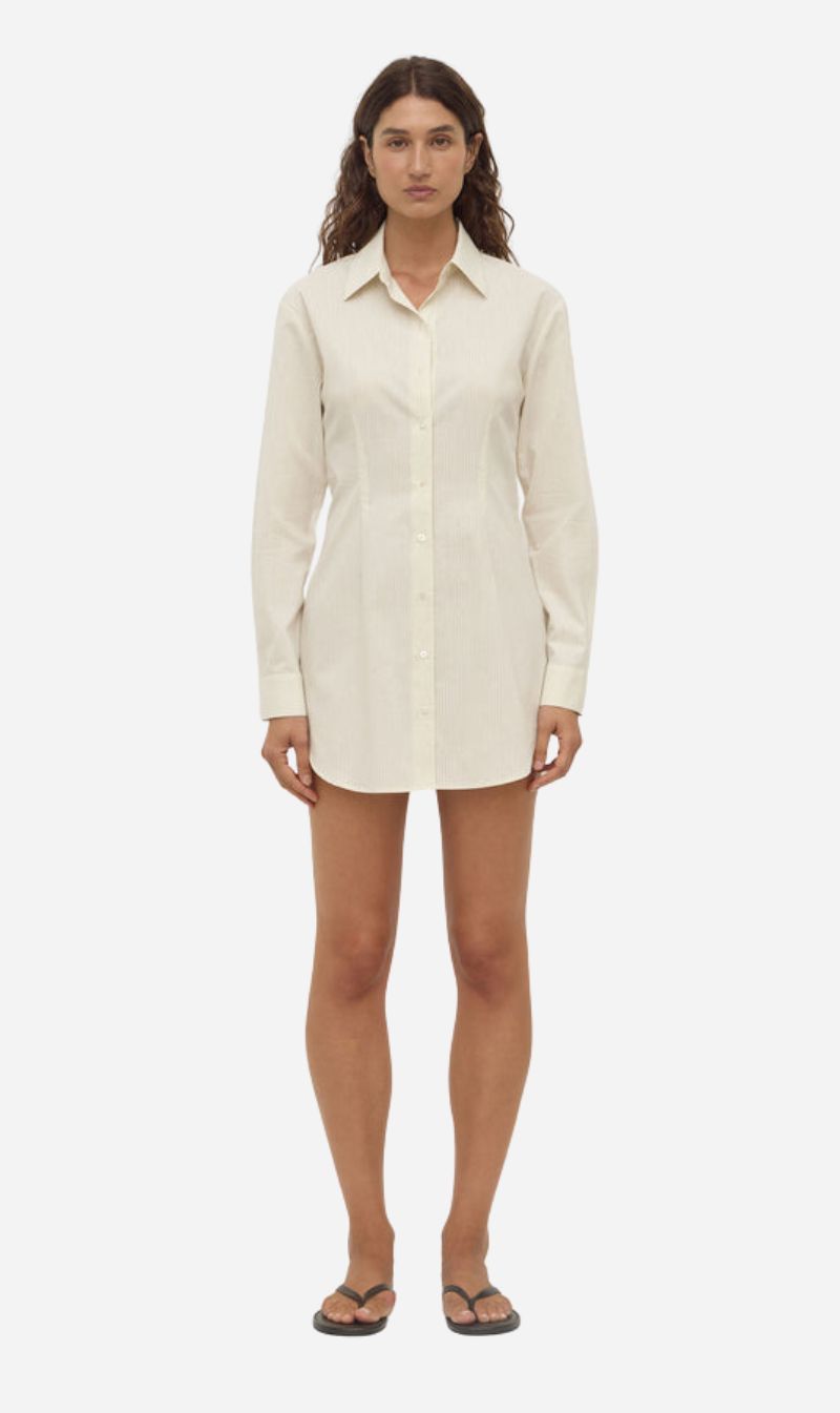 The Marina Stripe Mini Shirt Dress in white/grey stripe is a 100% cotton fitted dress with a double shirt collar and front and back darts.