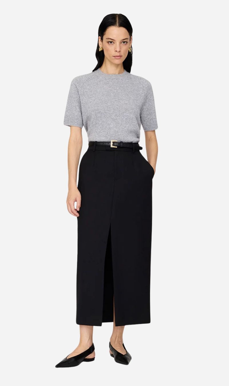 The Meredith Skirt is a sophisticated column skirt with a trouser-inspired waistband made from a midweight, textured wool suiting fabrication.