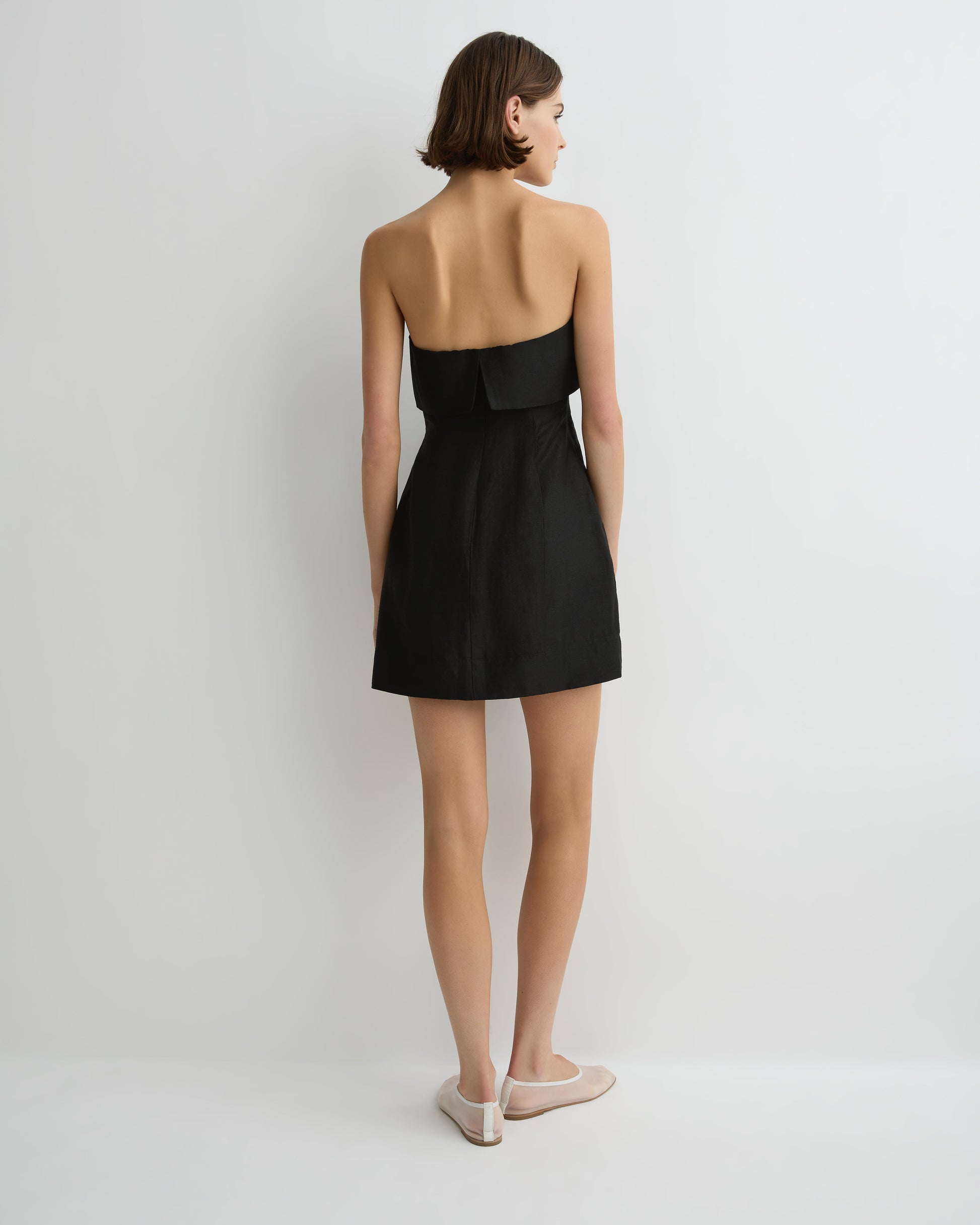 The Bormio Bandeau Mini Dress in Black is cut from a light, luxe, European organic linen blend with an elevated sheen. Perfect for evening and event dressing, this timeless mini has an in-built corset with boning at the side seams and silicon gripper tape on the front neckline, for support. The dress closes with an invisible zip at centre back and has elasticated edges across the back to maximise fit and comfort. Darts create a subtle A-line silhouette with a slight flare at the hem. The perfect, highly versatile little black mini dress for the quiet luxury wardrobe.