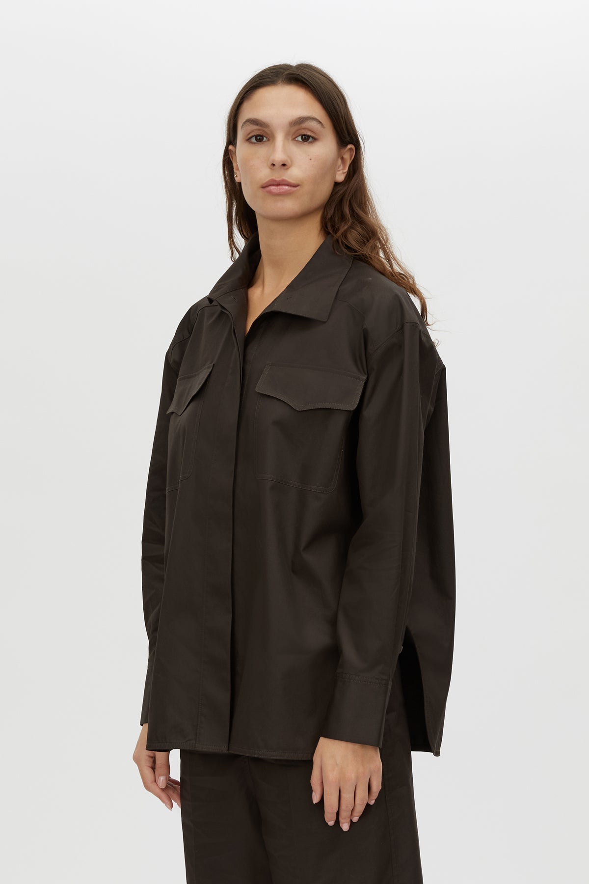 CAMILLA AND MARC Java funnel neck button-up long-sleeve shirt in espresso brown. Large front pockets with flaps. Concealed corozo button placket at centre front and sleeves.