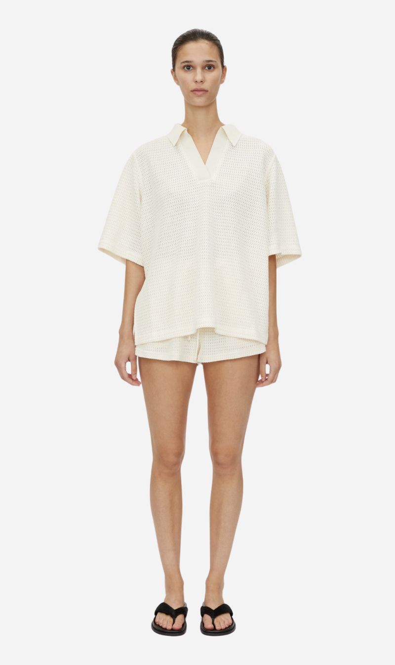 CAMILLA AND MARC Turrell oversized textured tee in white with trophy rib collar. Wide short sleeves, side splits.