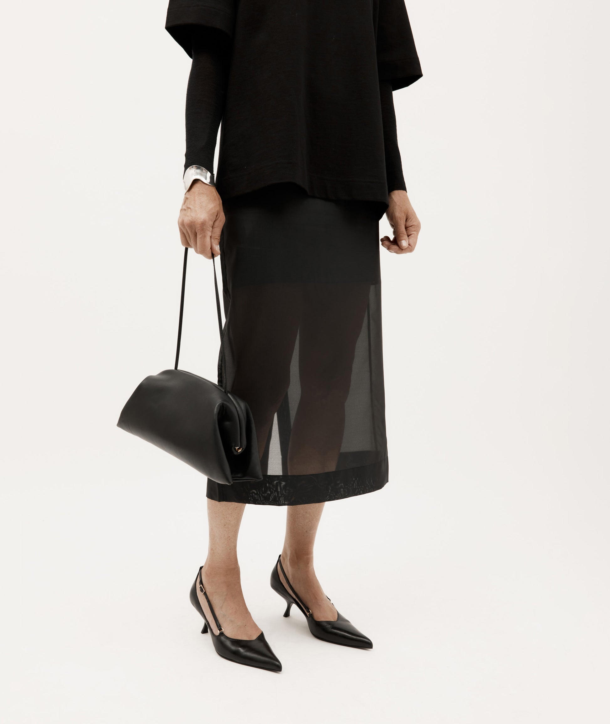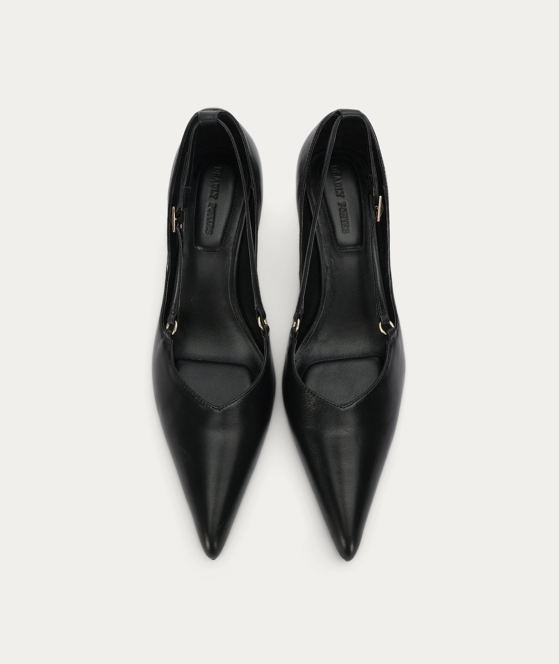 The chic Epona Heel in Java Eel is crafted from LWG-certified Lamb Nappa. It features a pointed toe, tapered heel, leather strap with buckle closure, and padded fixed insole.