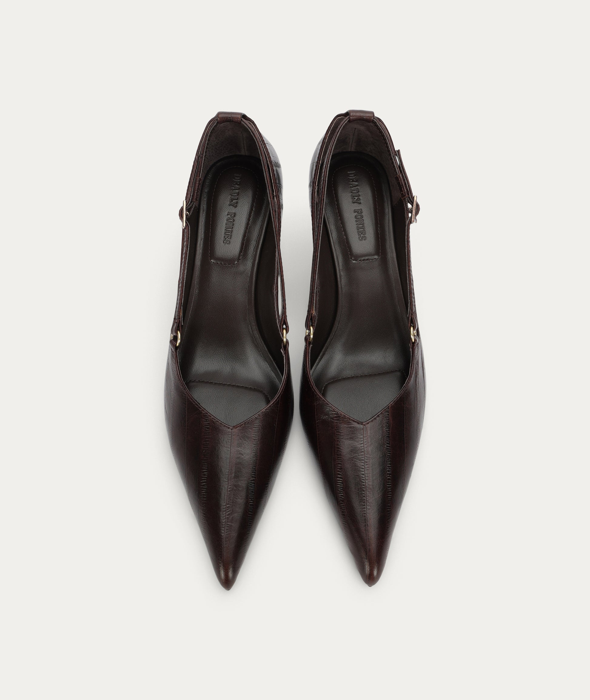 The chic Epona Heel in Java Eel is crafted from LWG-certified Eel-embossed Calf Leather. It features a pointed toe, tapered heel, leather strap with buckle closure, and padded fixed insole.