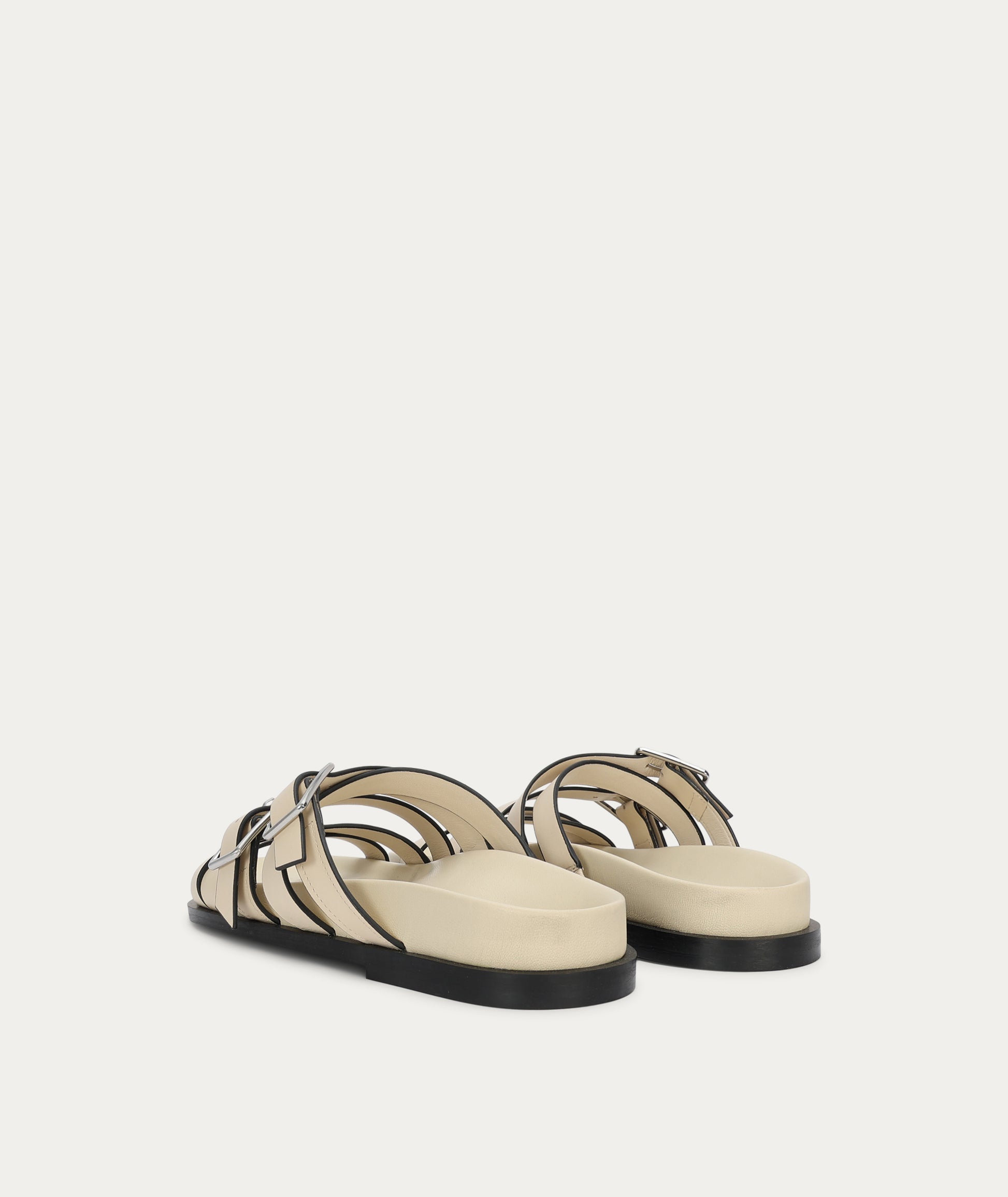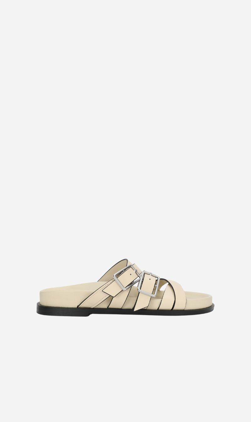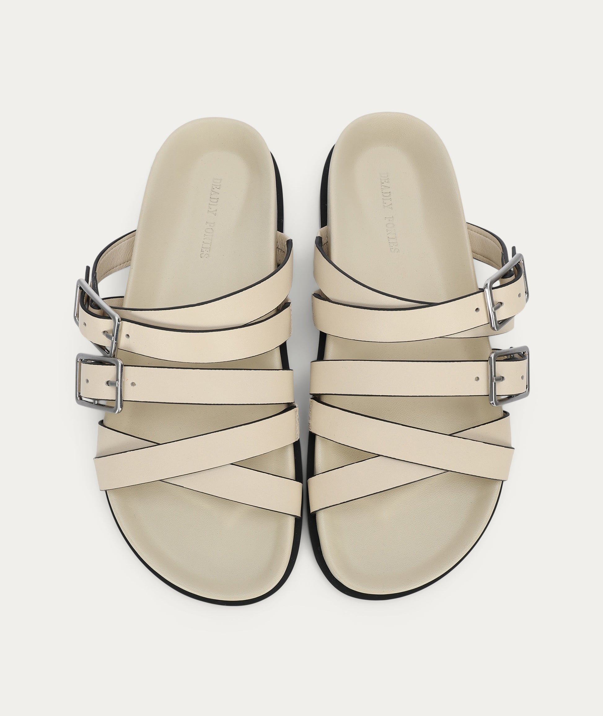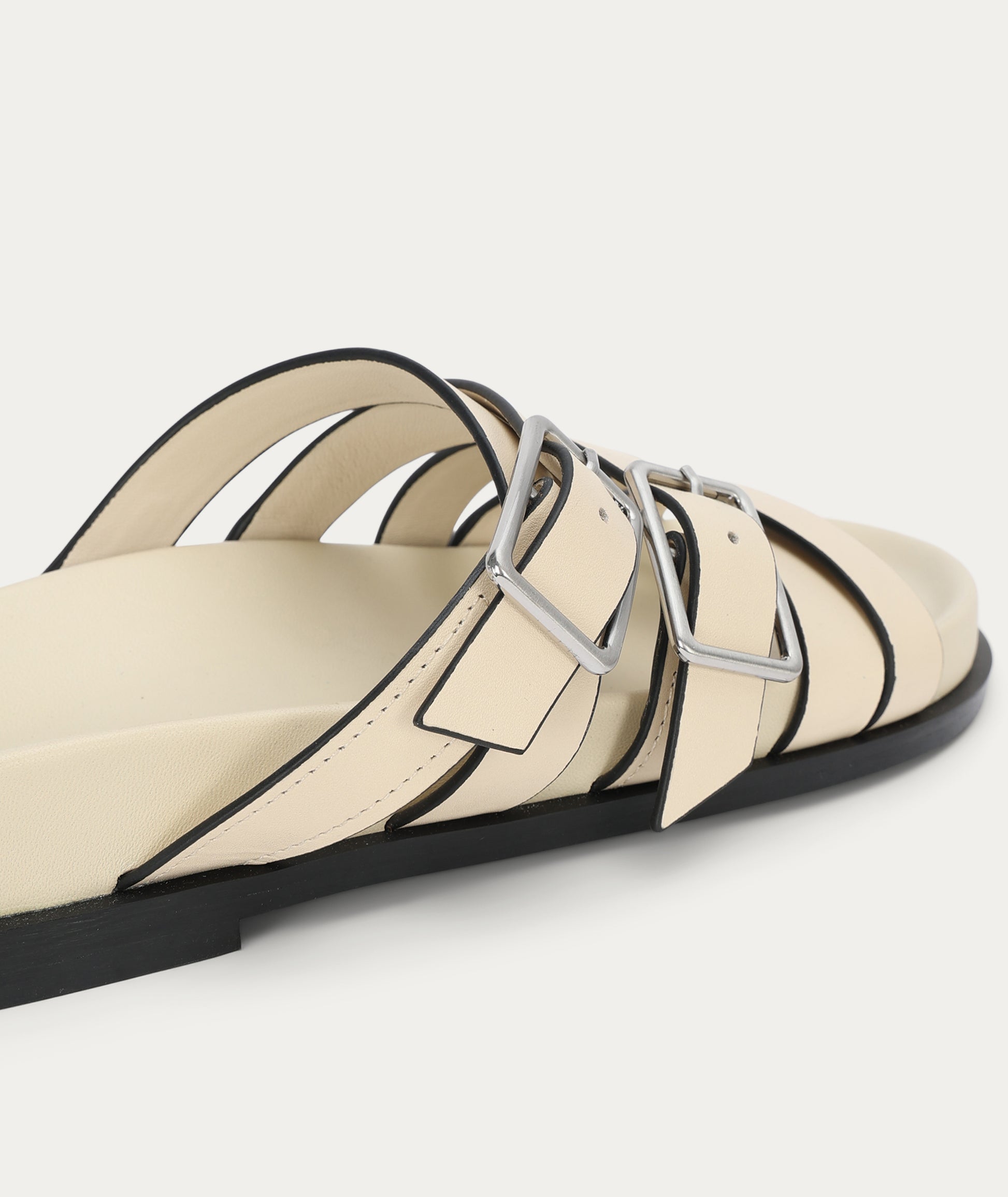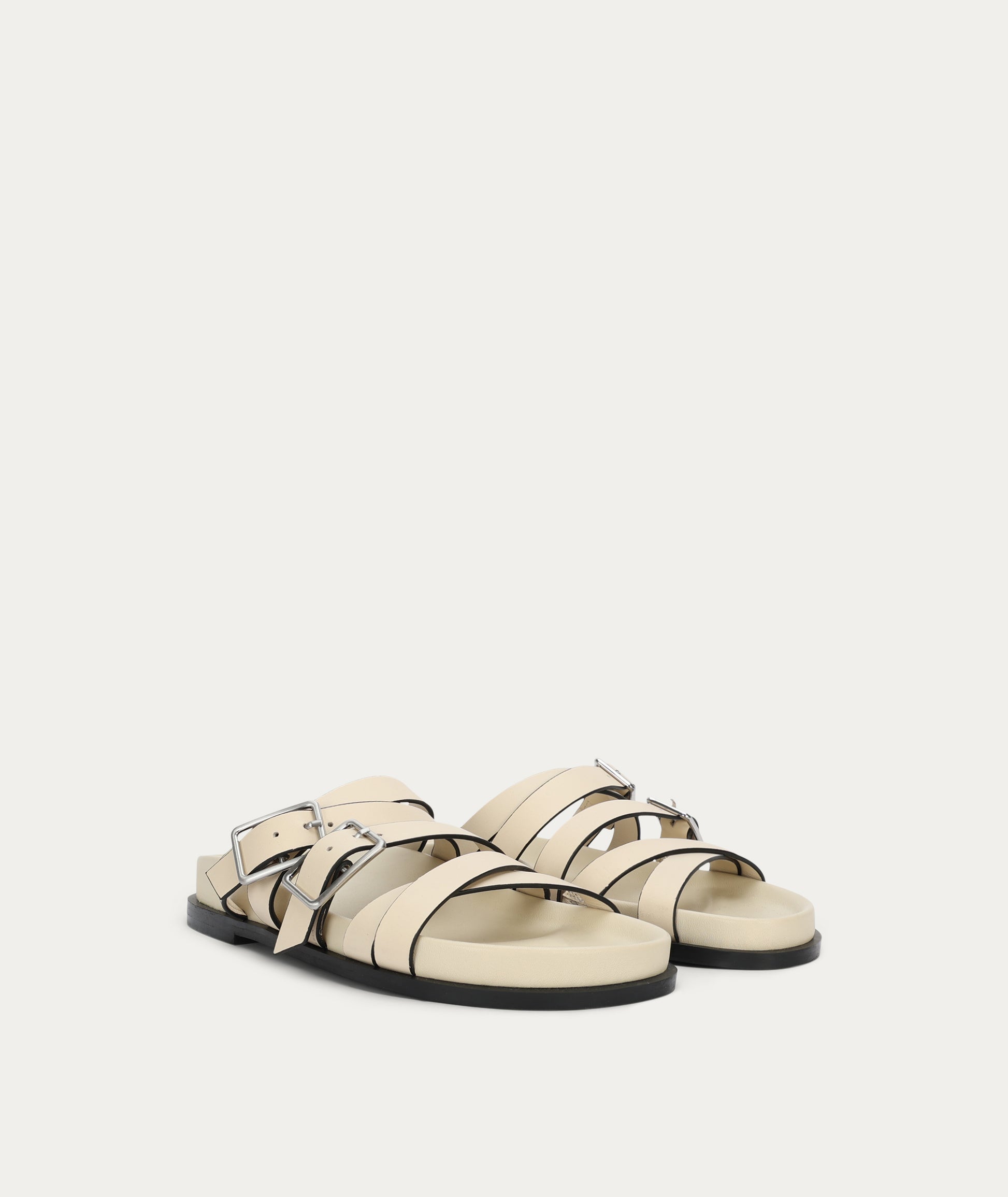 Gemini Slide pairs a buckle-strap upper with a moulded footbed wrapped in soft Lamb Nappa for lasting comfort. Crafted from supple Calf Nappa and set on a durable rubber sole, this slide features a subtle 5mm heel, making it an effortless everyday essential.