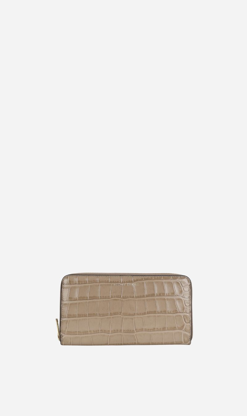 Maxi Wallet combines timeless design with generous storage, featuring twelve card slots, a zip coin purse, two large gusseted cash compartments, and two hidden cash pockets. Crafted from textural Croc-embossed Calf Leather in Oat.