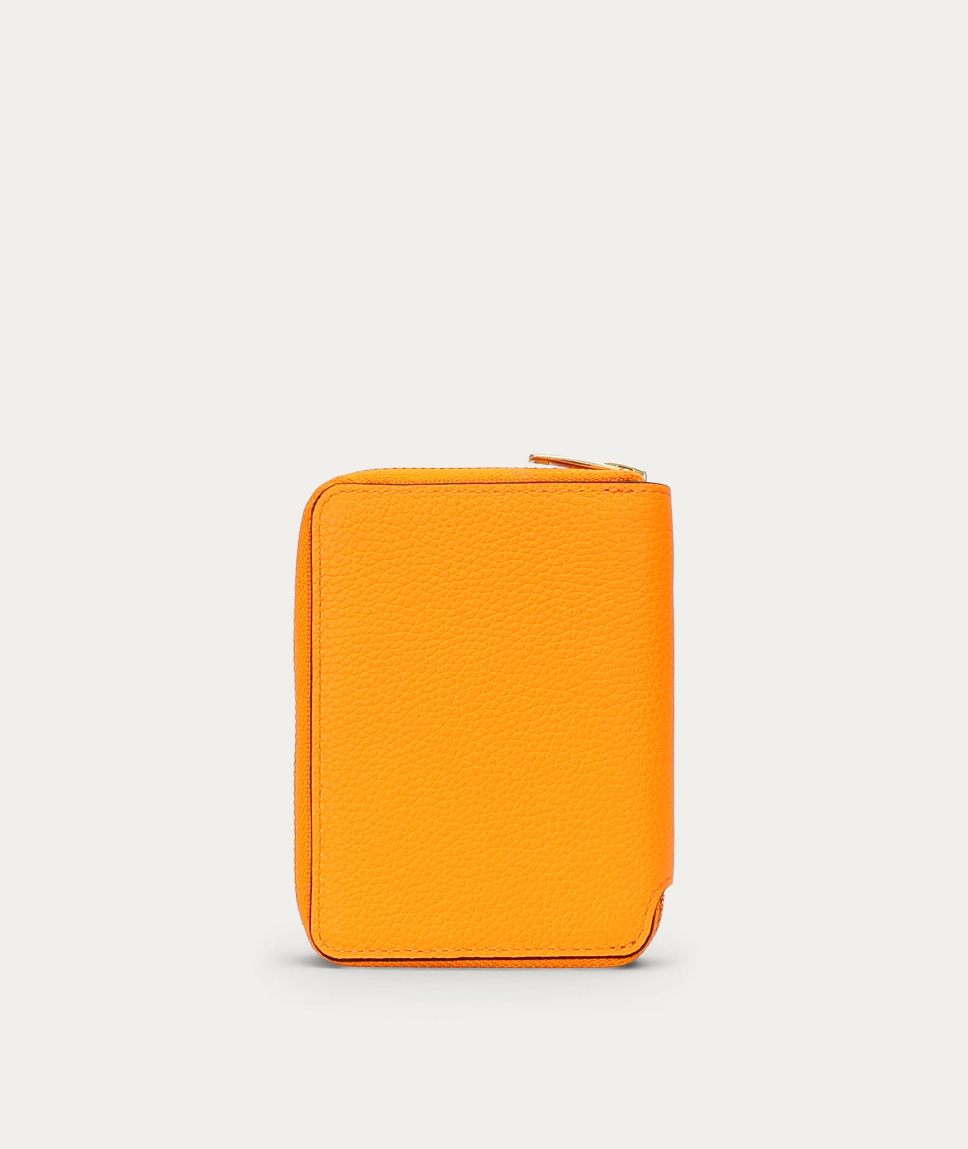 Mini Wallet in Marmalade is crafted from textured grained Calf Leather. Slimline yet functional, it features a brass zip closure and offers five card slots, two cash compartments, and a domed coin pocket to keep your essentials secure.