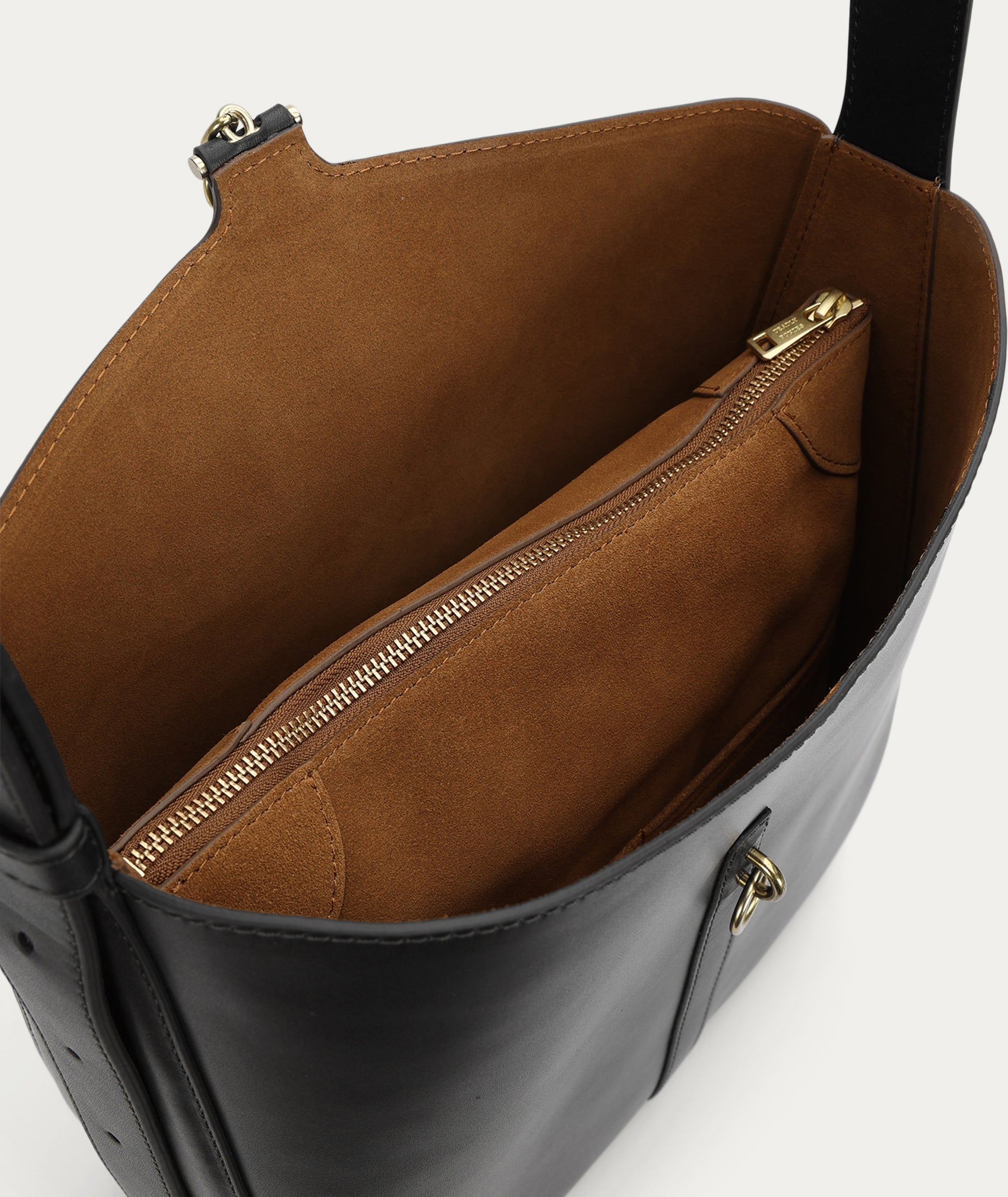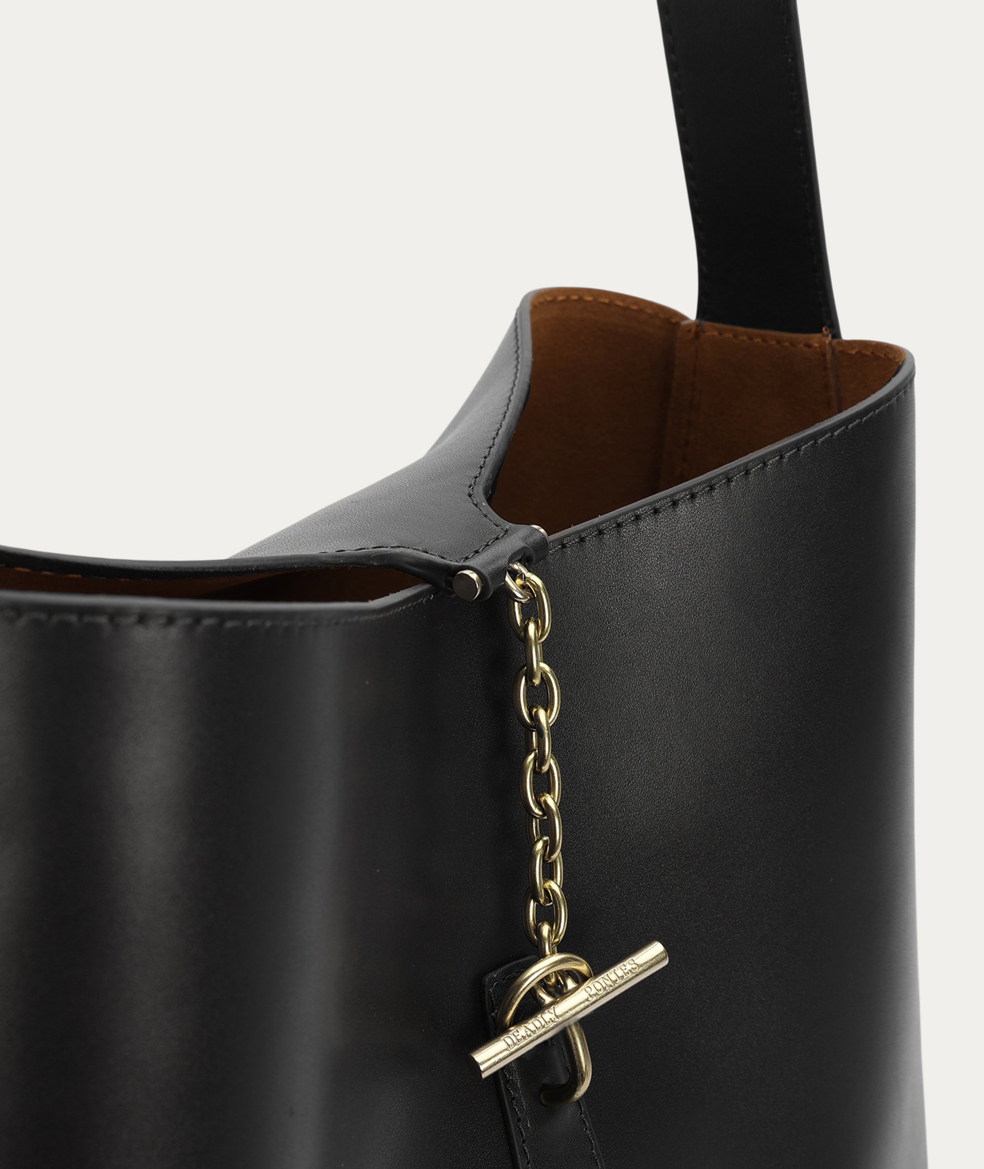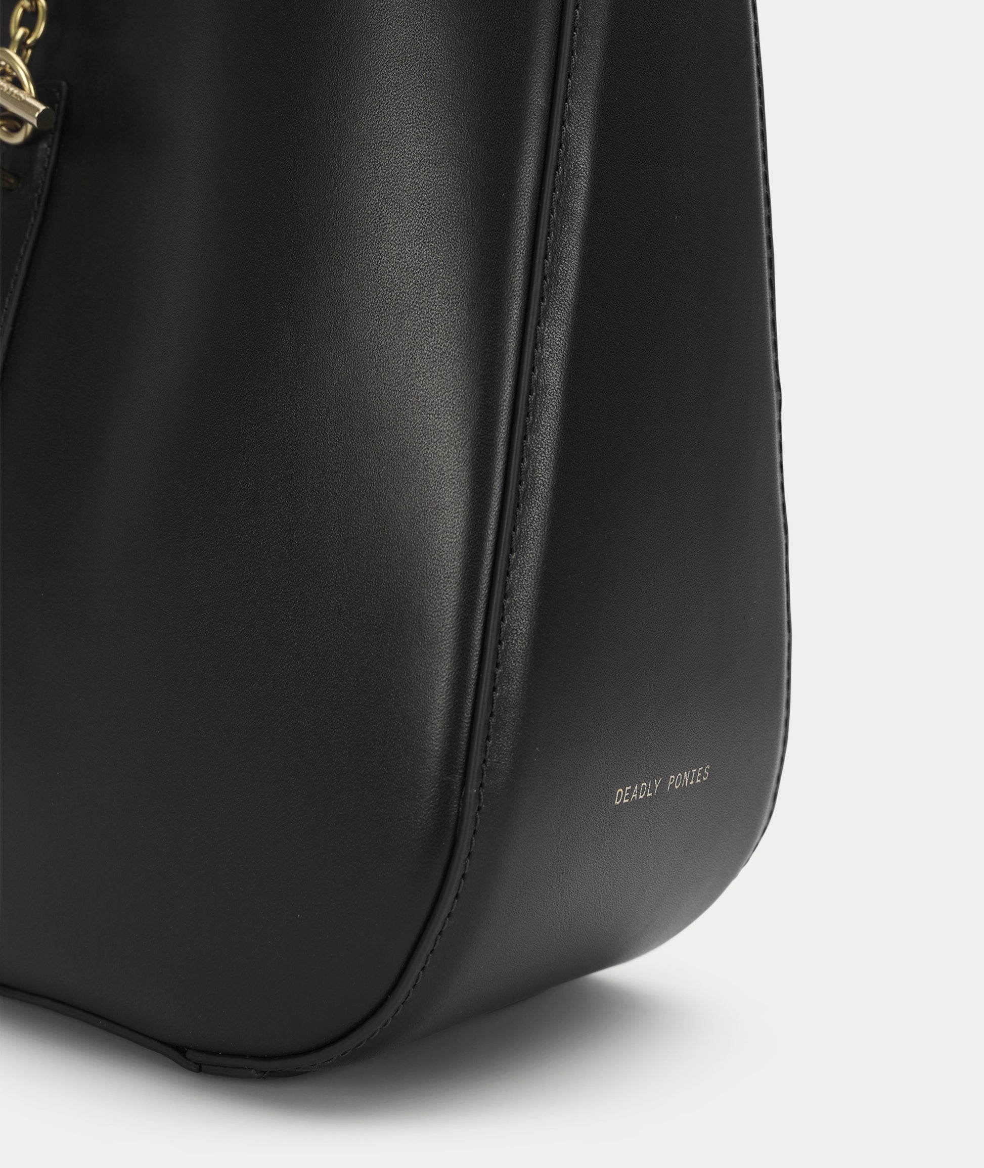 The Deadly Ponies Mr Foldabit in Black is a structured tote crafted from Ironed Calf Nappa, LWG-certified. He features a chain and T-bar closure, an adjustable strap with a distinctive buckle, and a velvety suede interior with a detachable zip pouch.
