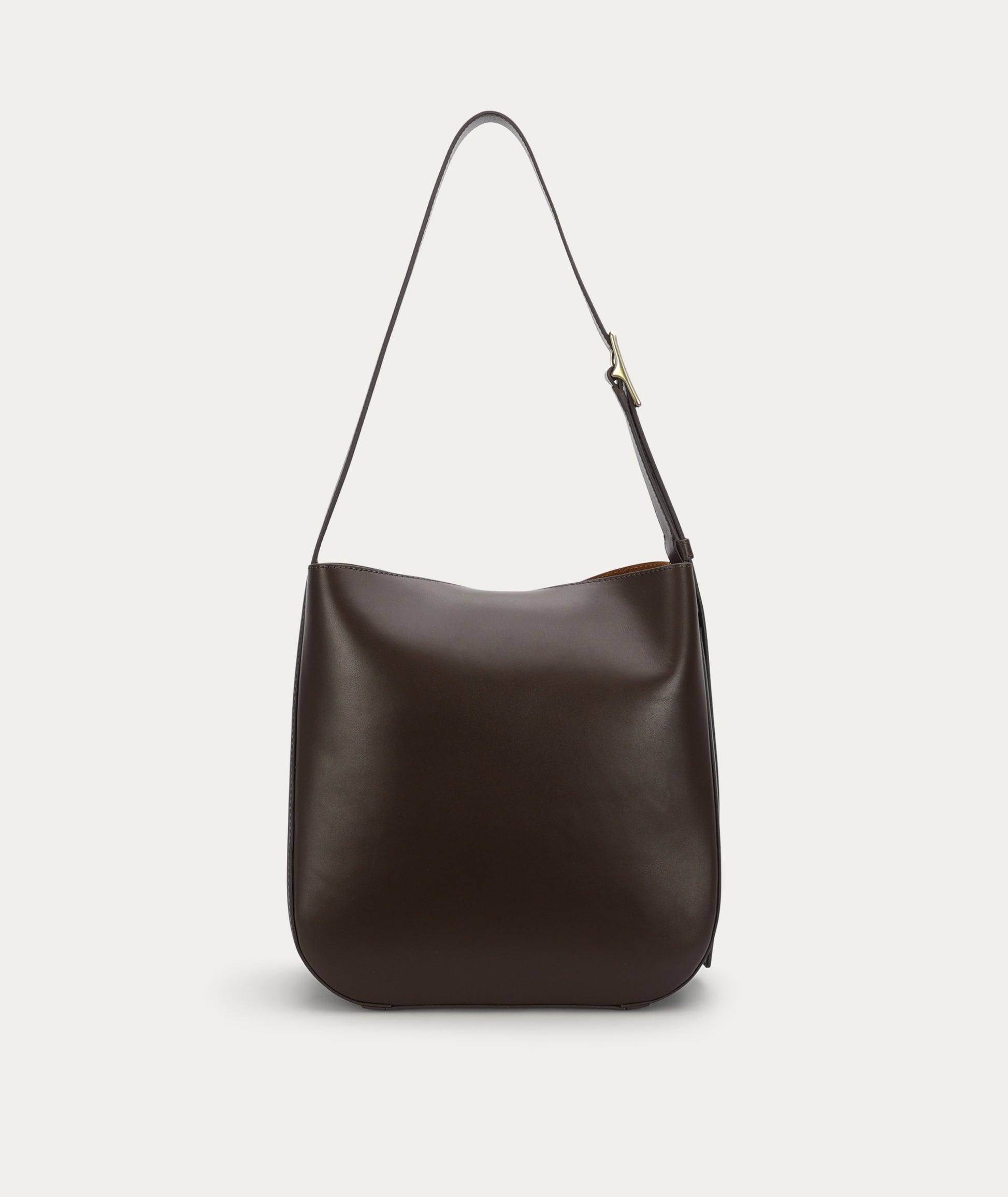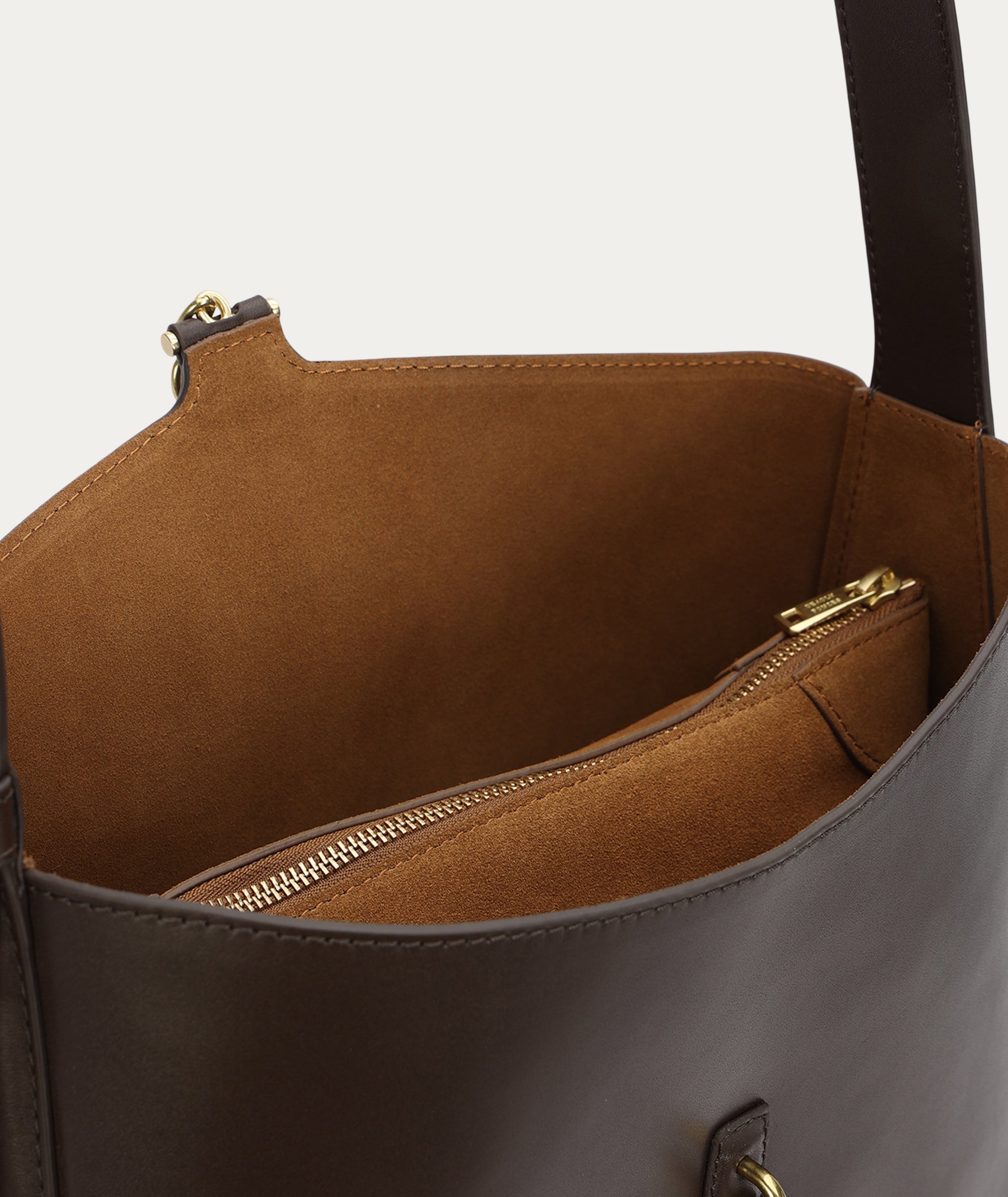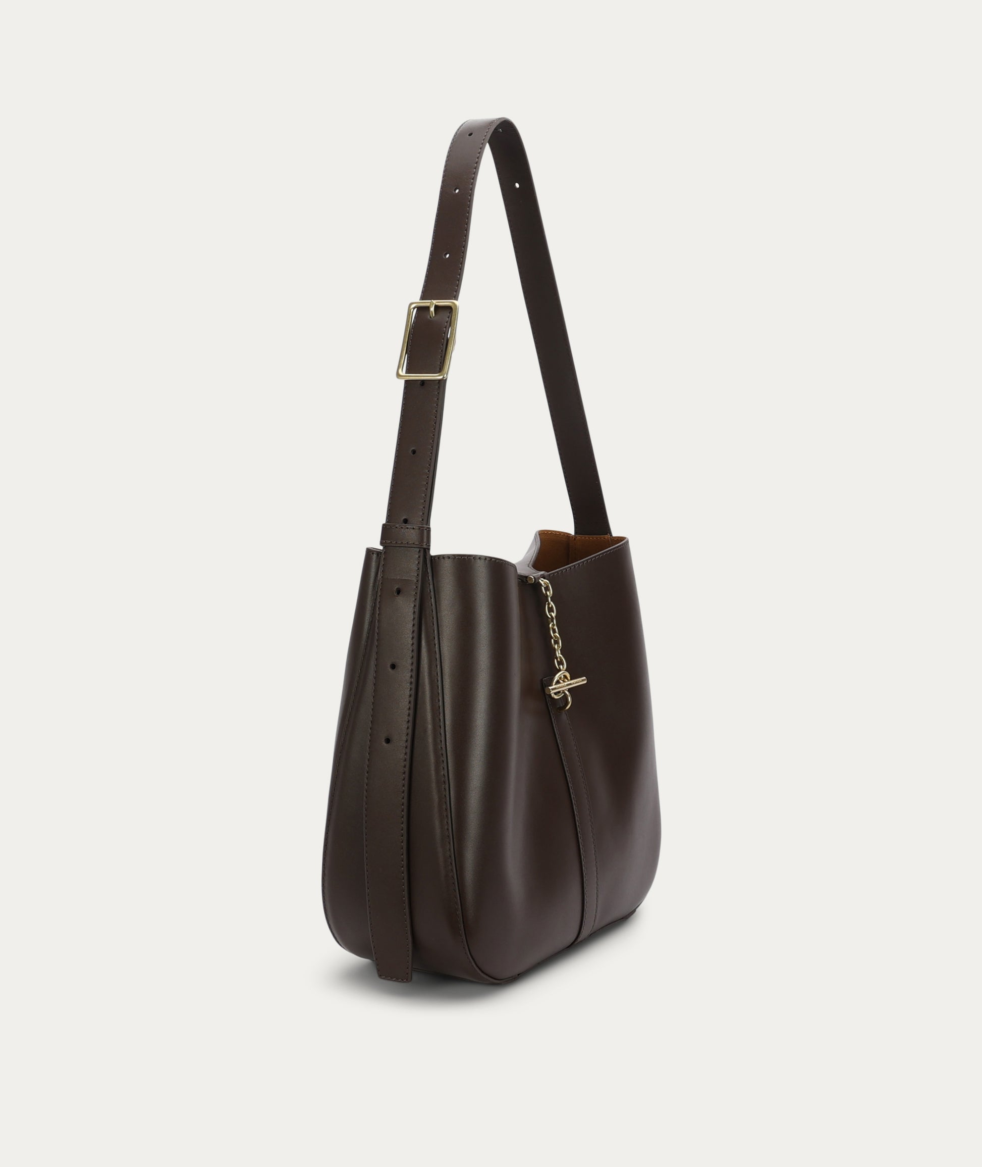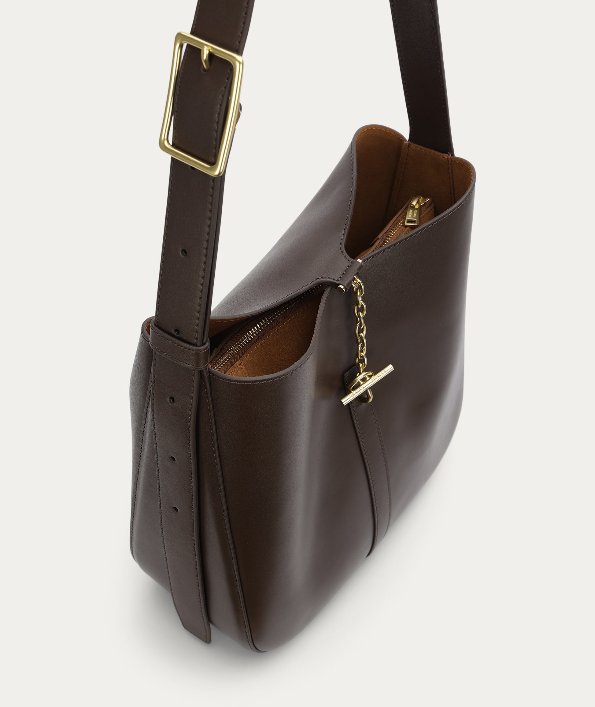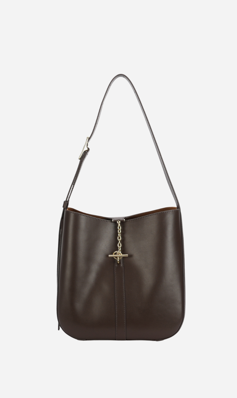 The Deadly Ponies Mr Foldabit in Java is a structured tote crafted from Ironed Calf Nappa, LWG-certified. He features a chain and T-bar closure, an adjustable strap with a distinctive buckle, and a velvety suede interior with a detachable zip pouch.