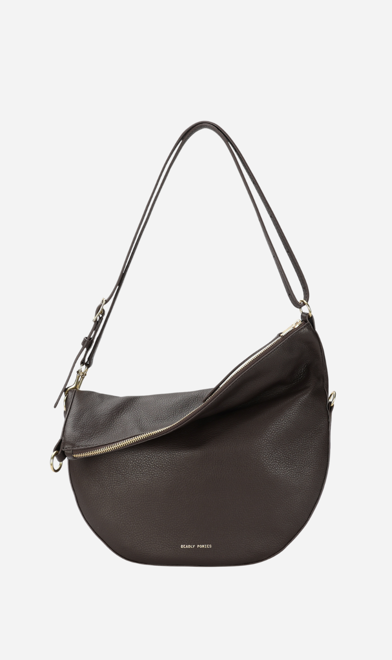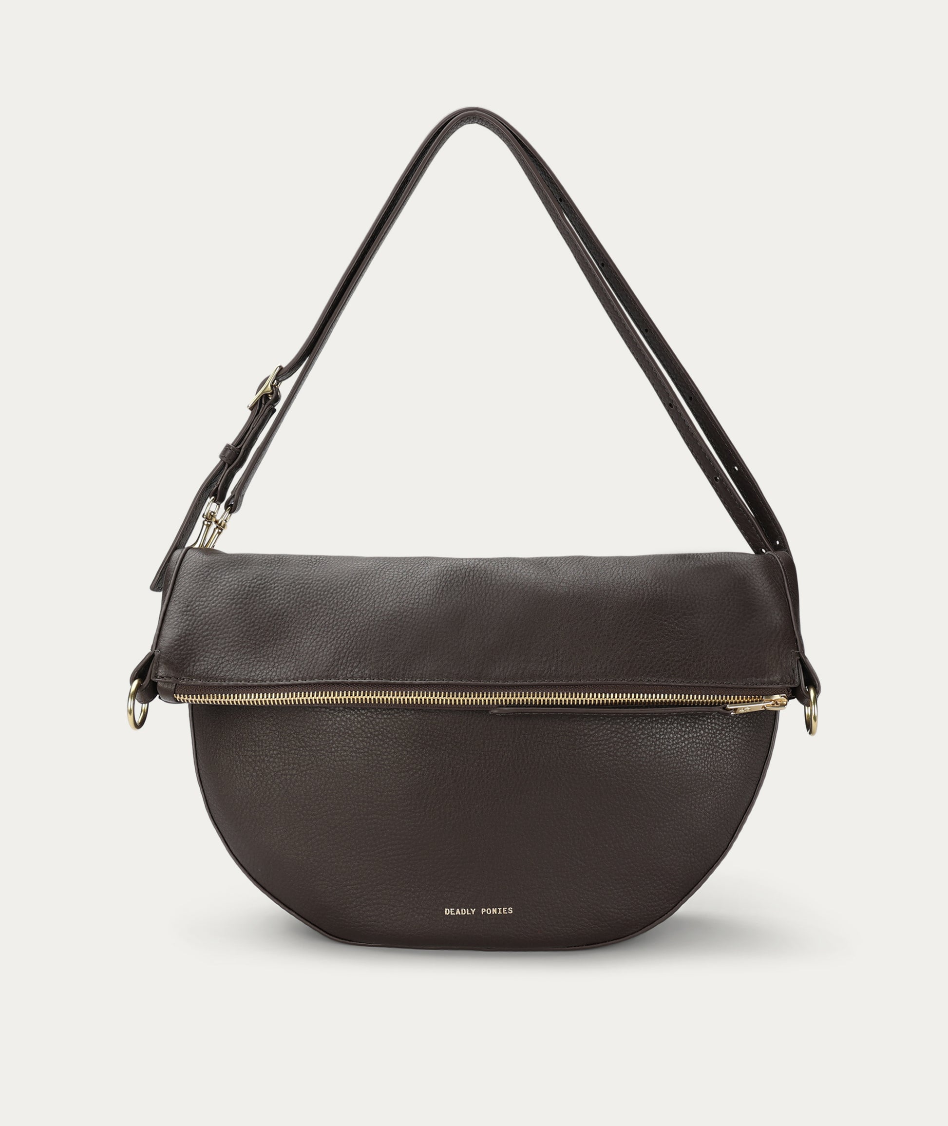 The Deadly Ponies Mr Leopard in Java is crafted from supple LWG-certified Calf Nappa. This versatile silhouette can be worn folded, asymmetrically, or fully extended as a sling. He offers seamless options for crossbody or shoulder wear.