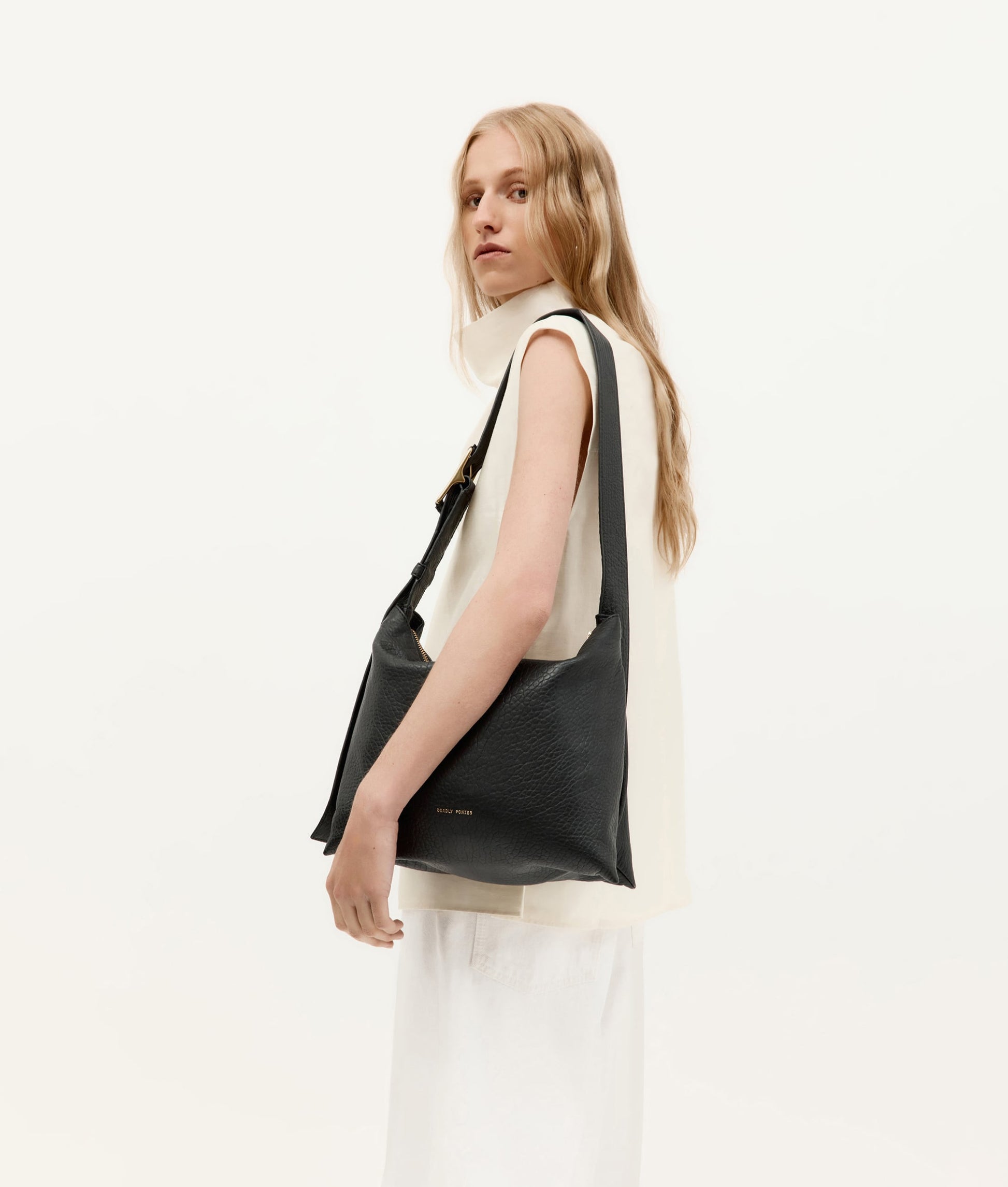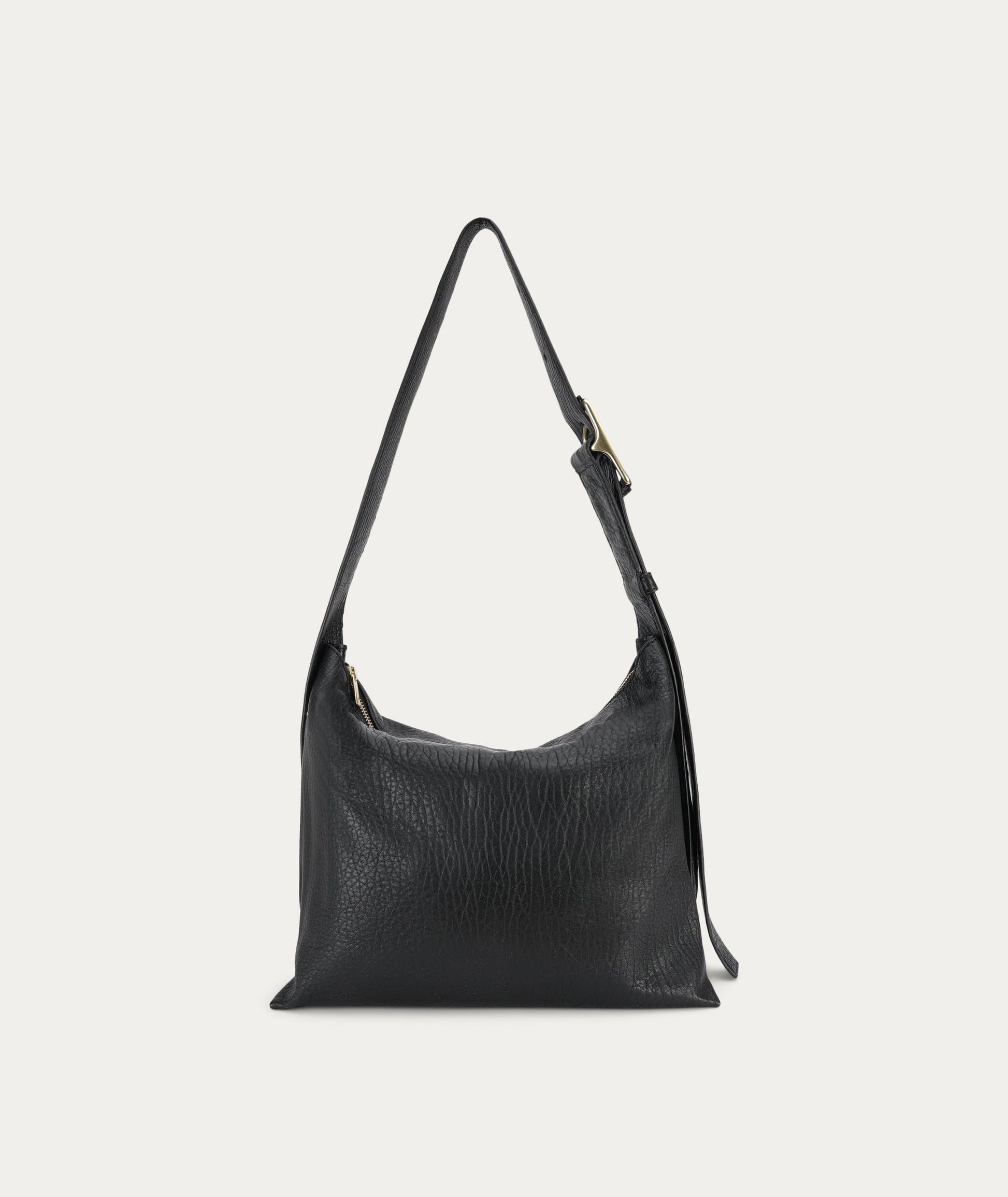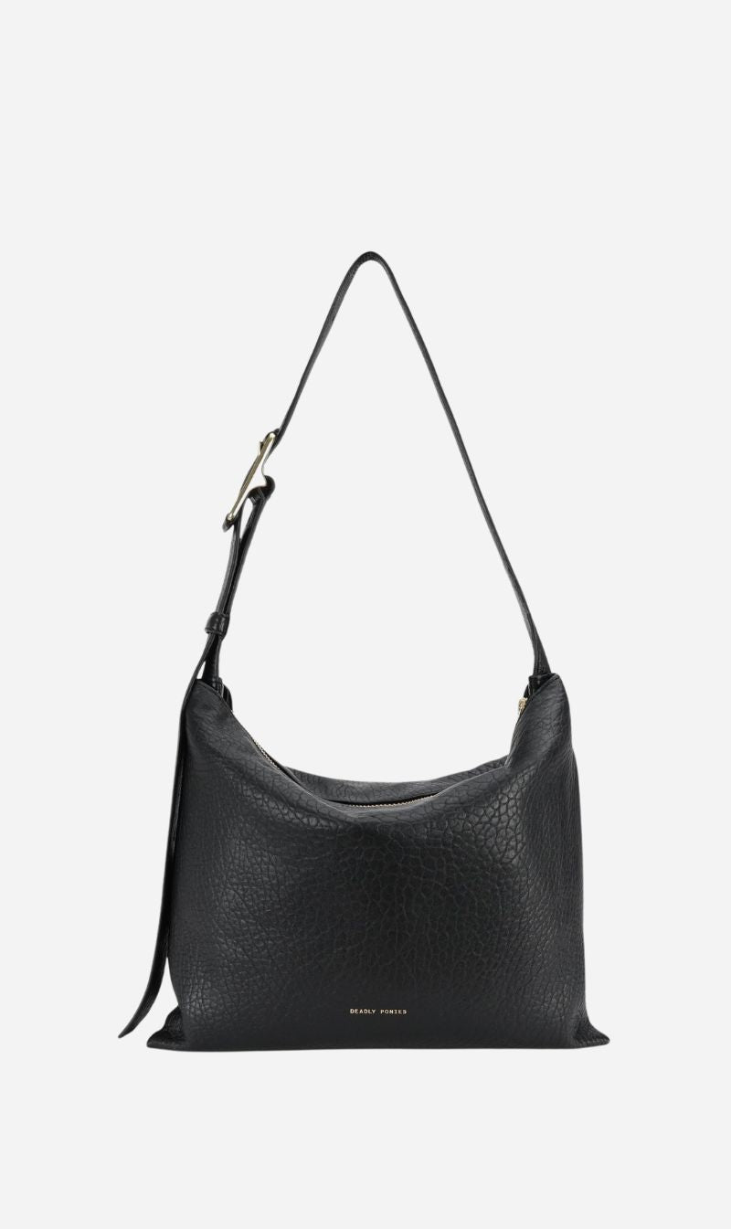The Deadly Ponies Mr Midimese in Black is crafted from signature LWG-certified Calf Nappa. This shoulder bag features a slouchy exterior, zip closure, adjustable strap, and a brass buckle. Inside, he offers two slip pockets, a zip pocket, and an internal key clip for added practicality.