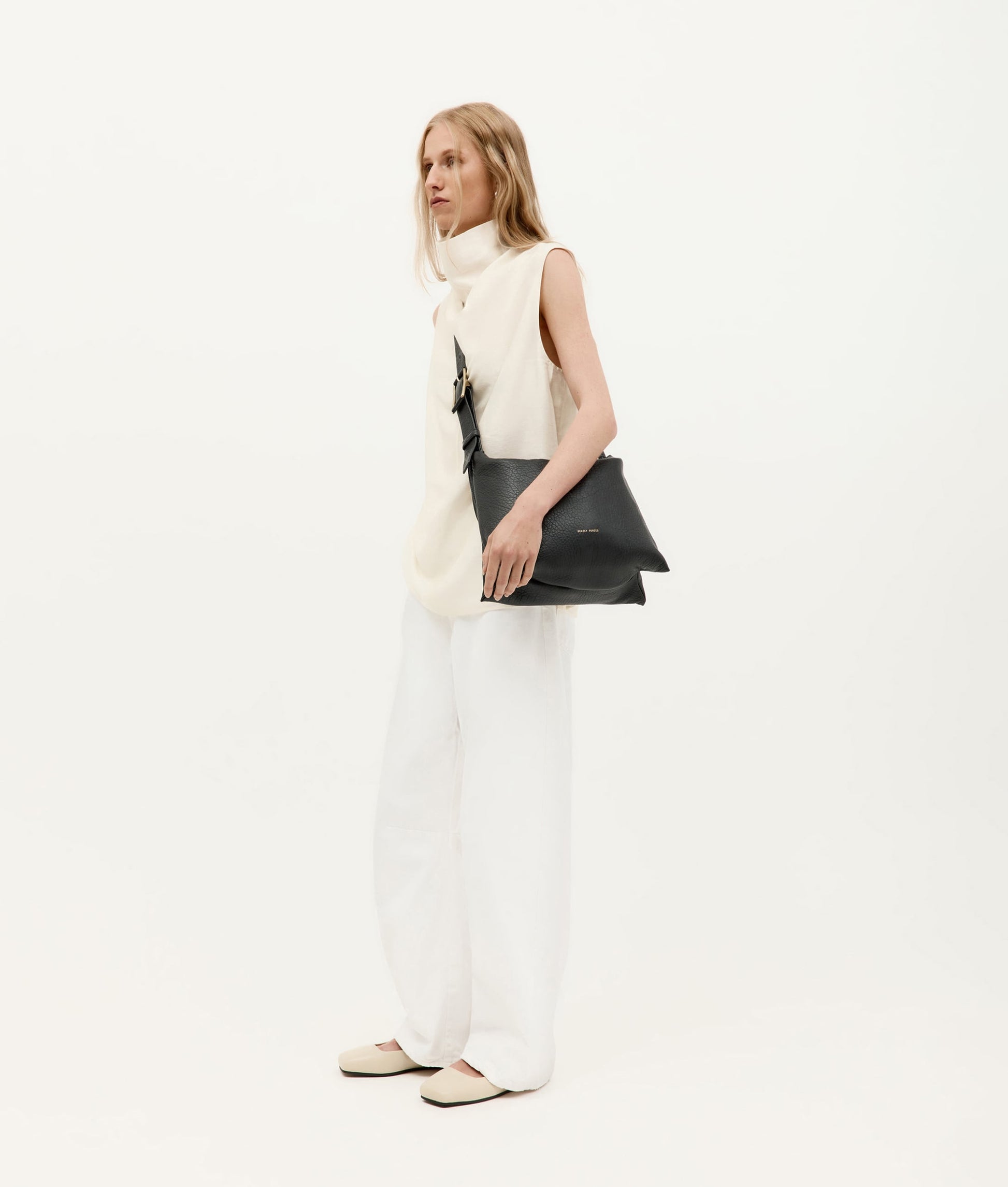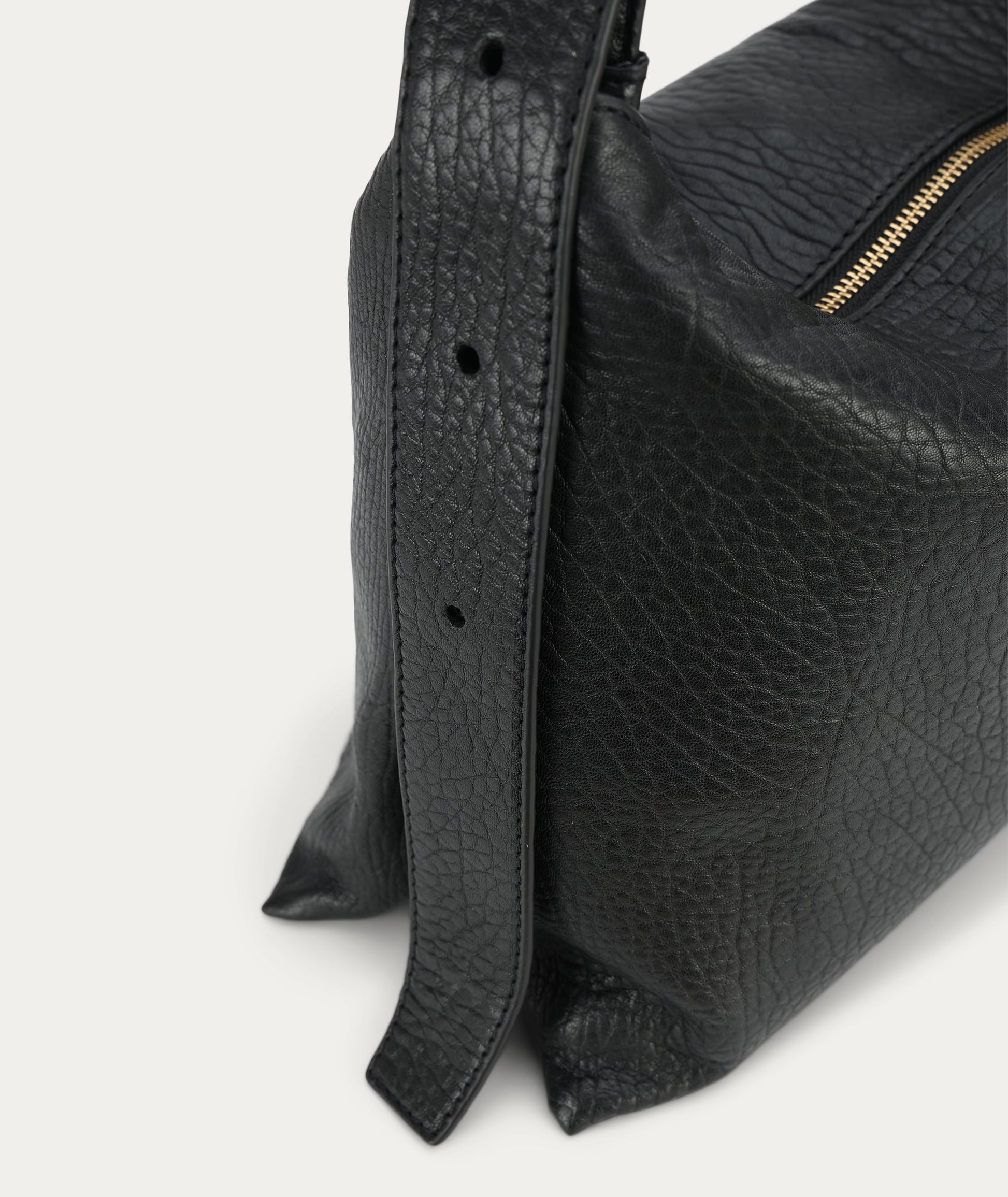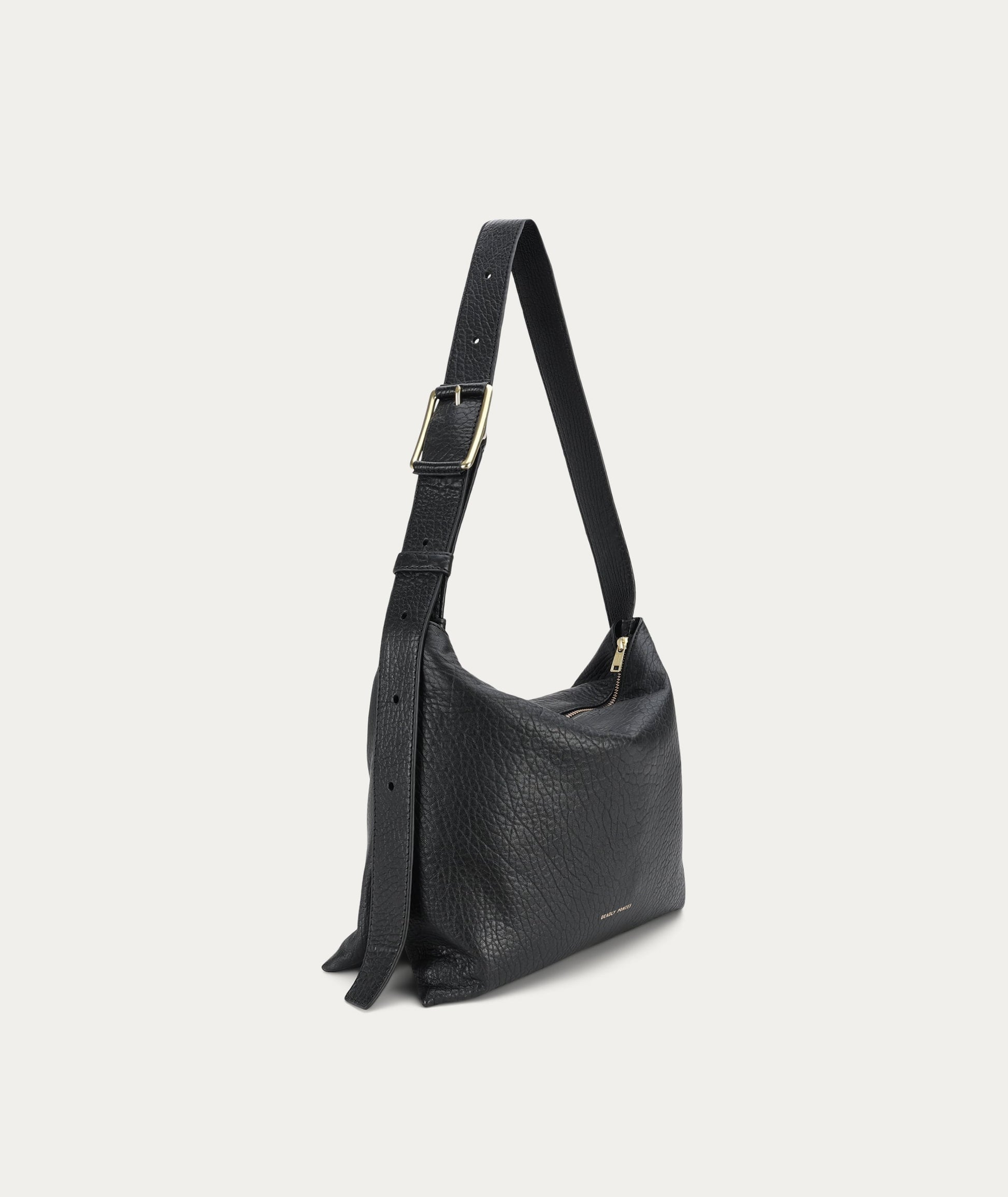 The Deadly Ponies Mr Midimese in Black is crafted from signature LWG-certified Calf Nappa. This shoulder bag features a slouchy exterior, zip closure, adjustable strap, and a brass buckle. Inside, he offers two slip pockets, a zip pocket, and an internal key clip for added practicality.