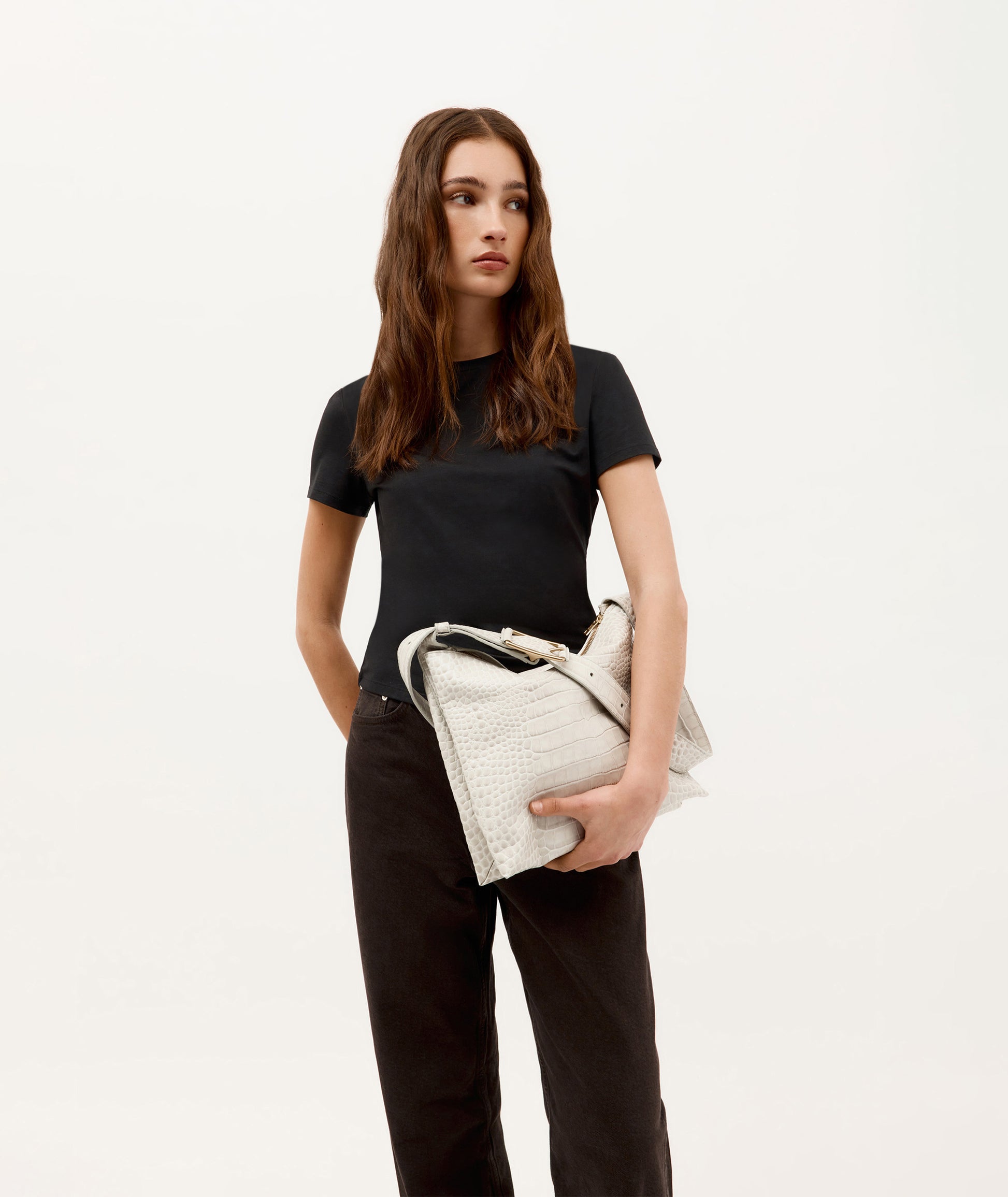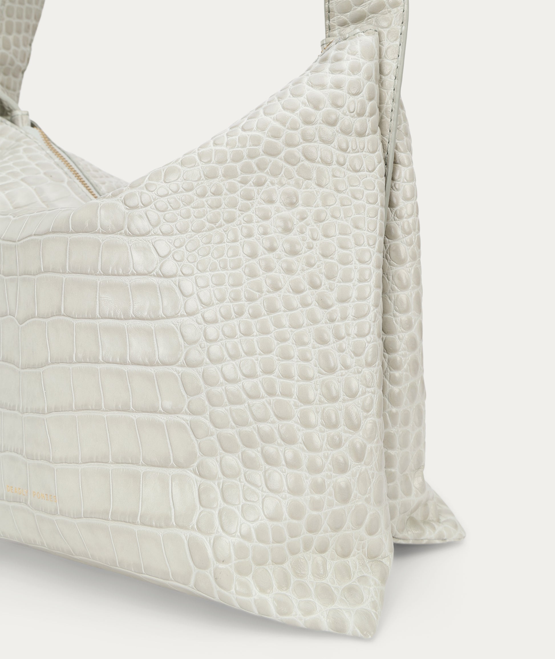 Croc Embossed Calf Leather, REACH Certified Cotton Lining, Brass Hardware.