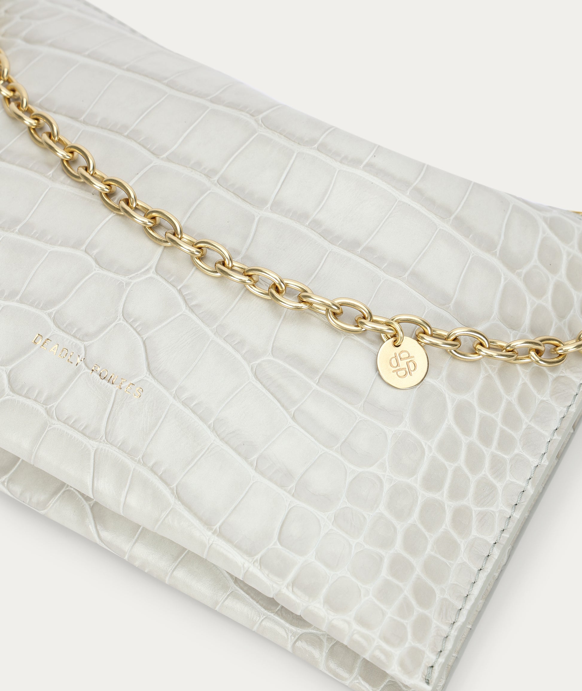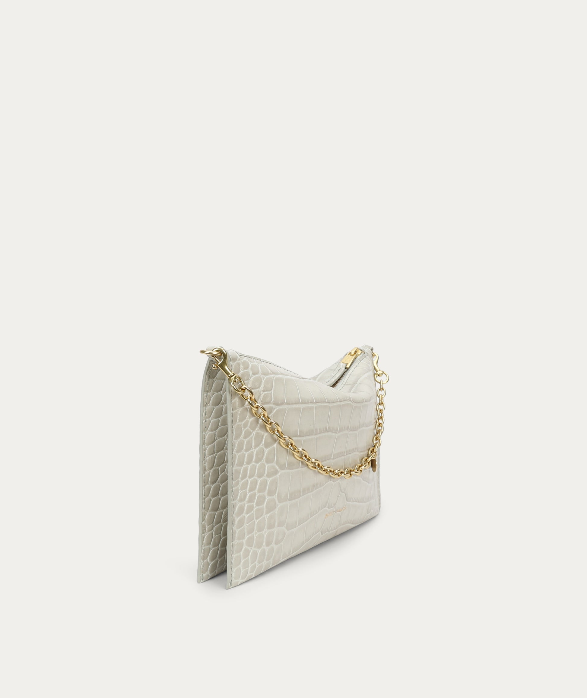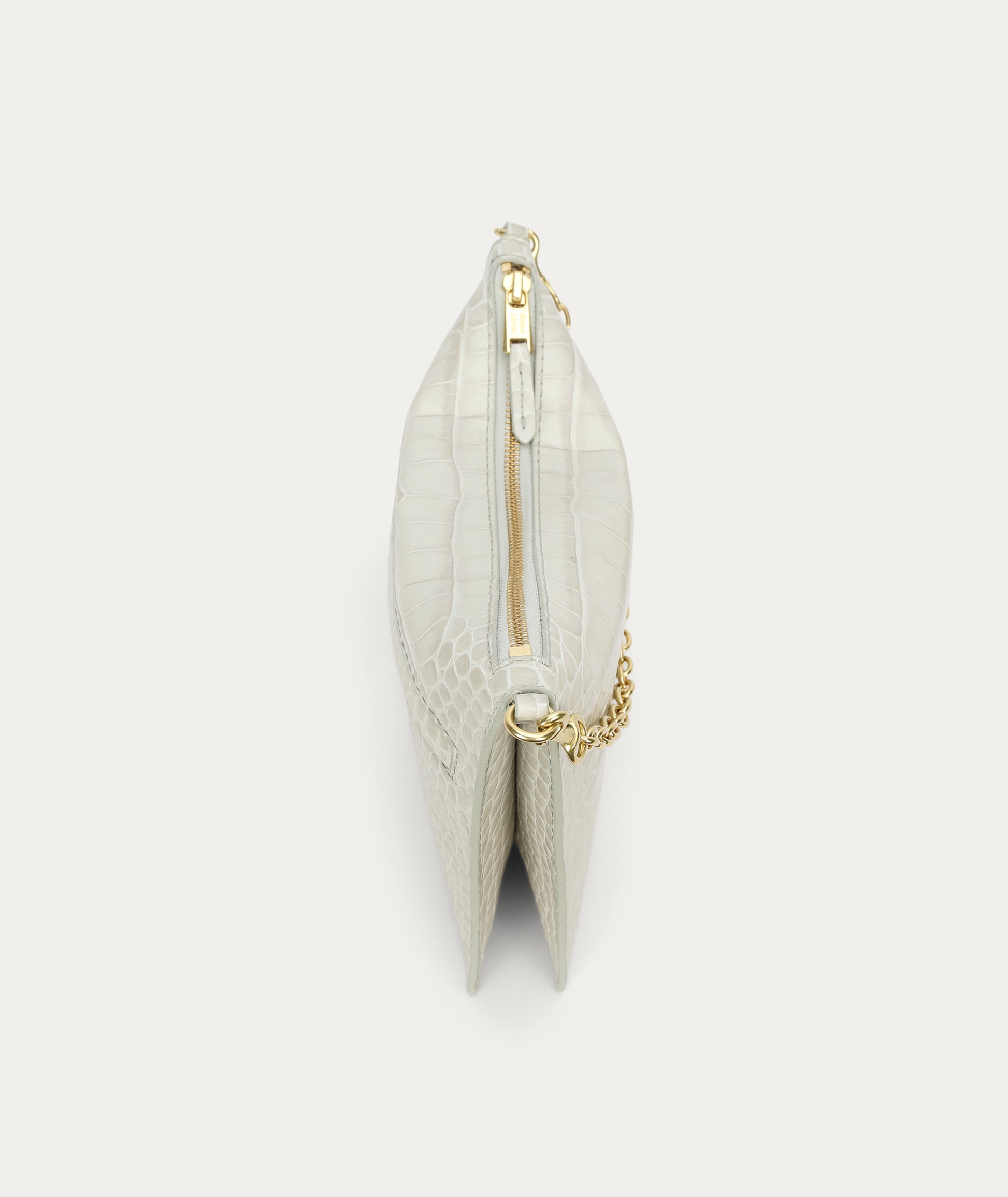 Intricately crafted from a single piece of croc-embossed Calf Leather in Kina, Mr Siamese is defined by a sleek, streamlined silhouette. With a detachable solid brass chain and adjustable strap, he transitions effortlessly from clutch to shoulder or crossbody wear.