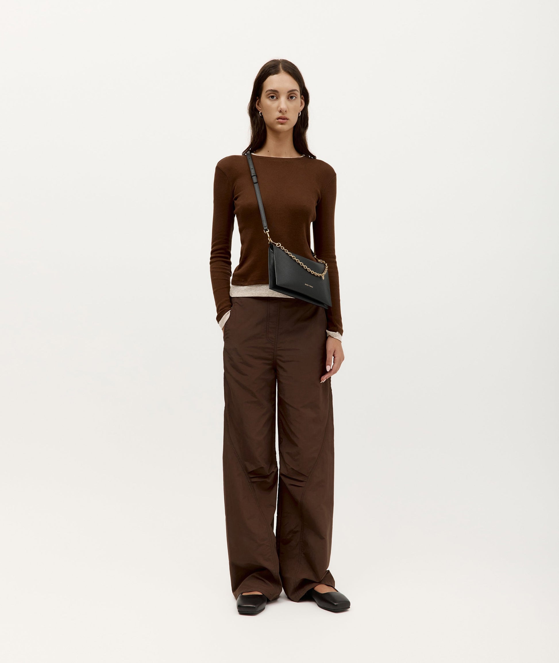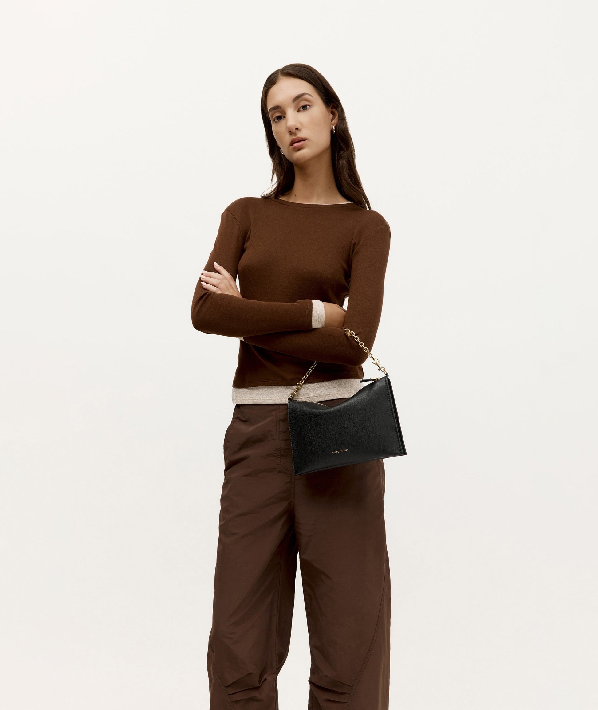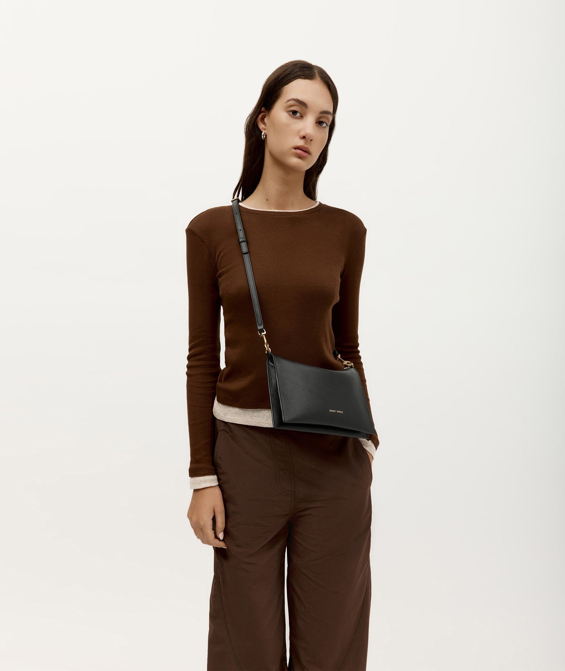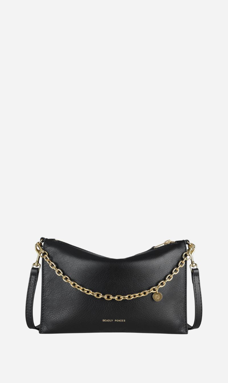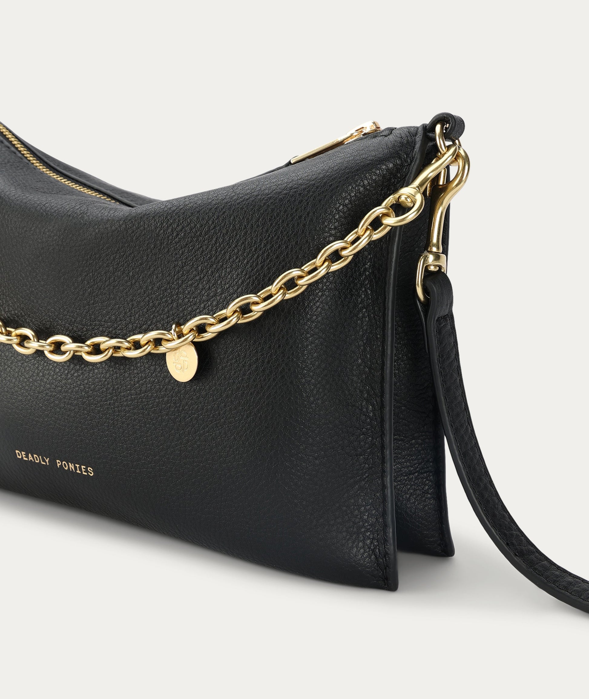 A Deadly Ponies favourite, Mr Siamese is intricately handcrafted with a single piece of buttery Calf Nappa in Black, folded to form his streamlined silhouette. Featuring a detachable, adjustable crossbody strap and a detachable front-facing brass chain; Mr Siamese can be worn as a clutch, on the shoulder, or as a crossbody.