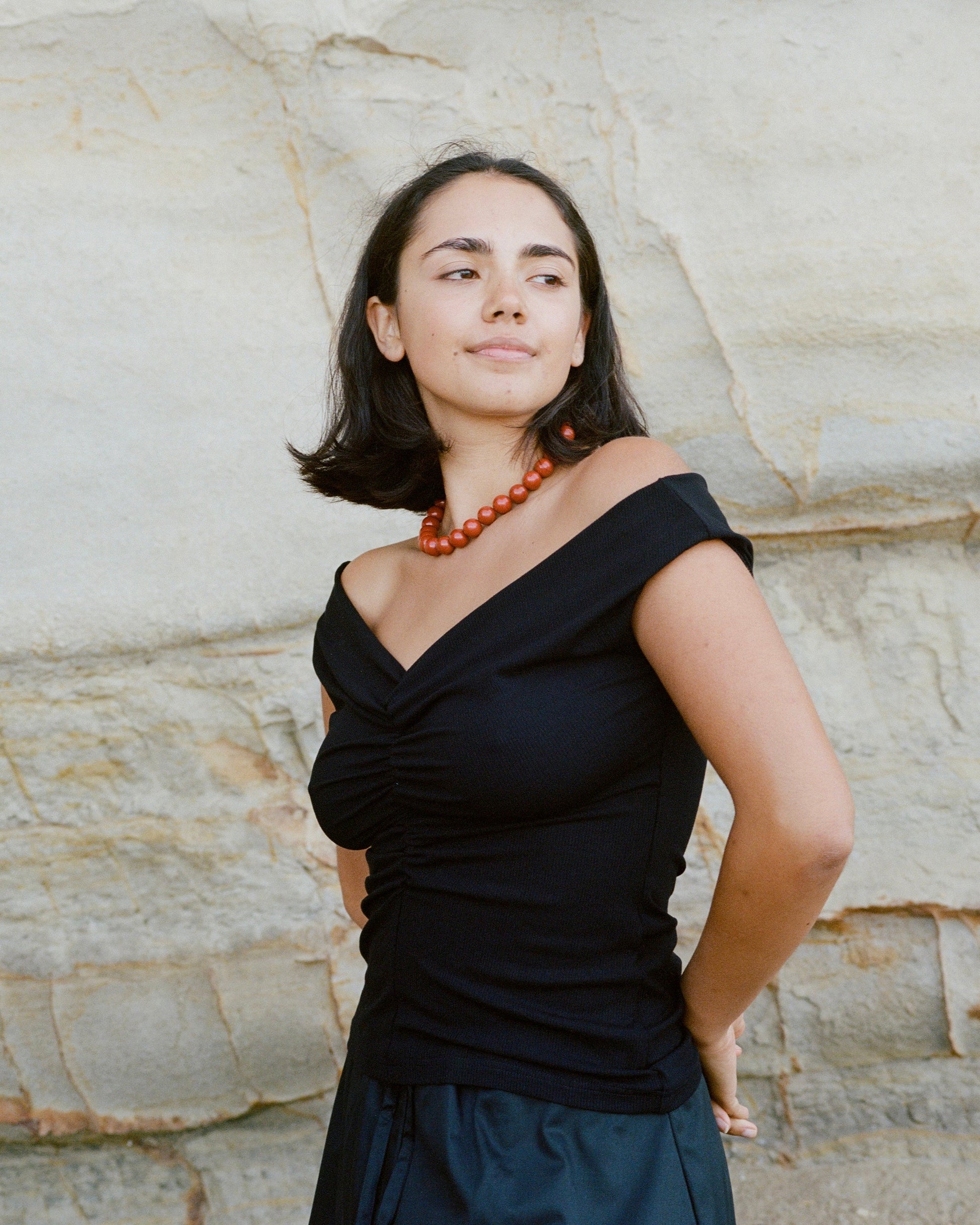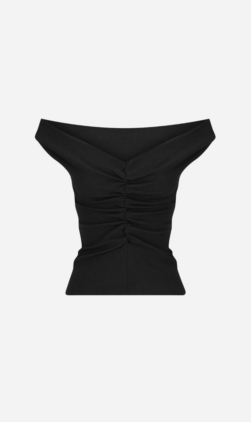 The Niveah Tee by Dominique Healy is a refined statement piece designed to elevate everyday styling. Sitting softly off the shoulder, this fitted silhouette features elasticated ruching through the front to create an elegant V neckline that highlights the décolletage. Crafted in a textured rib with comfortable stretch, it pairs effortlessly with denim, tailored trousers, or skirts for versatile wear.