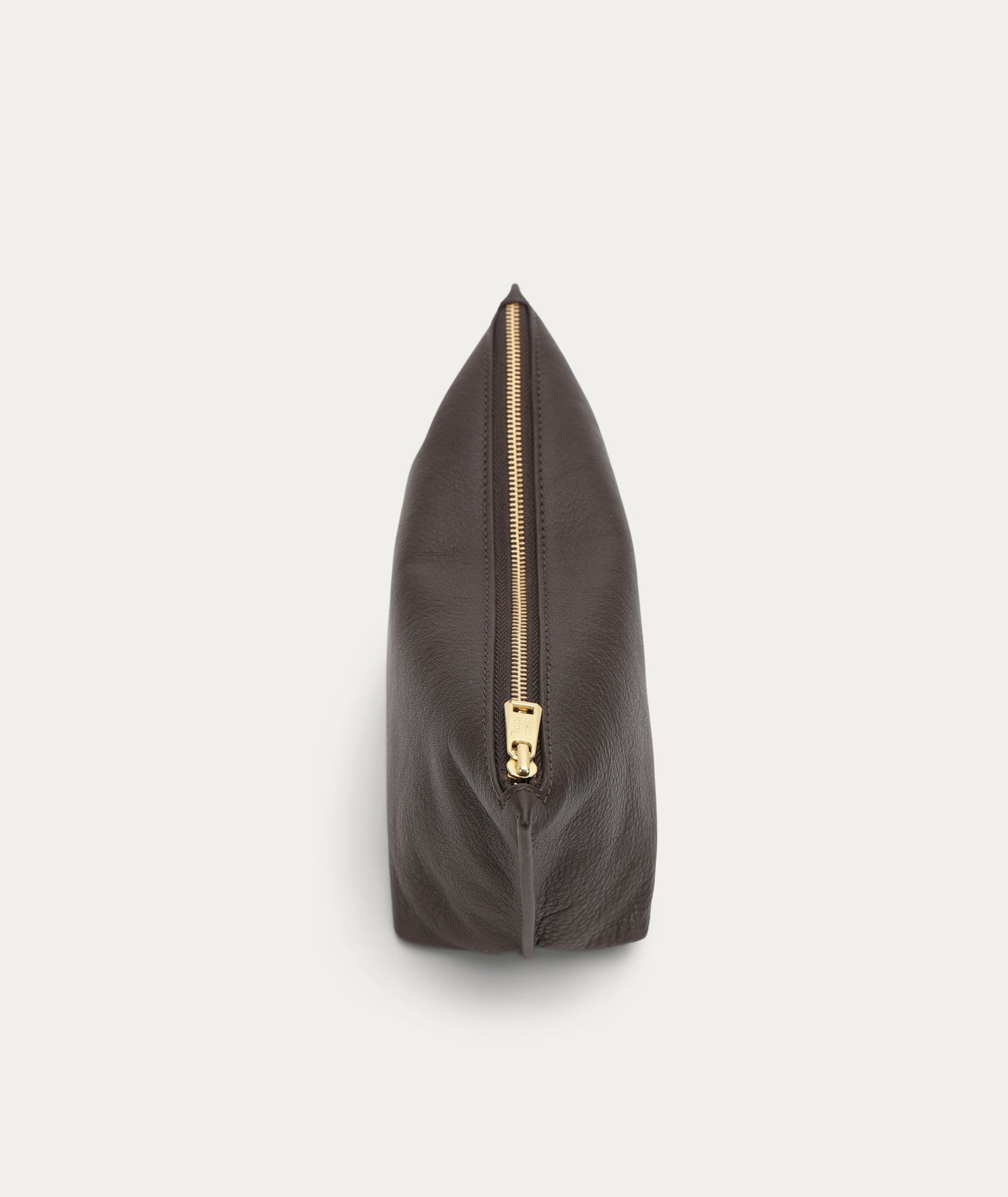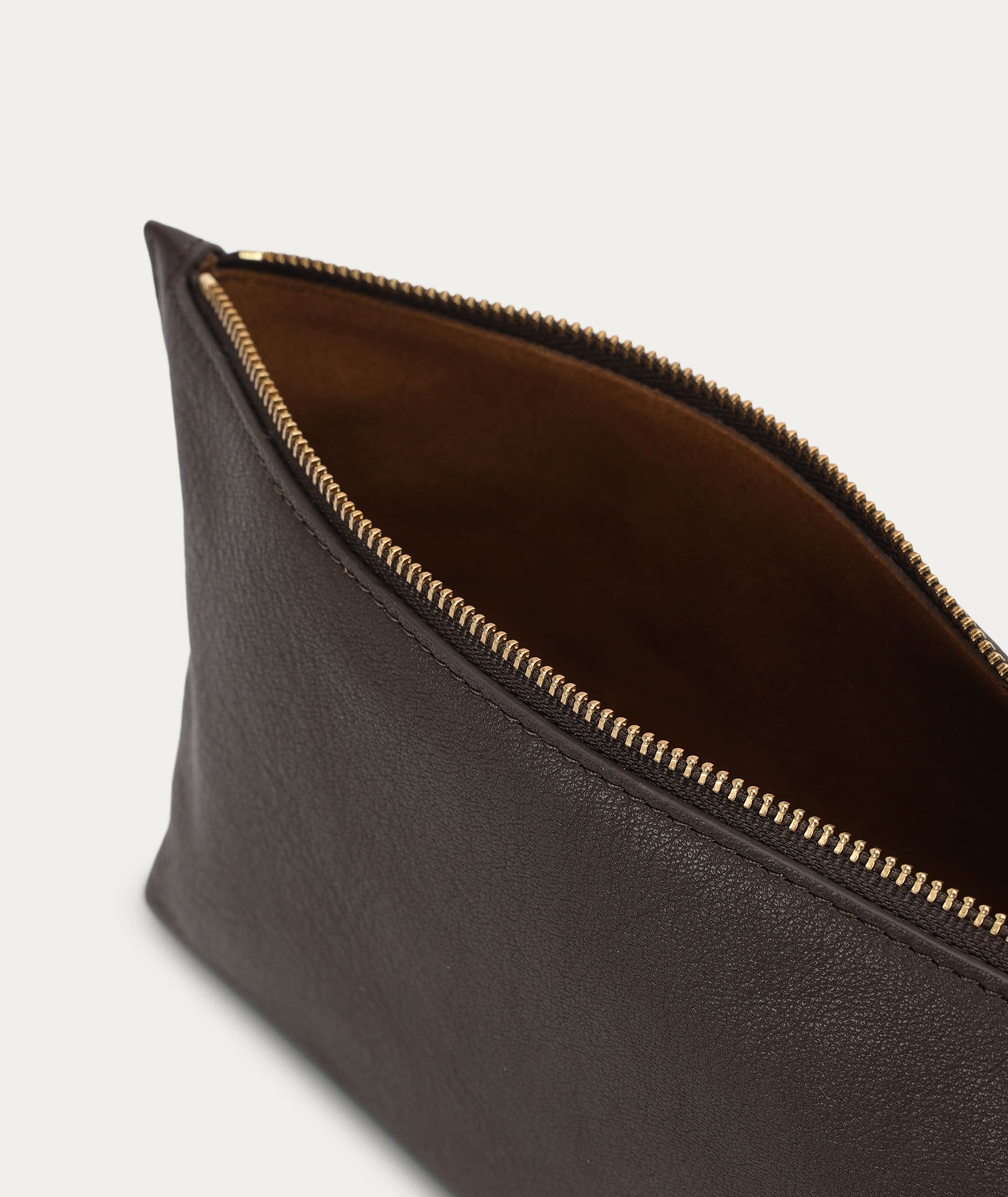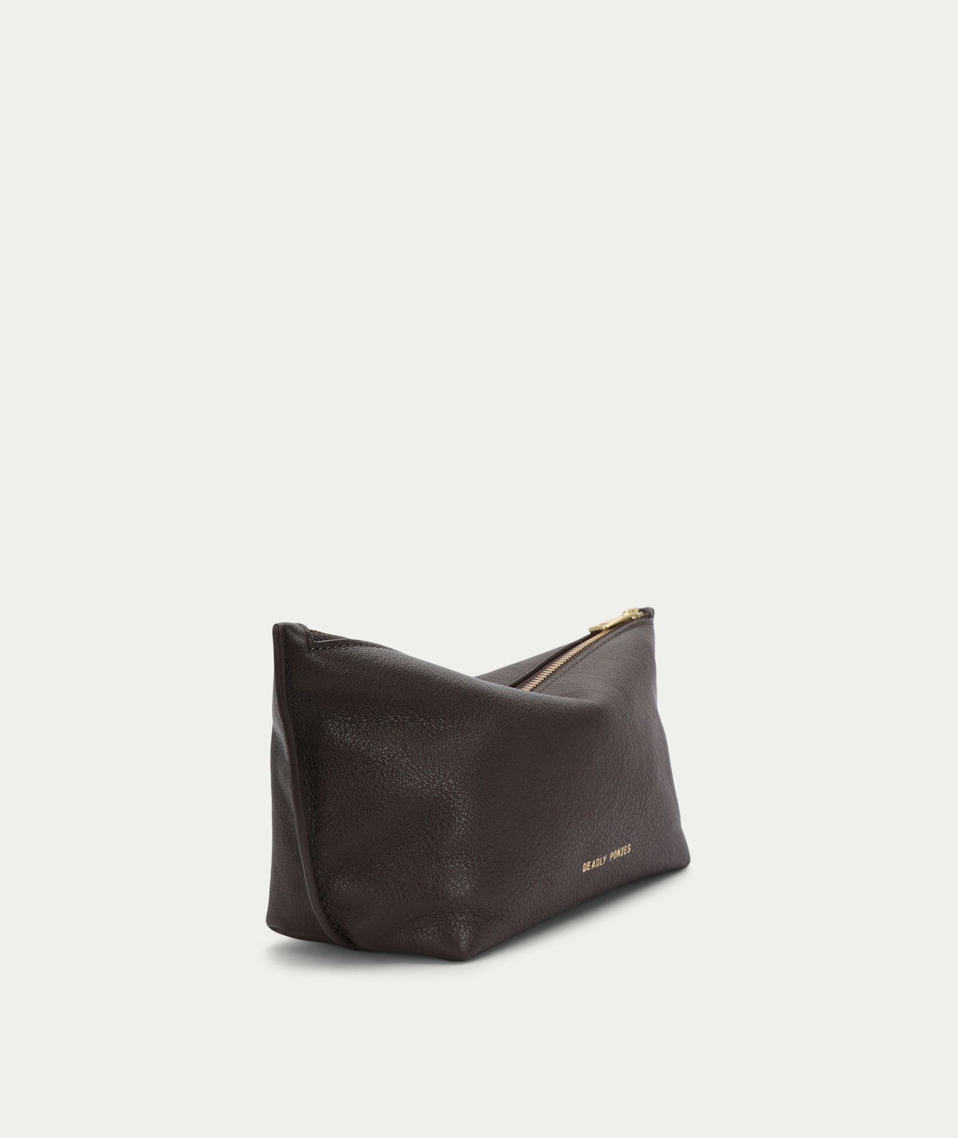 The Deadly Ponies Poucher Grande in Java is crafted from buttery-soft Calf Nappa with Calf Suede interior, and features a zip closure with brass hardware.
