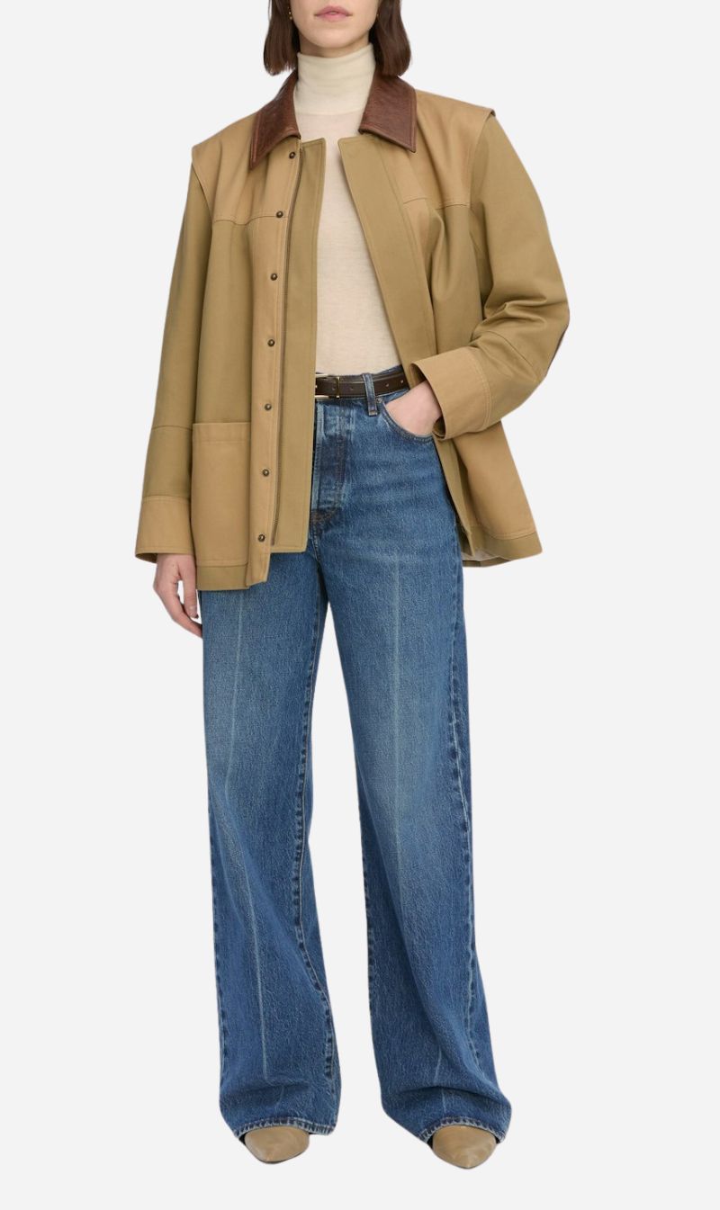 FRAME’s modern take on the classic barn jacket. Crafted in structured cotton with tonal leather trim at the collar and elbow patches. Finished with a covered placket and a longer, hip-grazing length for effortless layering.