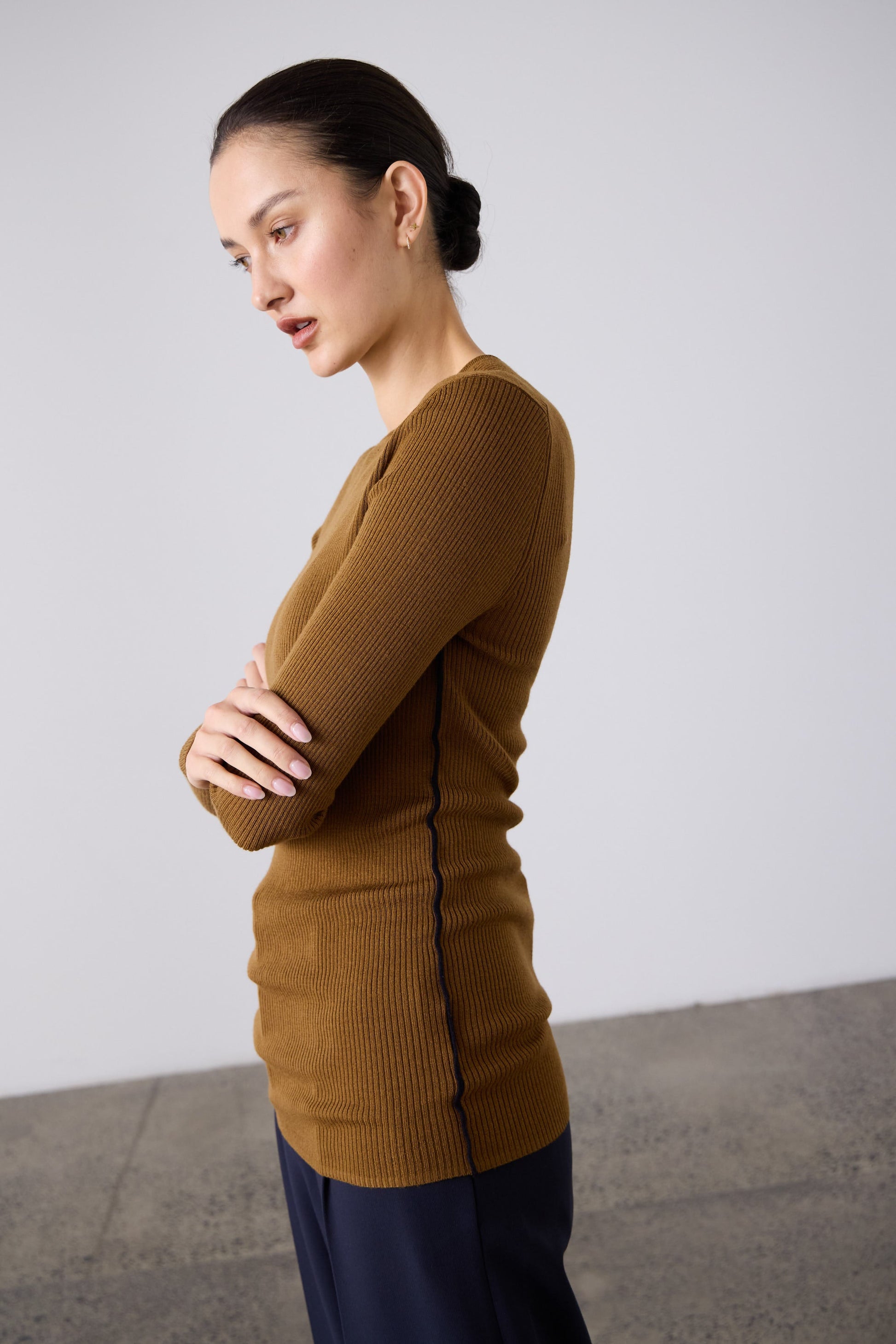 Fitted long-sleeve top in fine gauge merino. The perfect transitional staple for layering under a jacket or wearing by itself. Designed to fit close to the body for a clean, no-fuss look while working or venturing out in the weekend.