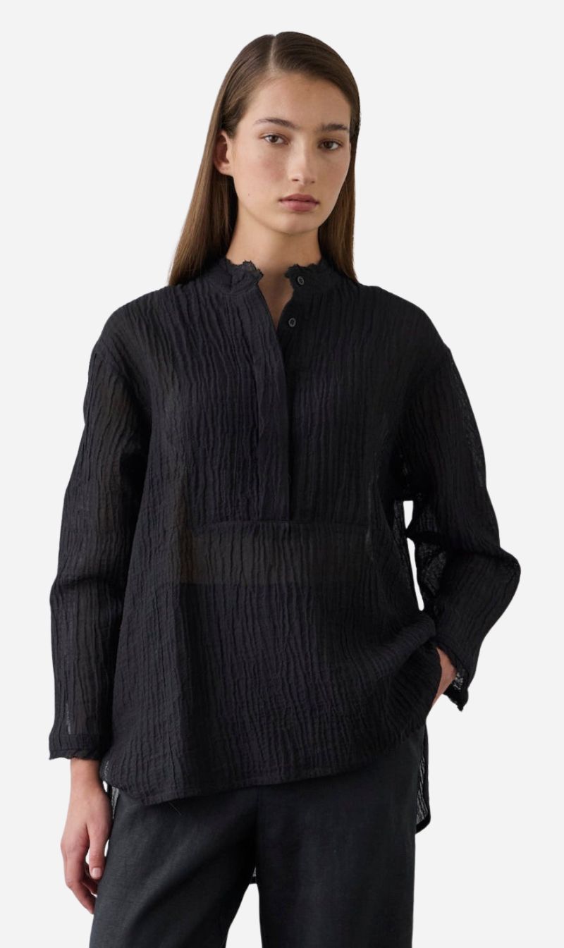 A laid-back piece with a polished edge. This women's relaxed blouse is crafted from lightweight, black textured ramie, offering a breathable feel with natural structure. Designed with a bib front, stand-up collar, cuffed sleeves, and refined detailing at the collar and cuffs, it brings quiet sophistication to everyday dressing.