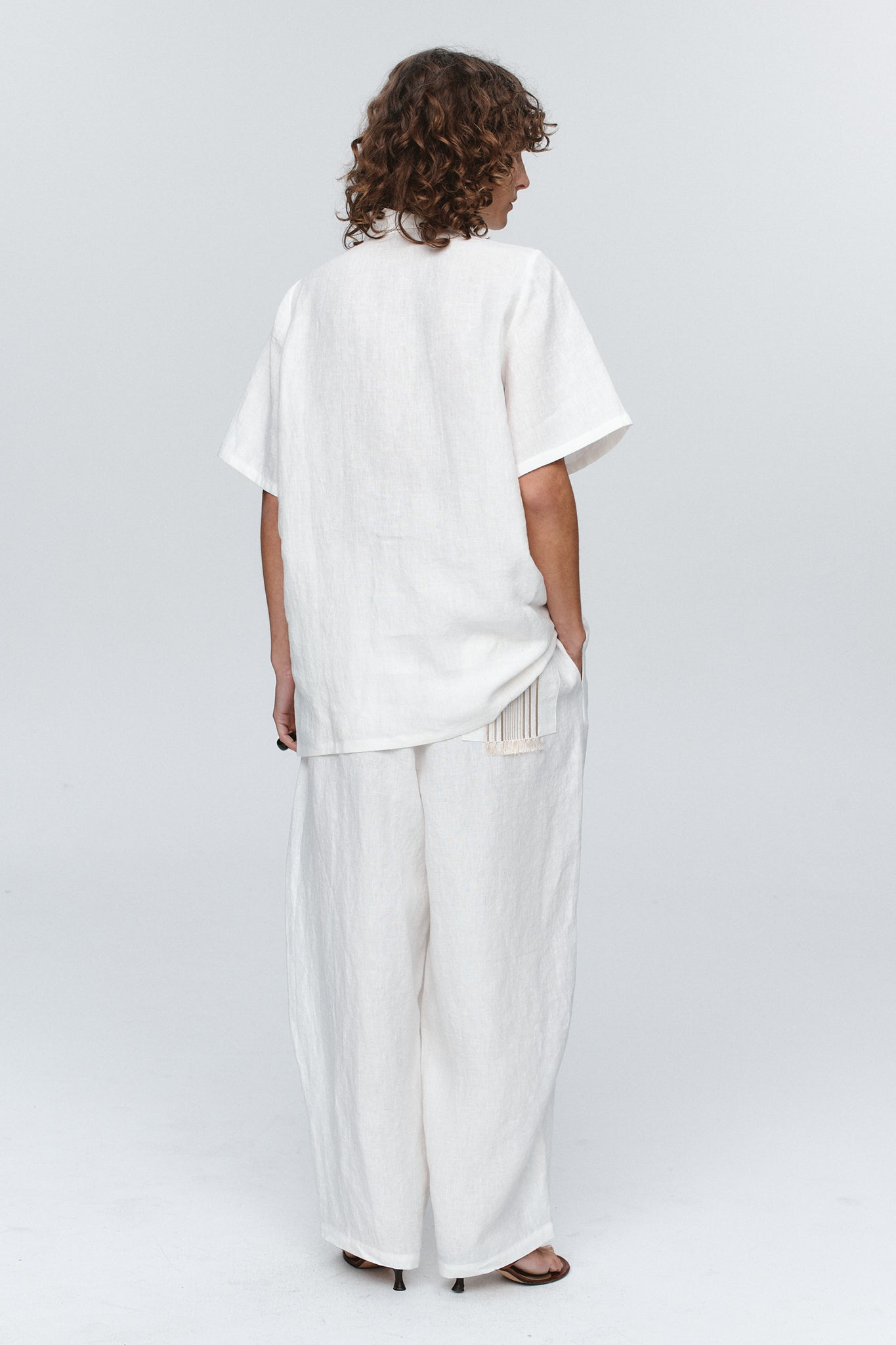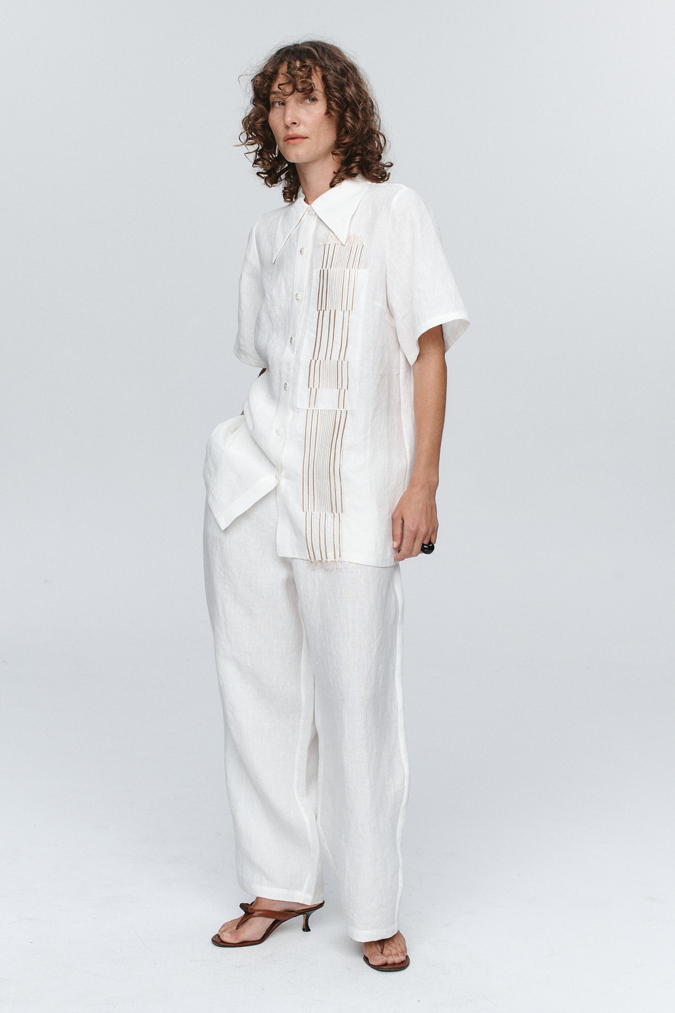 boxy sleeves and textural woven detailing on the left front panel. A quietly expressive piece designed to pair with the coordinating pant or short or style back with pared-back essentials.