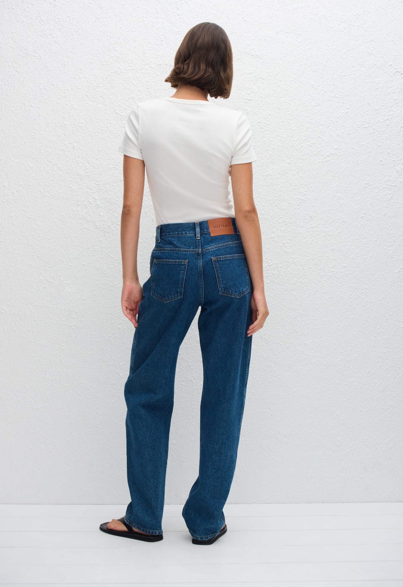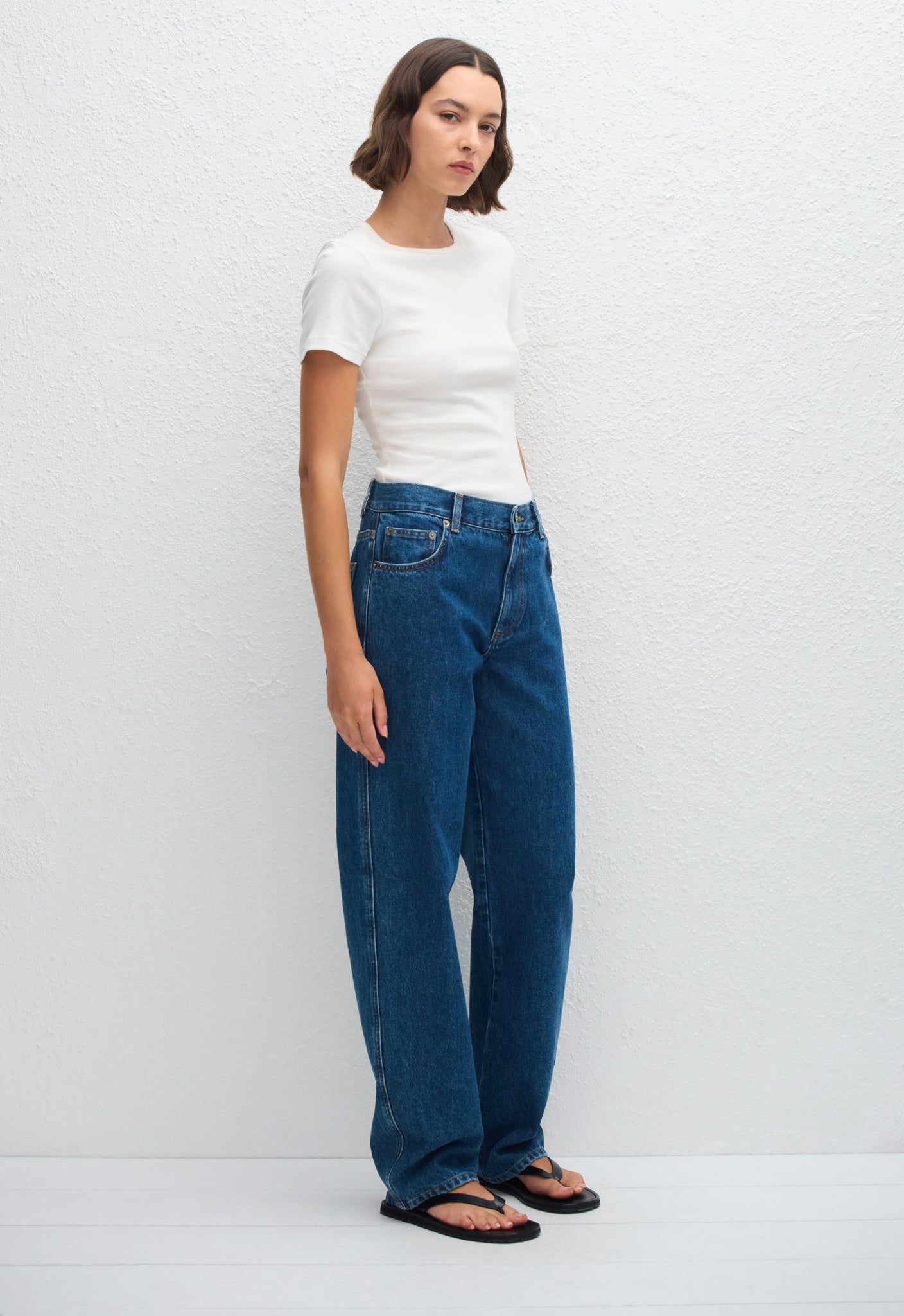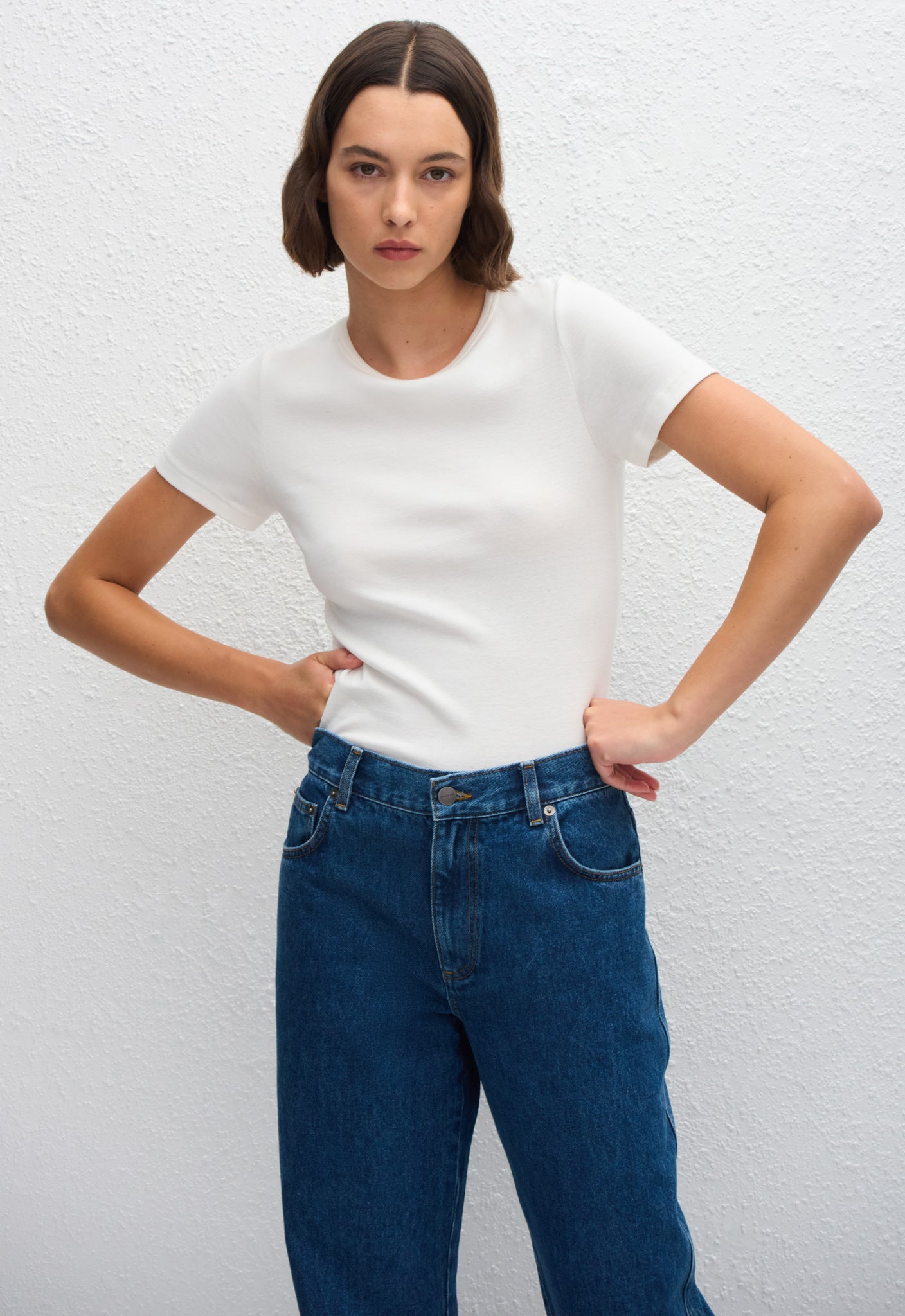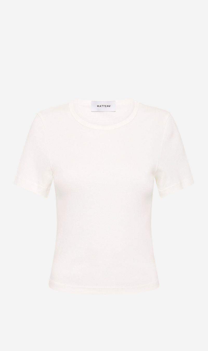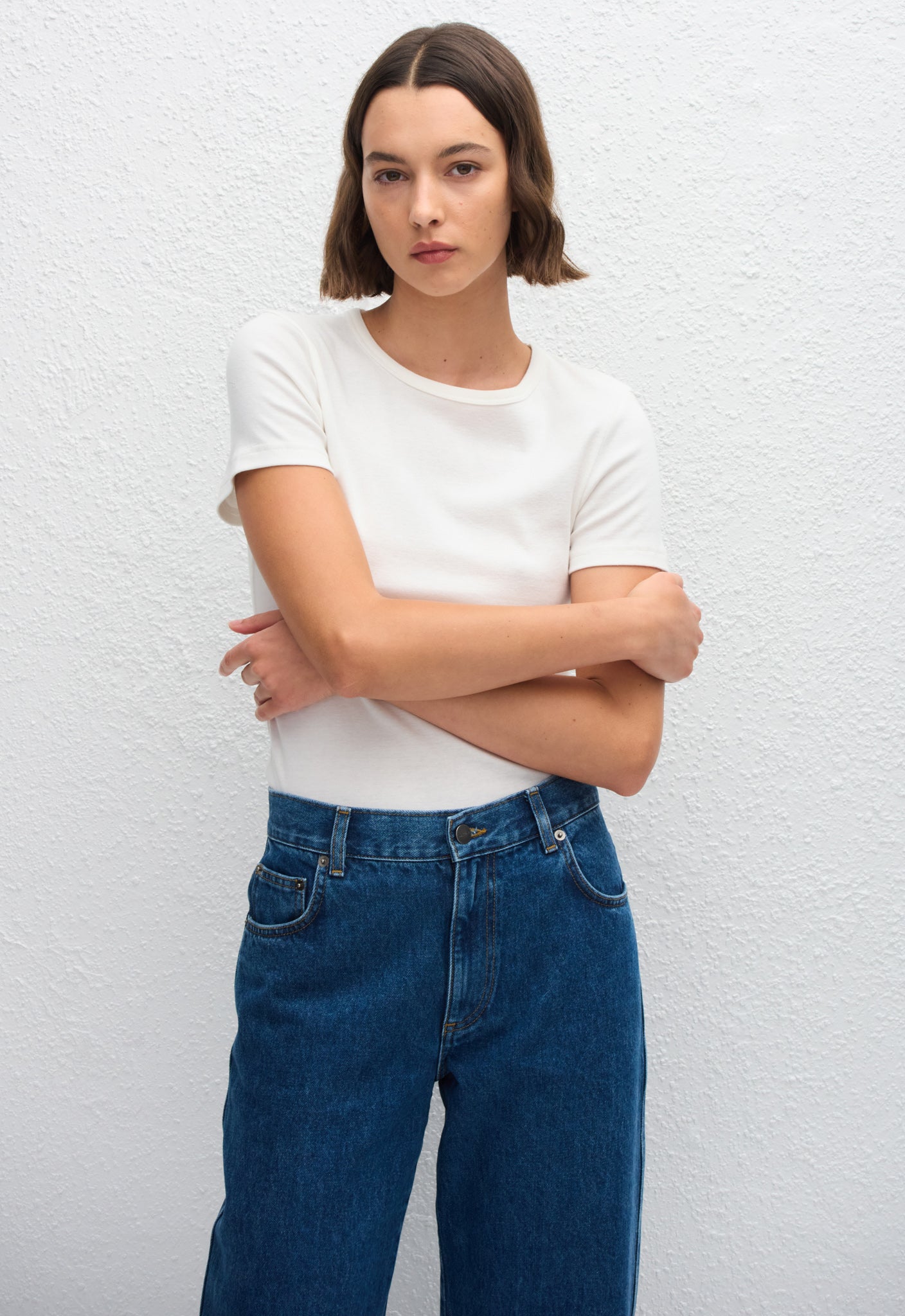 An everyday baby tee featuring a crew neck and flattering short sleeves. Made from 100% cotton, this tee features a self bound detail around the neck, and a coverstitch hem finish on the sleeve and body. Wear tucked in with our Long Chino Short or Relaxed Jean and pull together with our Boyfriend Belt.