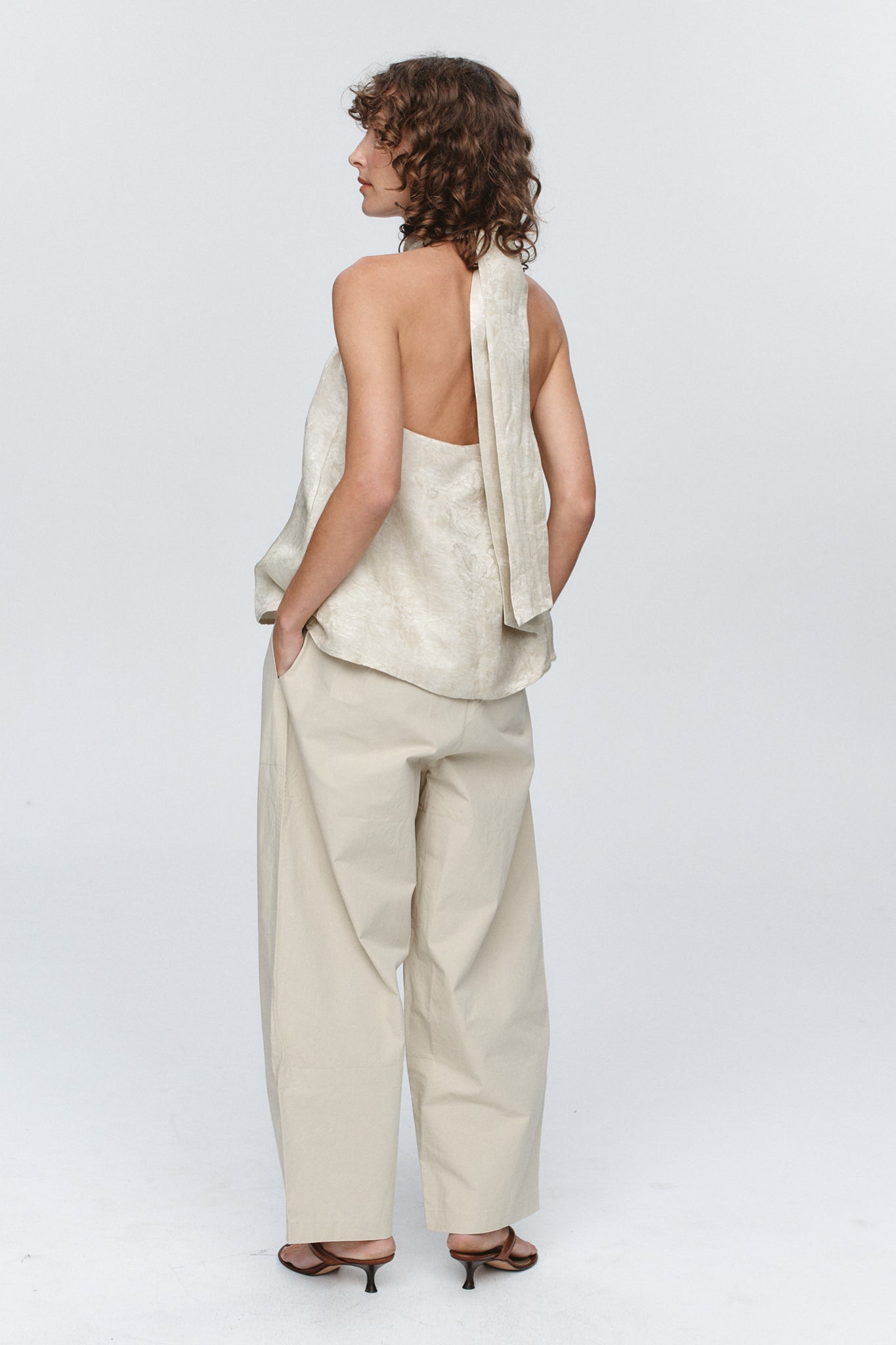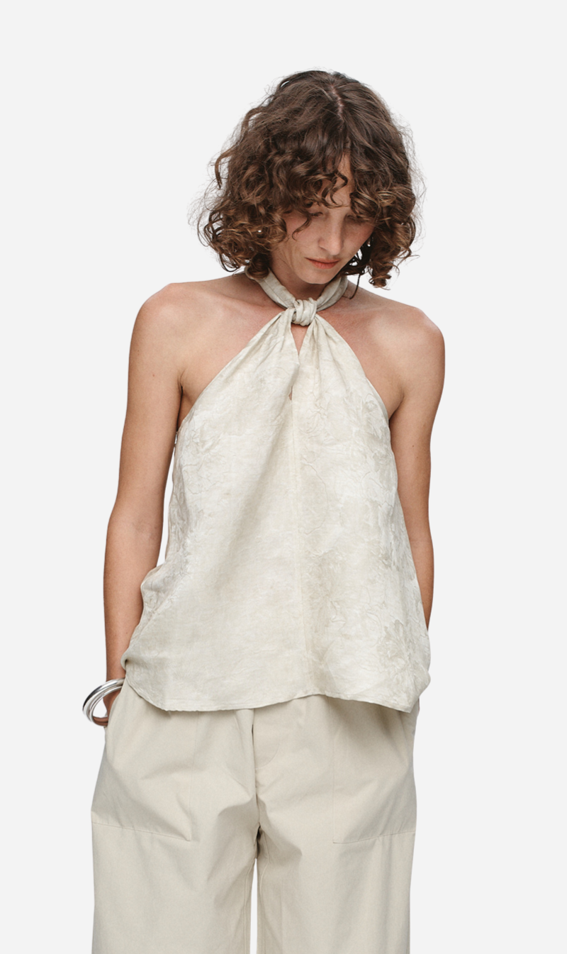 tonal jacquard that catches the light with subtle texture and depth. This top features a halter neck shape with a knotted detail that creates a keyhole feature. This top has a low back and is secured by an elongated tie at the back