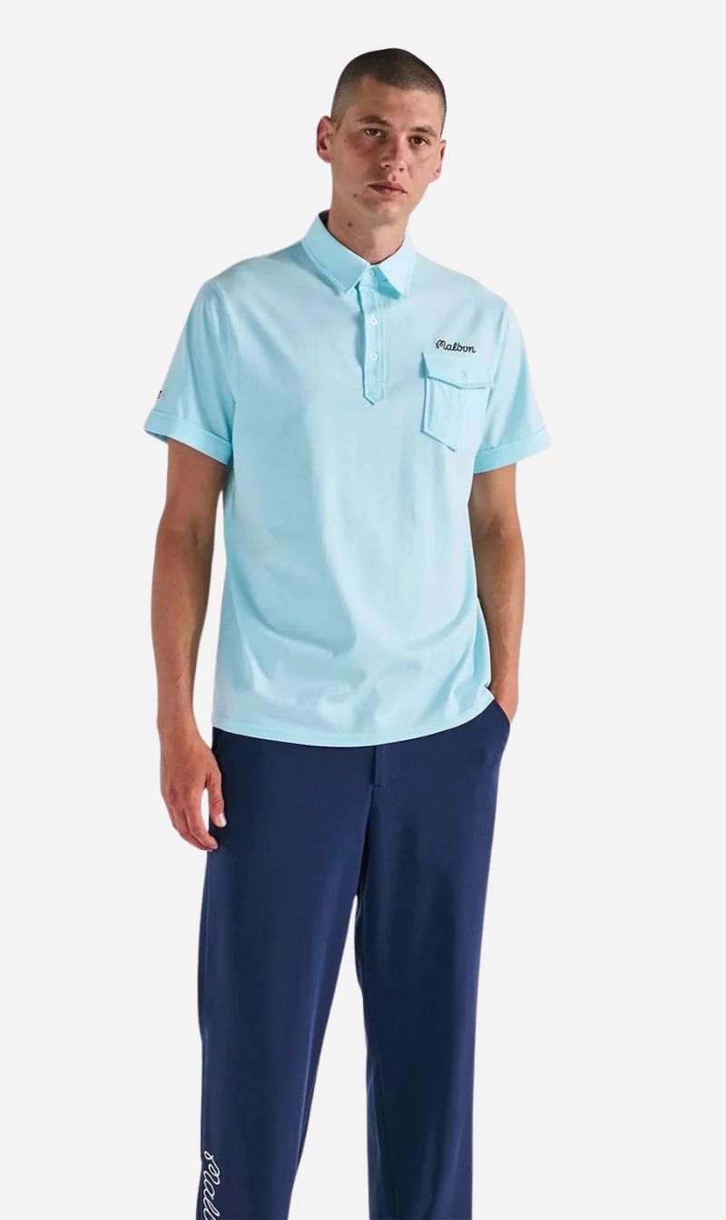 Sophisticated, tailored, and timeless—the Malbon Golf x Jesper Parnevik Single Pocket Cotton Polo in Aqua Blue is a standout piece from the exclusive collaboration capsule. Crafted from 100% soft cotton jersey, this polo features a refined, tailored fit that blends on-course function with off-course polish. A single-button pocket adds subtle utility on the chest, while custom embroidery throughout—including the Malbon Script logo, “Malbon Golf” on the back, and “JP” on the right cuff—showcases signature detailing from the collaboration. Finished with Malbon-engraved transparent buttons, this polo seamlessly combines comfort, character, and craftsmanship.