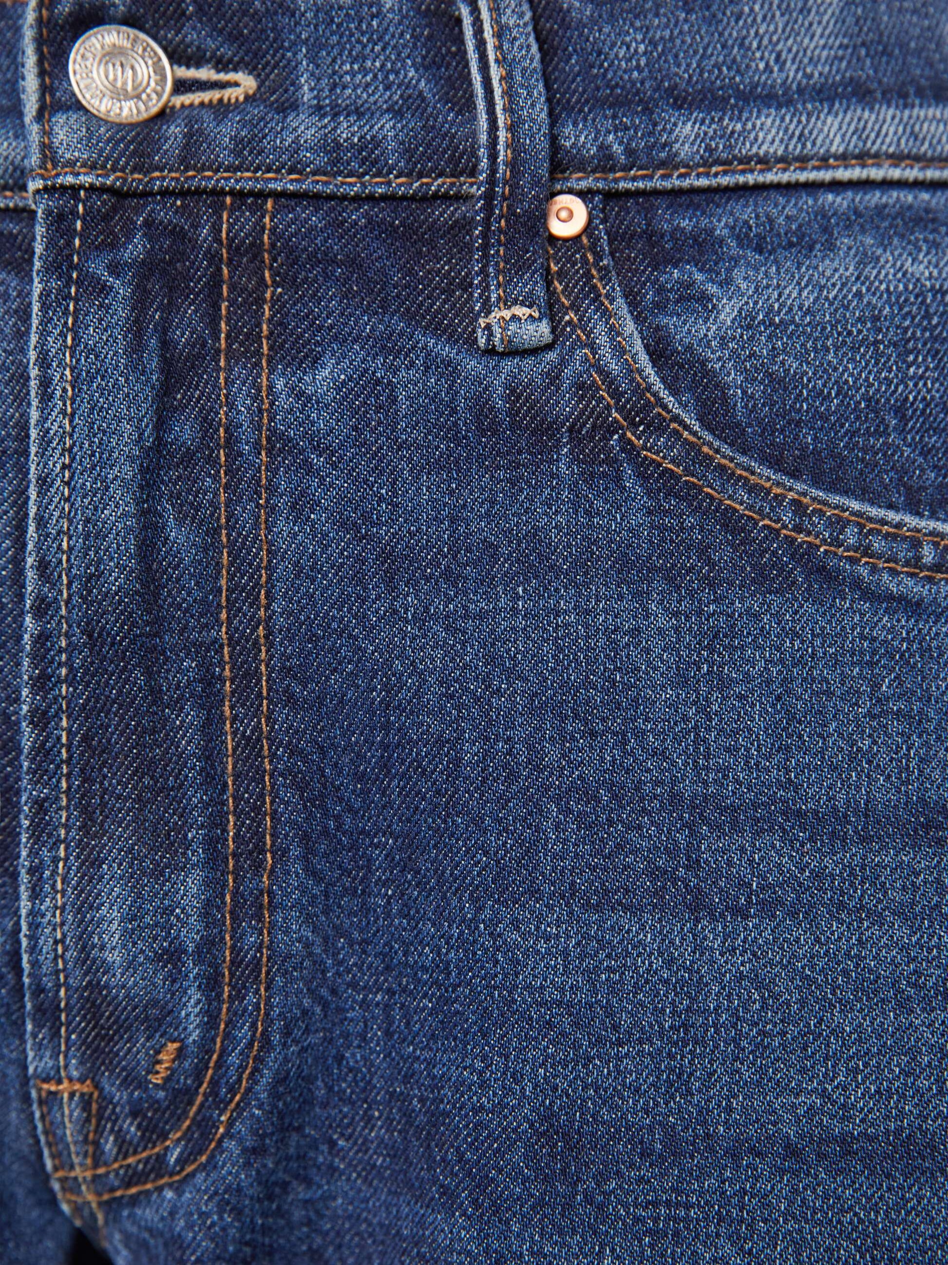 Off the grid. Mid-rise jeans designed to sit lower on the hips with a full barrel leg, zip fly, 28.25-inch inseam and a frayed hem. Made from rigid SUPERIOR denim, Unplugged is a dark blue with subtle whiskering and fading at the knees.Â