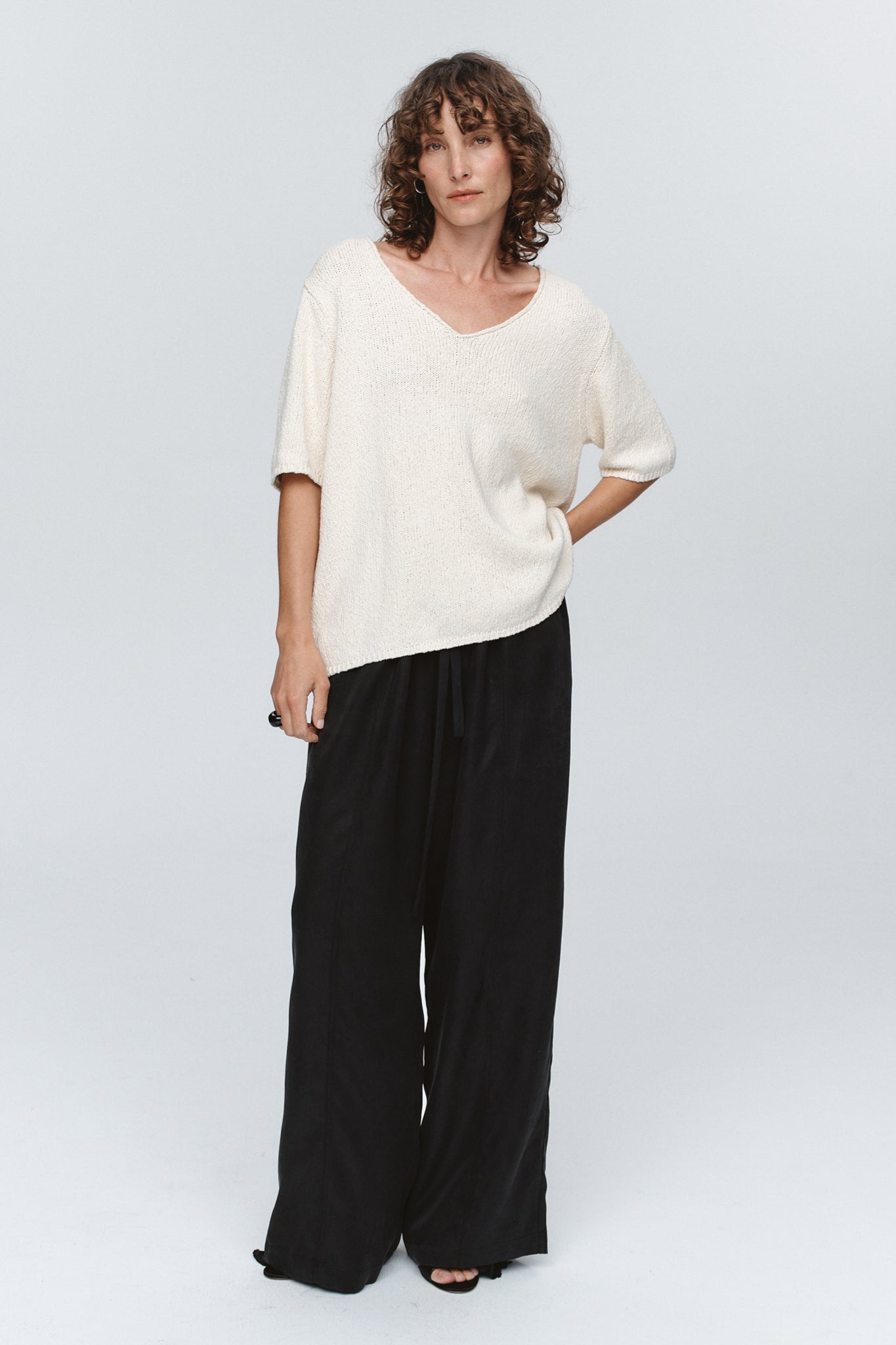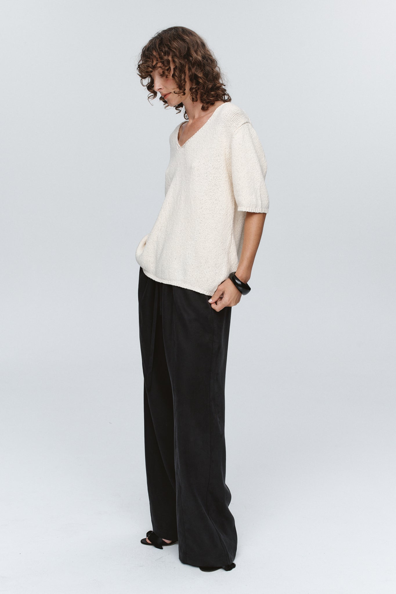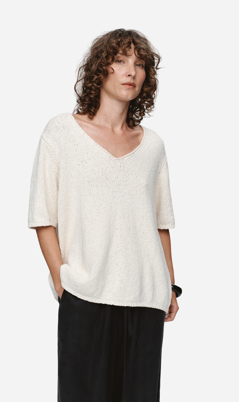 knitwear, crafted in a tactile, lightweight 100% Cotton. Its relaxed t-shirt shape features a wide V-neckline, short sleeves and softly ribbed edges, lending an effortless drape and understated texture.