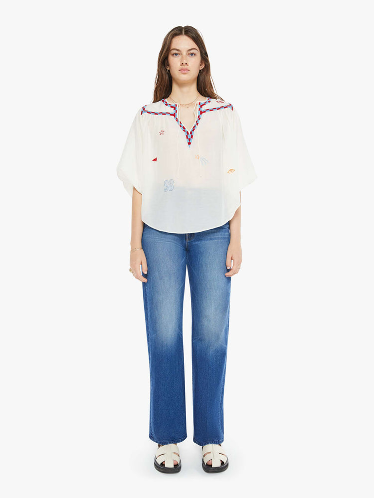 Race ya to it. A lightweight blouse with a V-neck that ties, airy elbow-length sleeves, a curved hem and a flowy fit. Made from a semi-sheer cotton blend in white, the top features checkered details on the yoke and embroidered raceway-inspired graphics throughout.