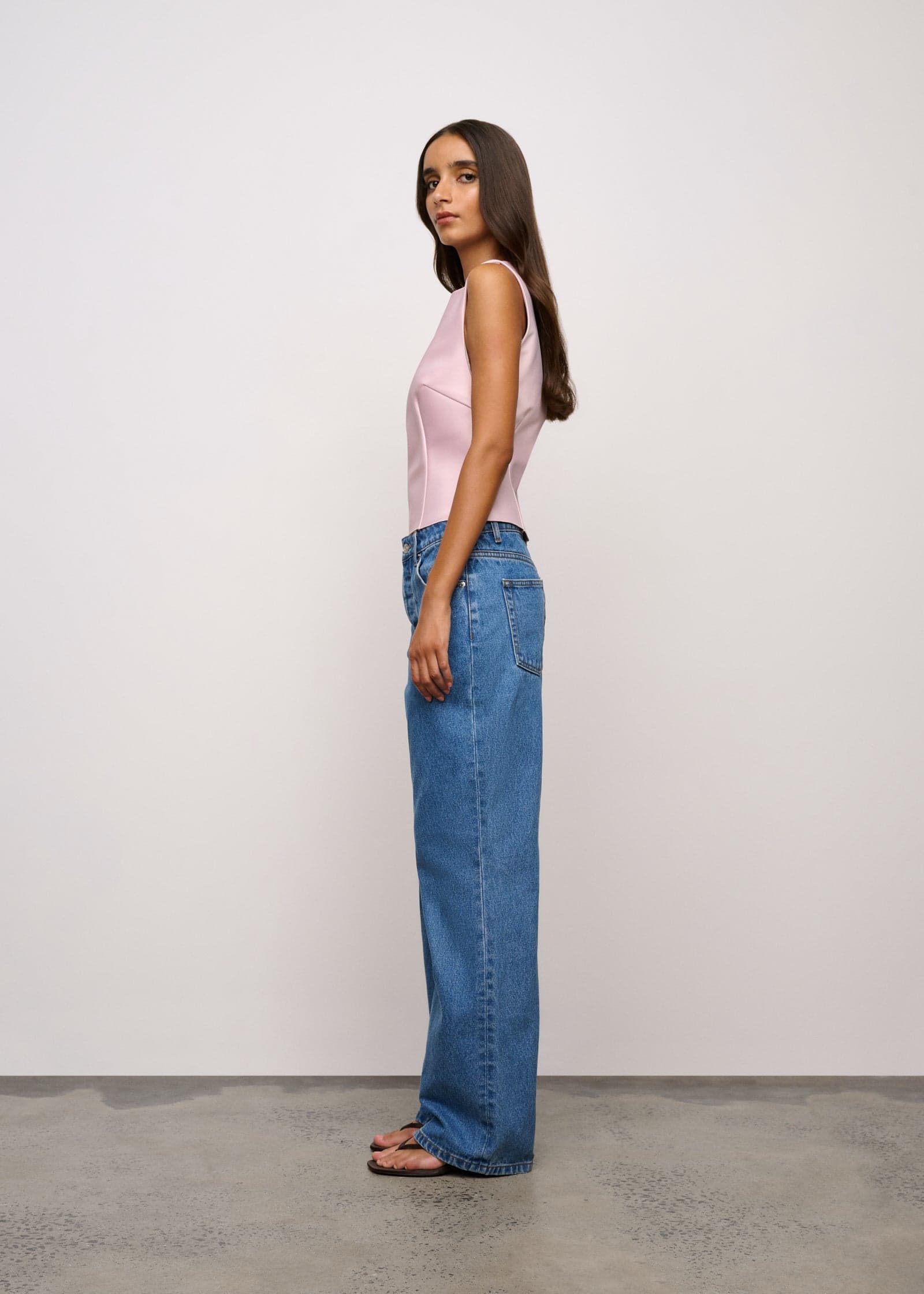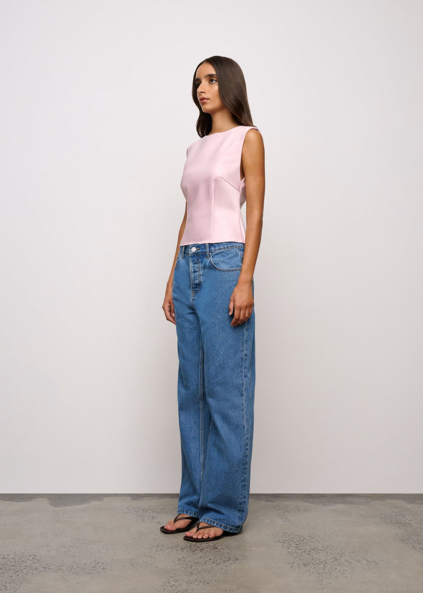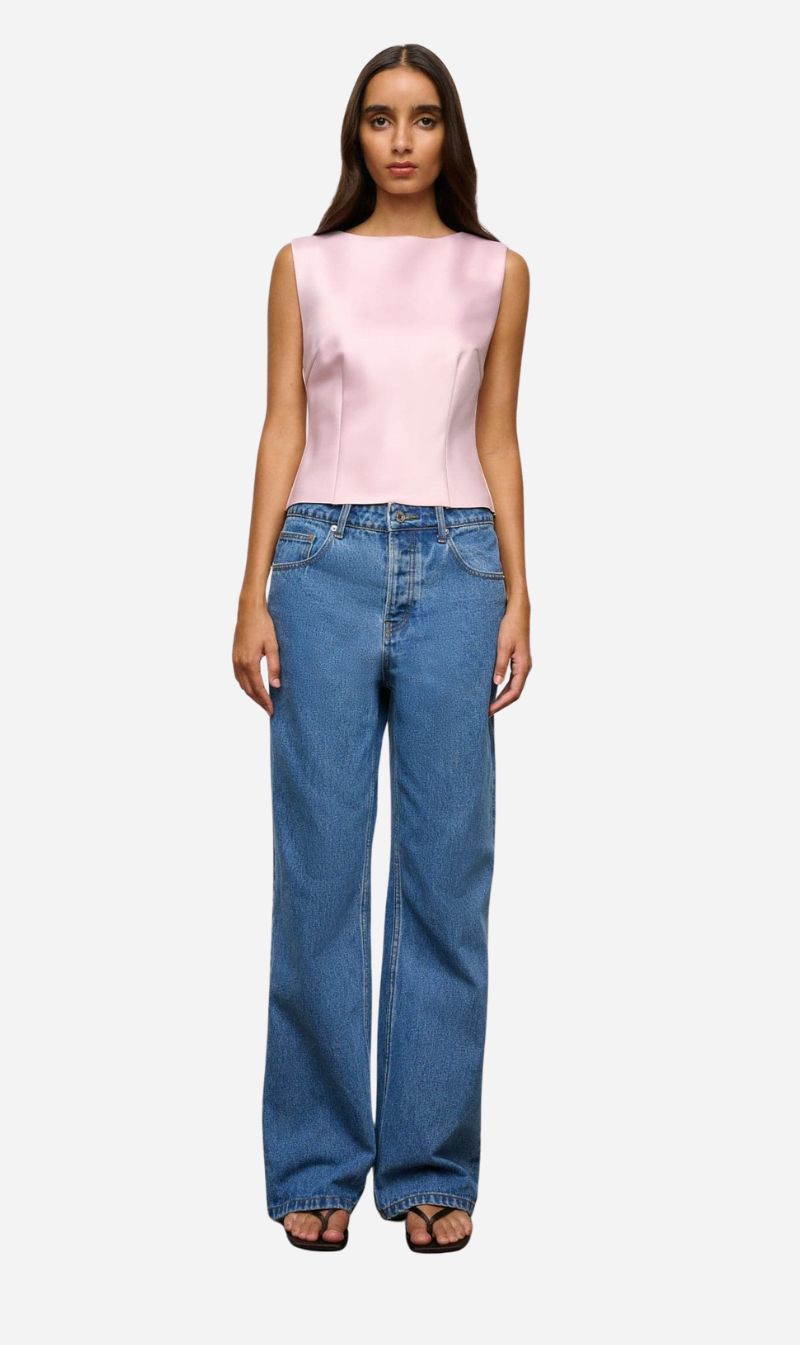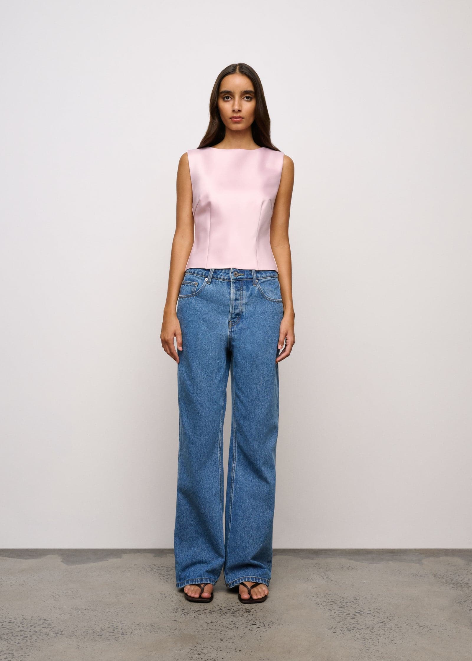 A sleeveless top with boat neck and raw hem crafted in a high shine satin bonded onto a heavyweight crepe which moulds to the body.