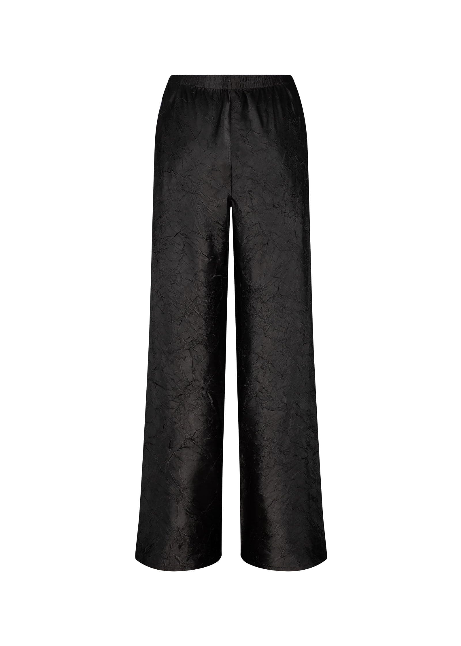 A relaxed bias cut pant with elastic waist in a textured crushed satin fabrication.