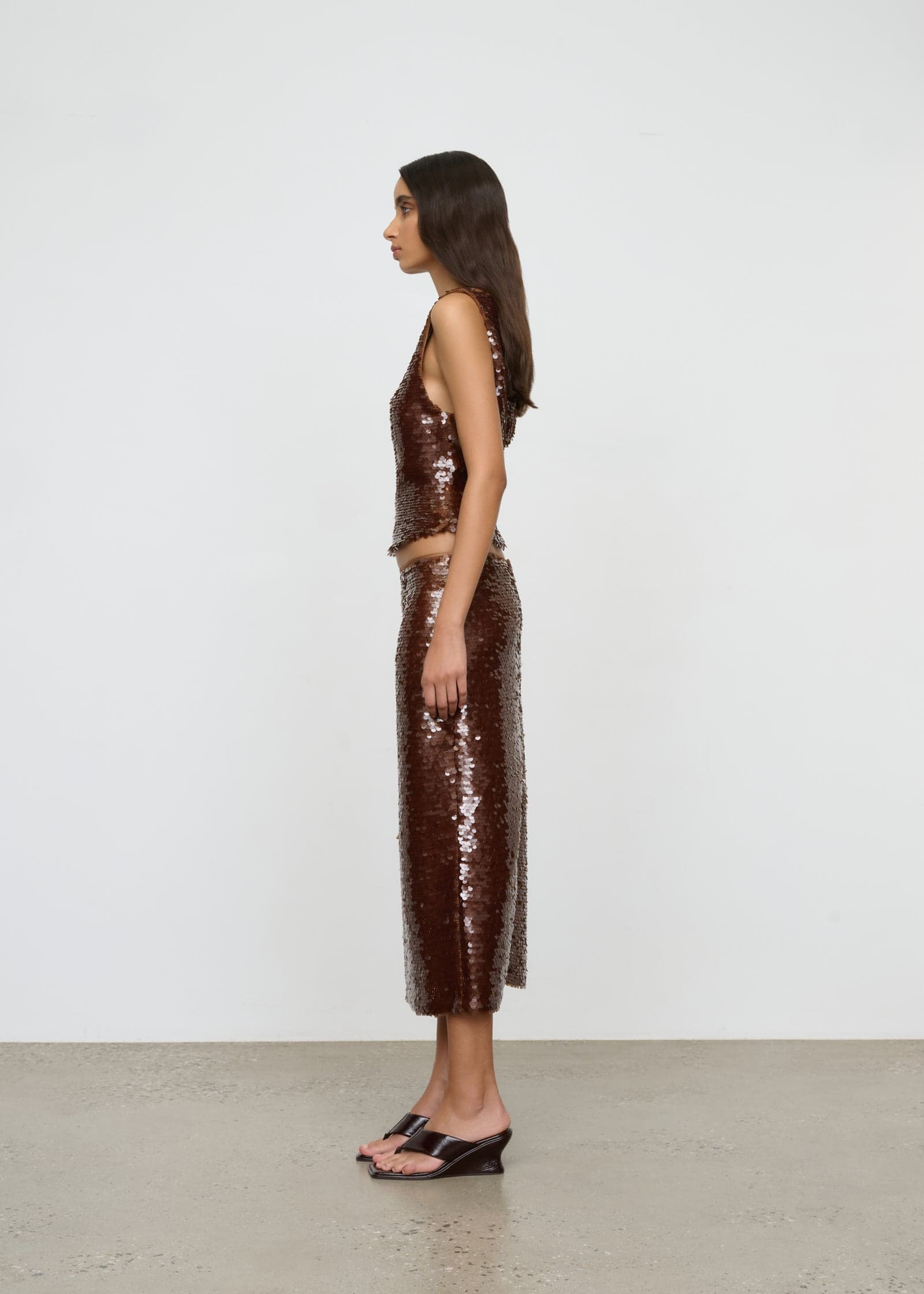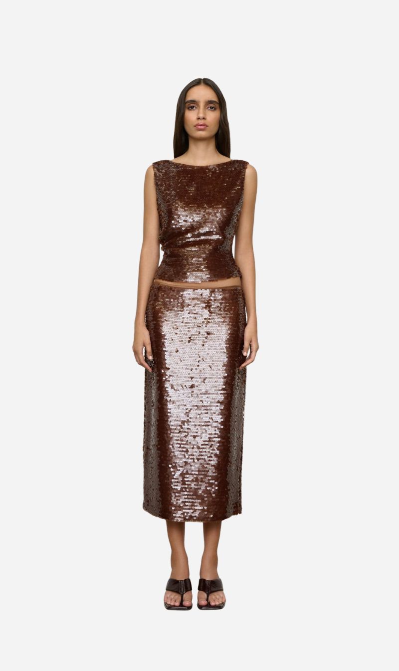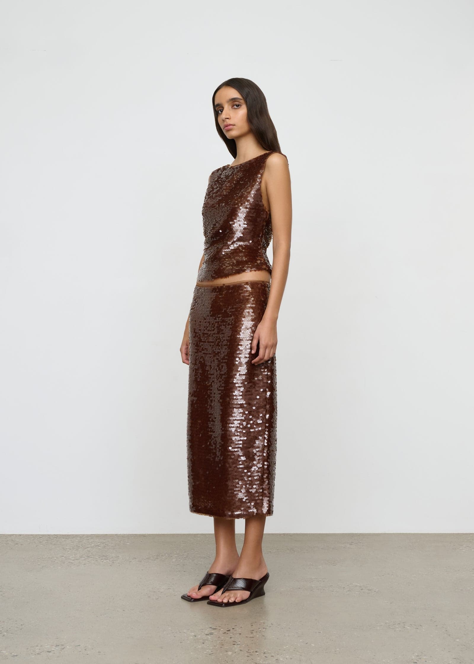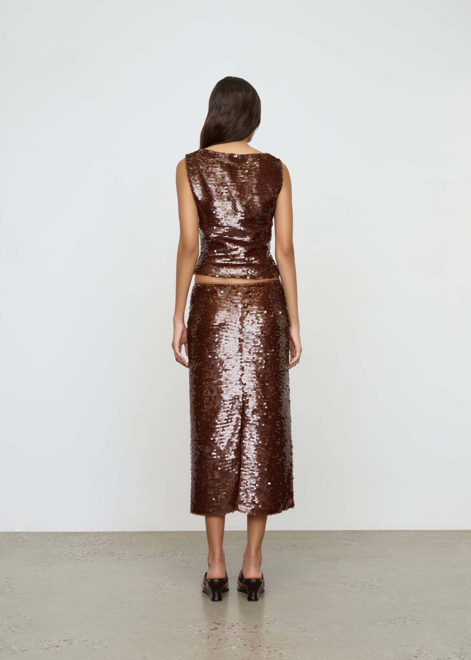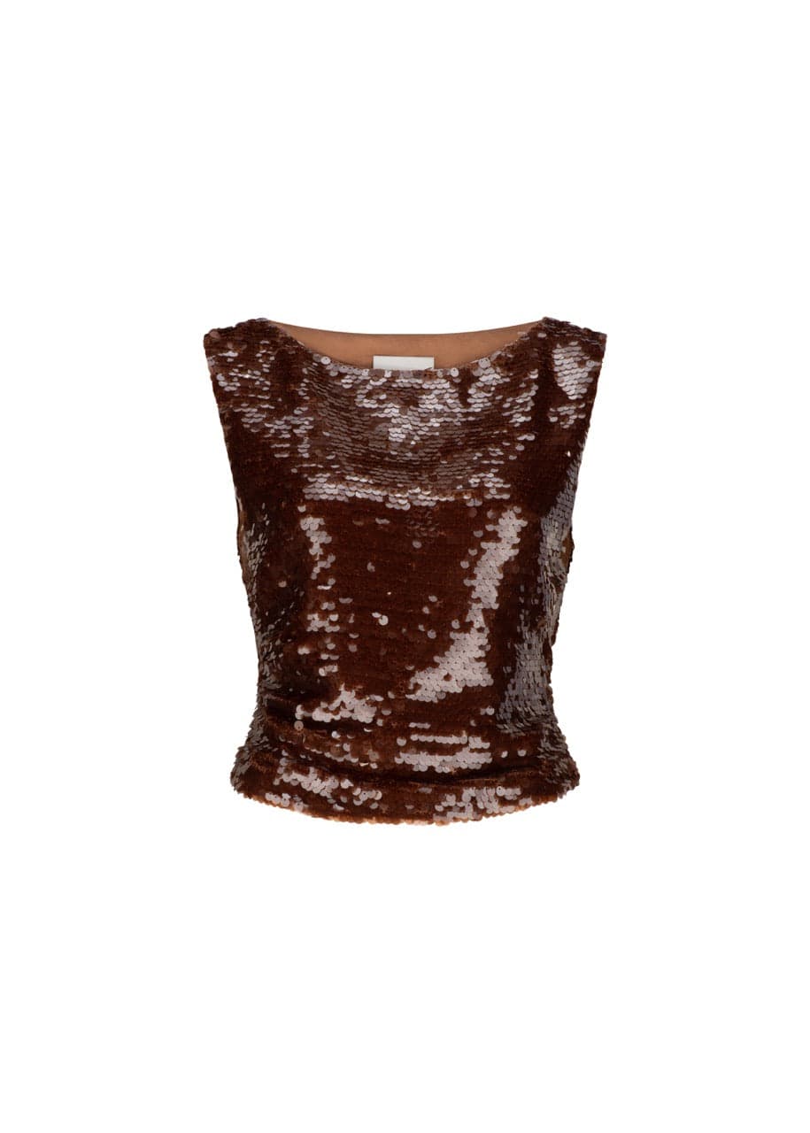 A relaxed, sleeveless top with boat neck and waist tucks crafted in a custom sequin fabrication.