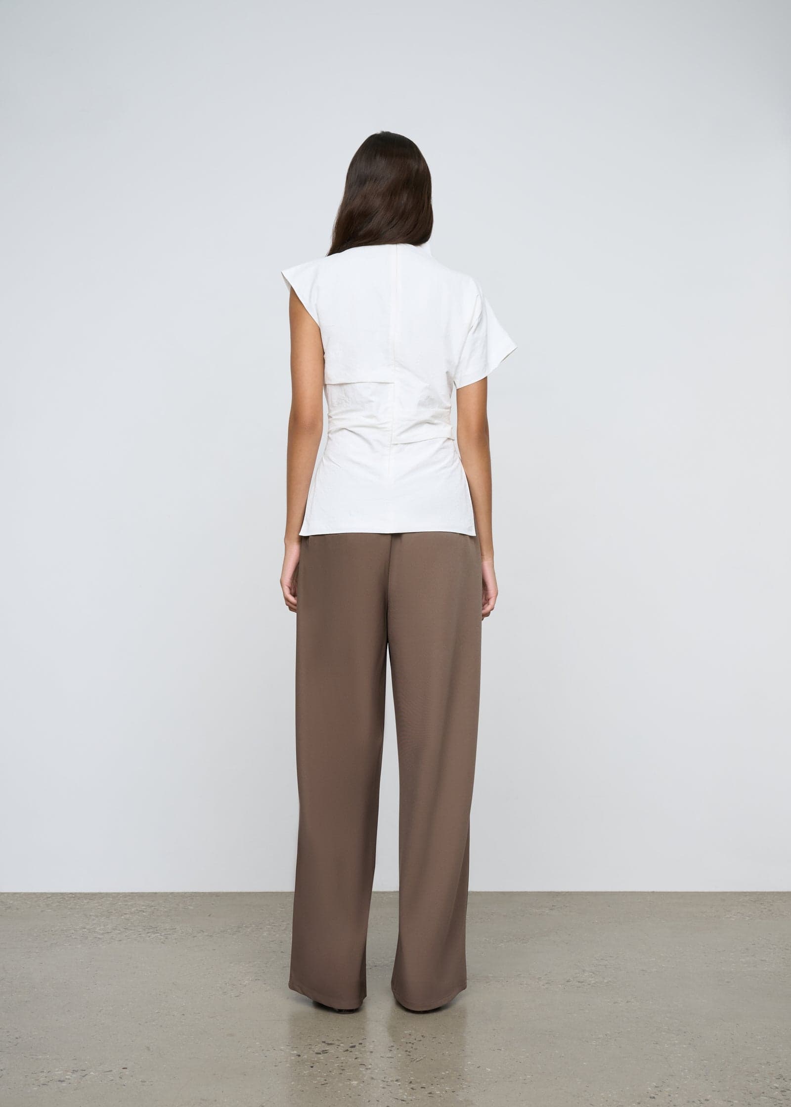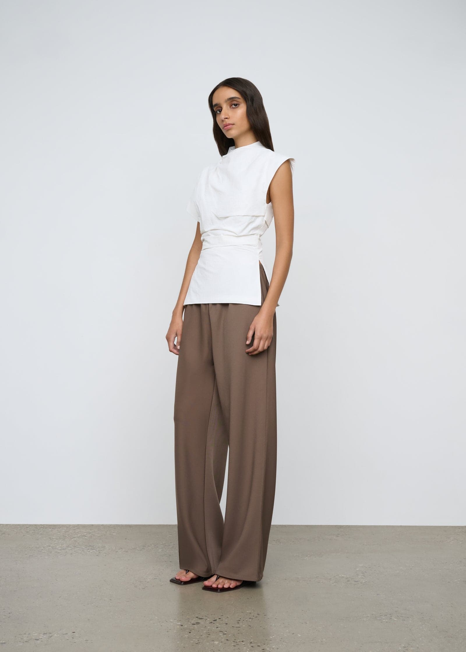 A relaxed bias cut pant with elastic waist in a midweight twill fabrication.