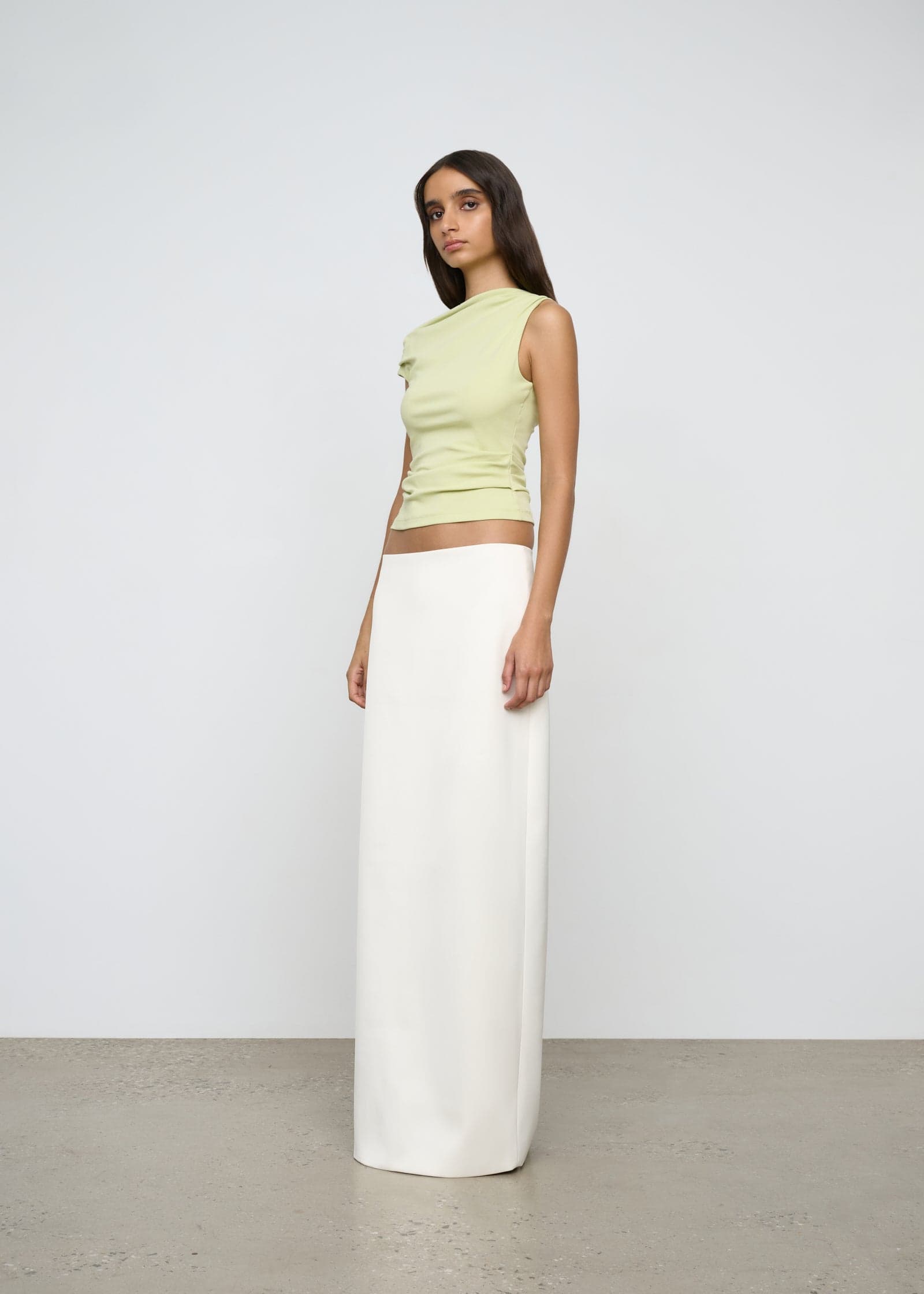 A double lined top with asymetric neckline and tucks cut is a soft cotton rib.