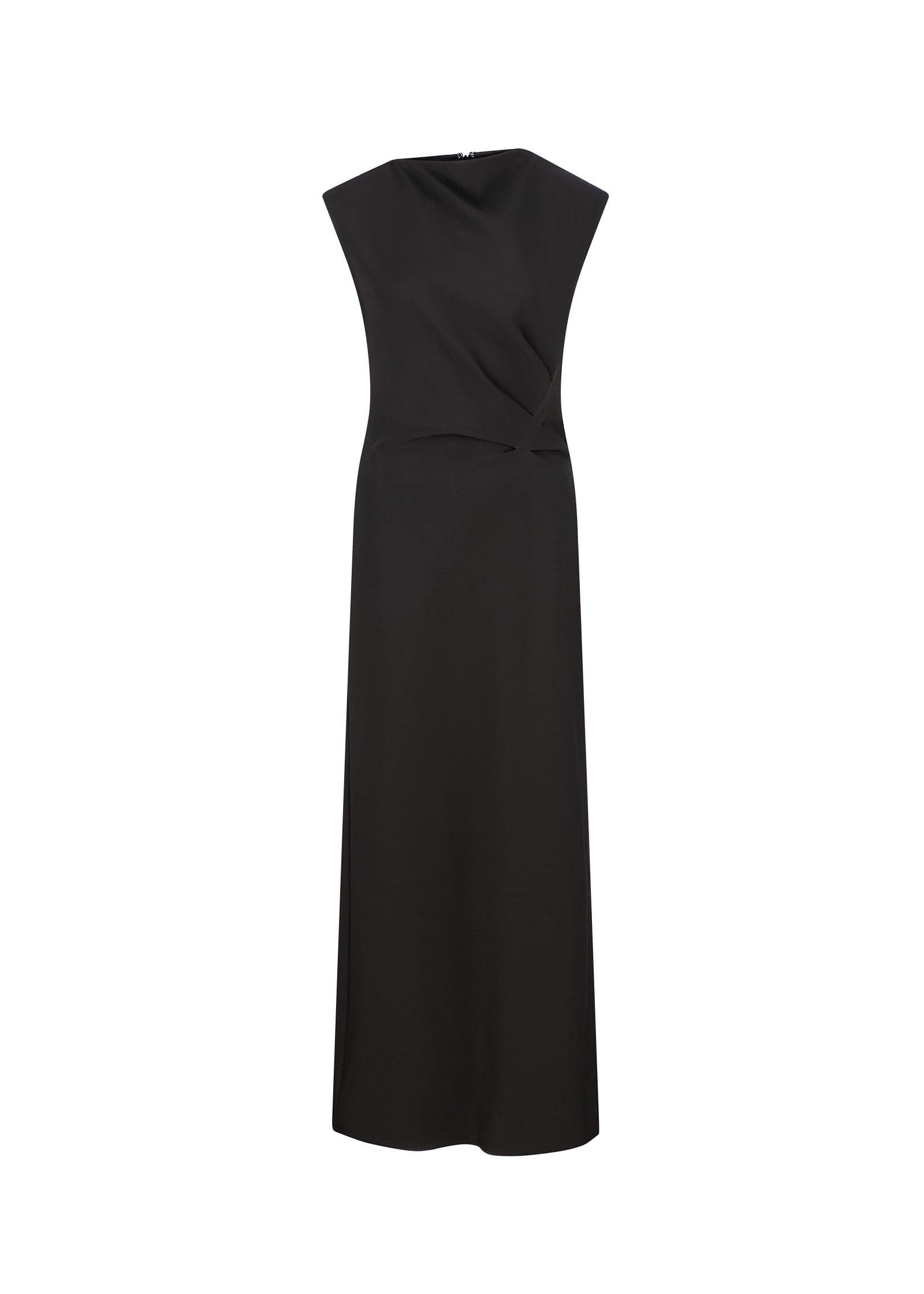 A sleeveless dress cut with asymmetric details and feature tucks in a mid-weight woven crepe.