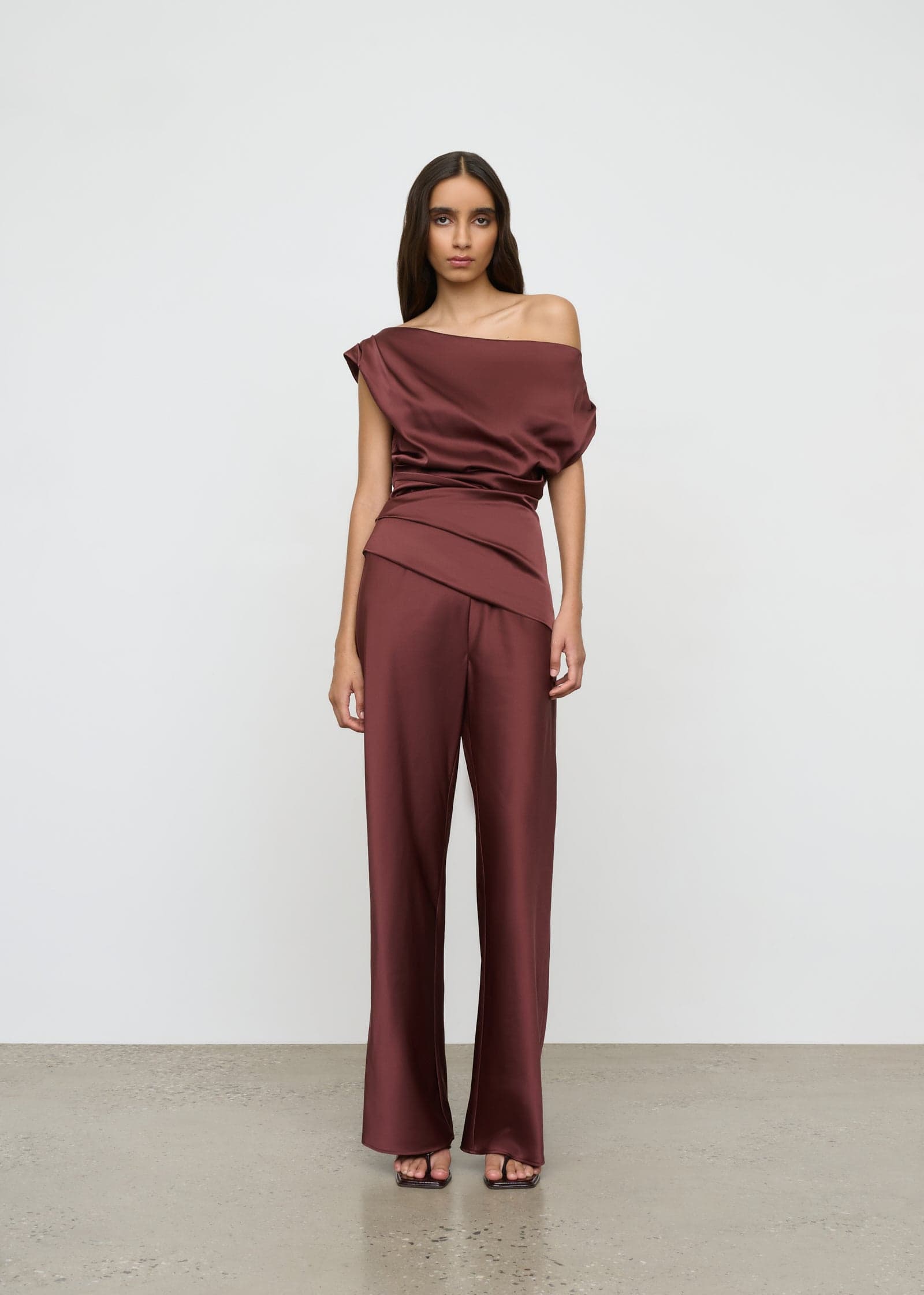 An off shoulder asymmetrical top with artful tuck detail cut in a fluid satin fabrication.