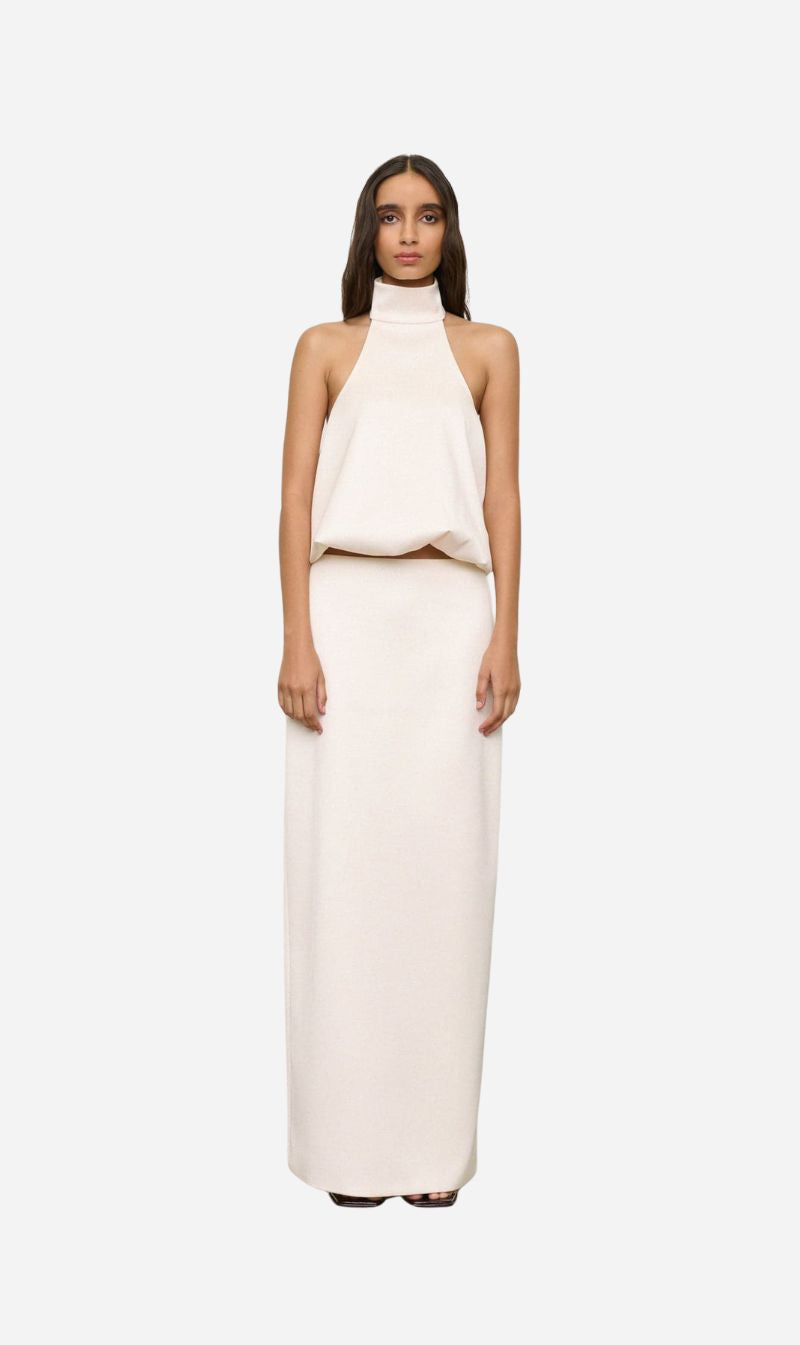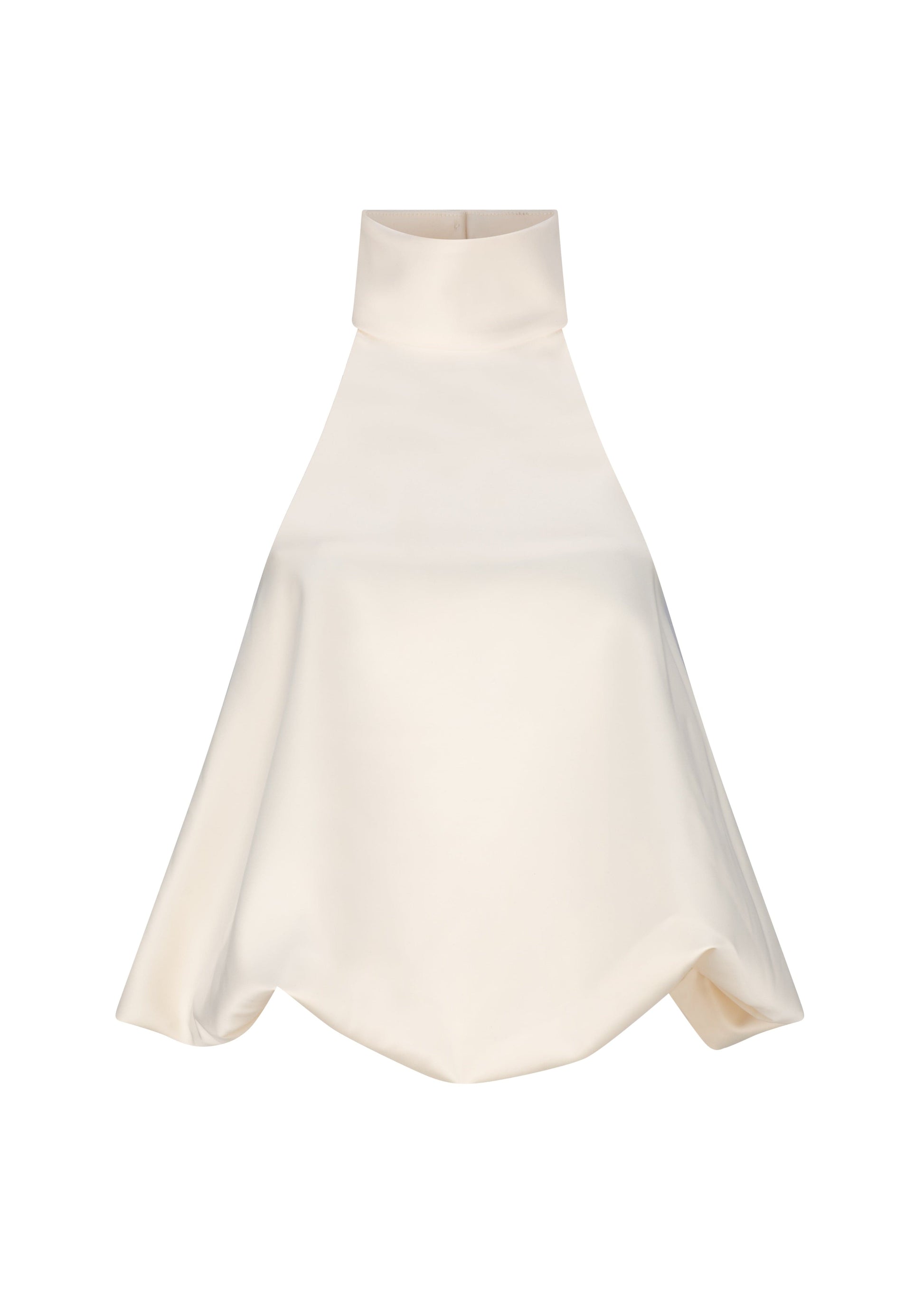 A backless halter style with wide neck band and voluminous hem crafted in a high shine satin bonded onto a heavyweight crepe.