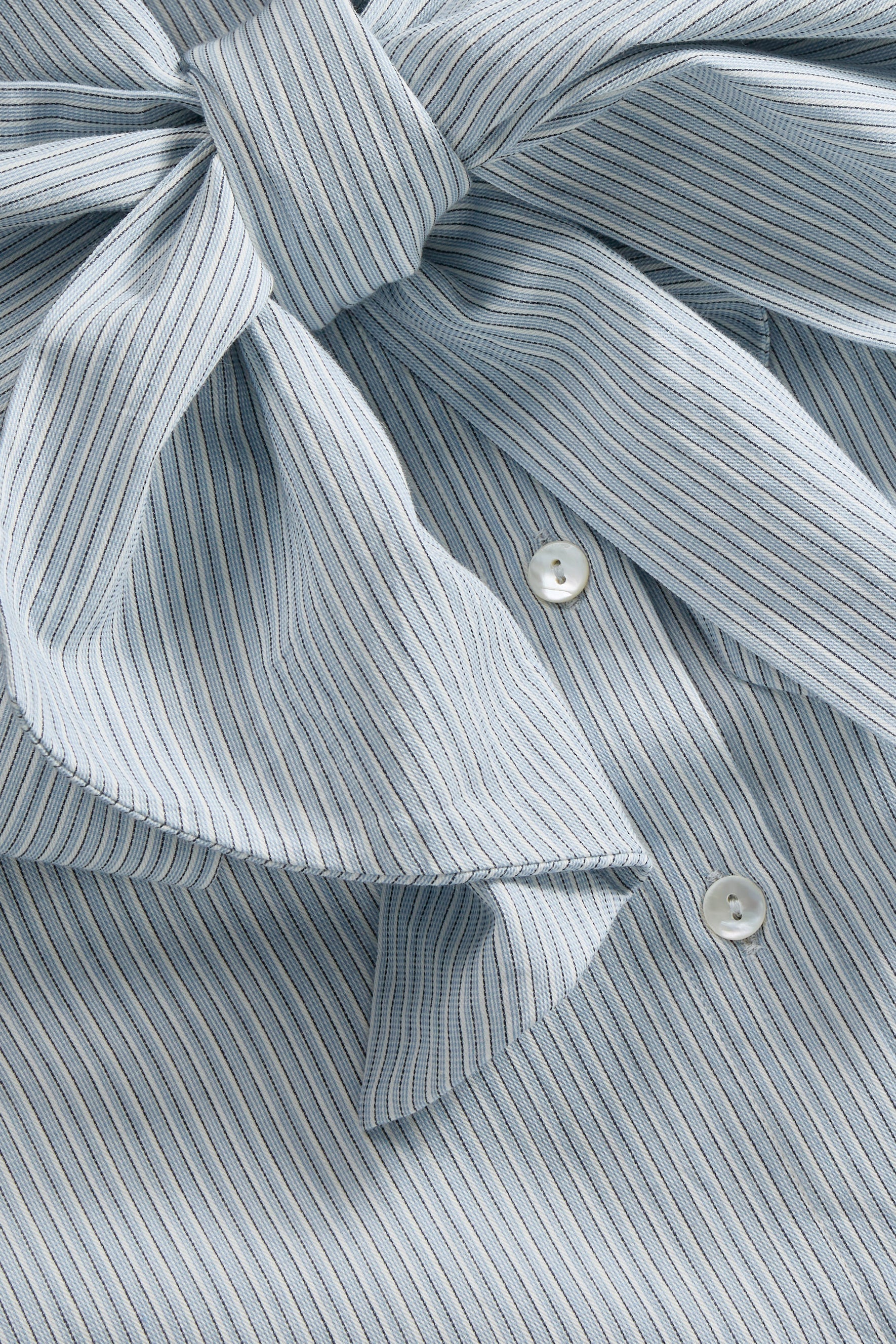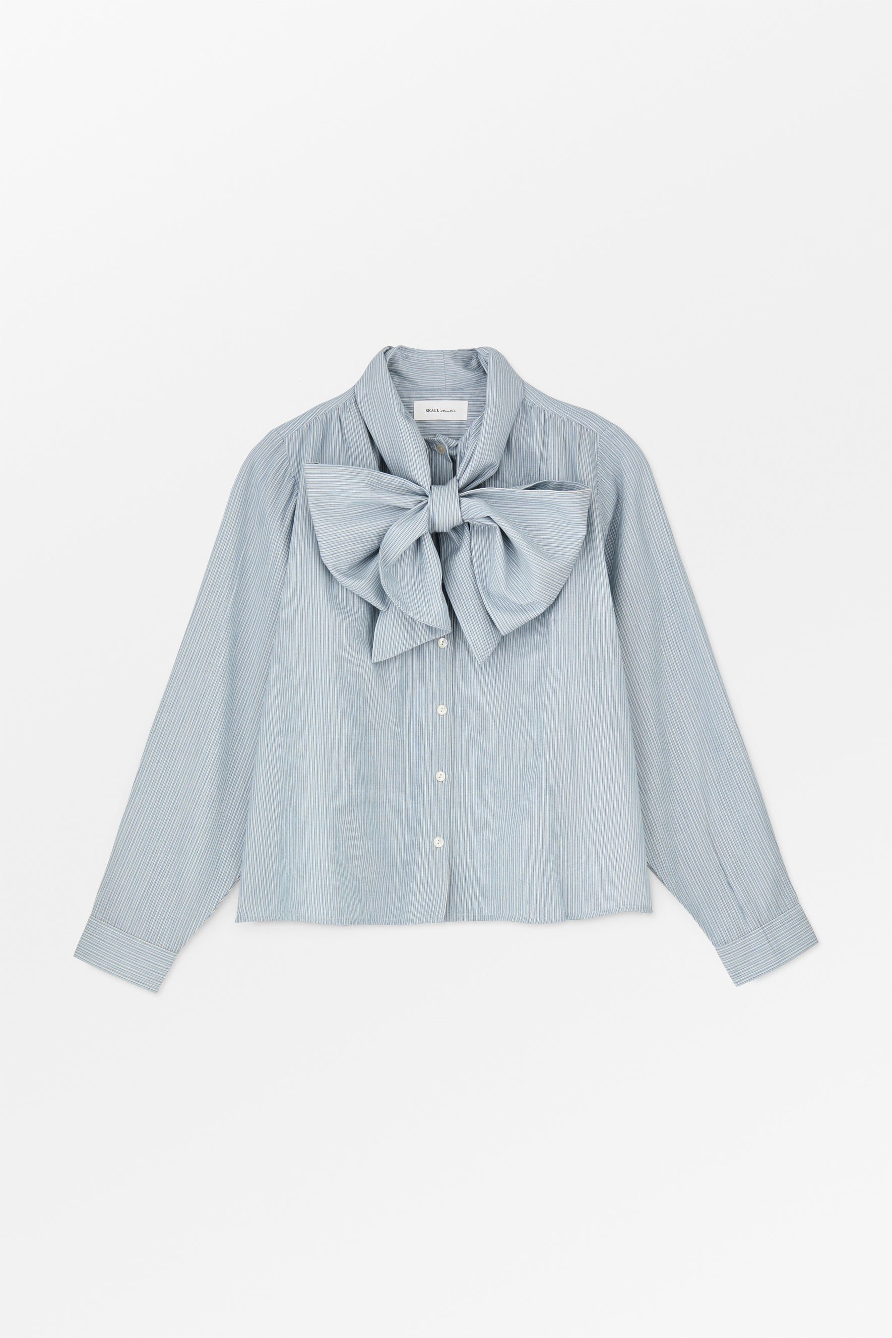 Dalia Bow Shirt is a feminine and chic take on a traditional blouse. The double layer scarf that forms the collar can be tied into a large bow at the front or left as a free-flowing scarf. The shirt is made from 100% organic cotton and has buttons at the front and cuffs.