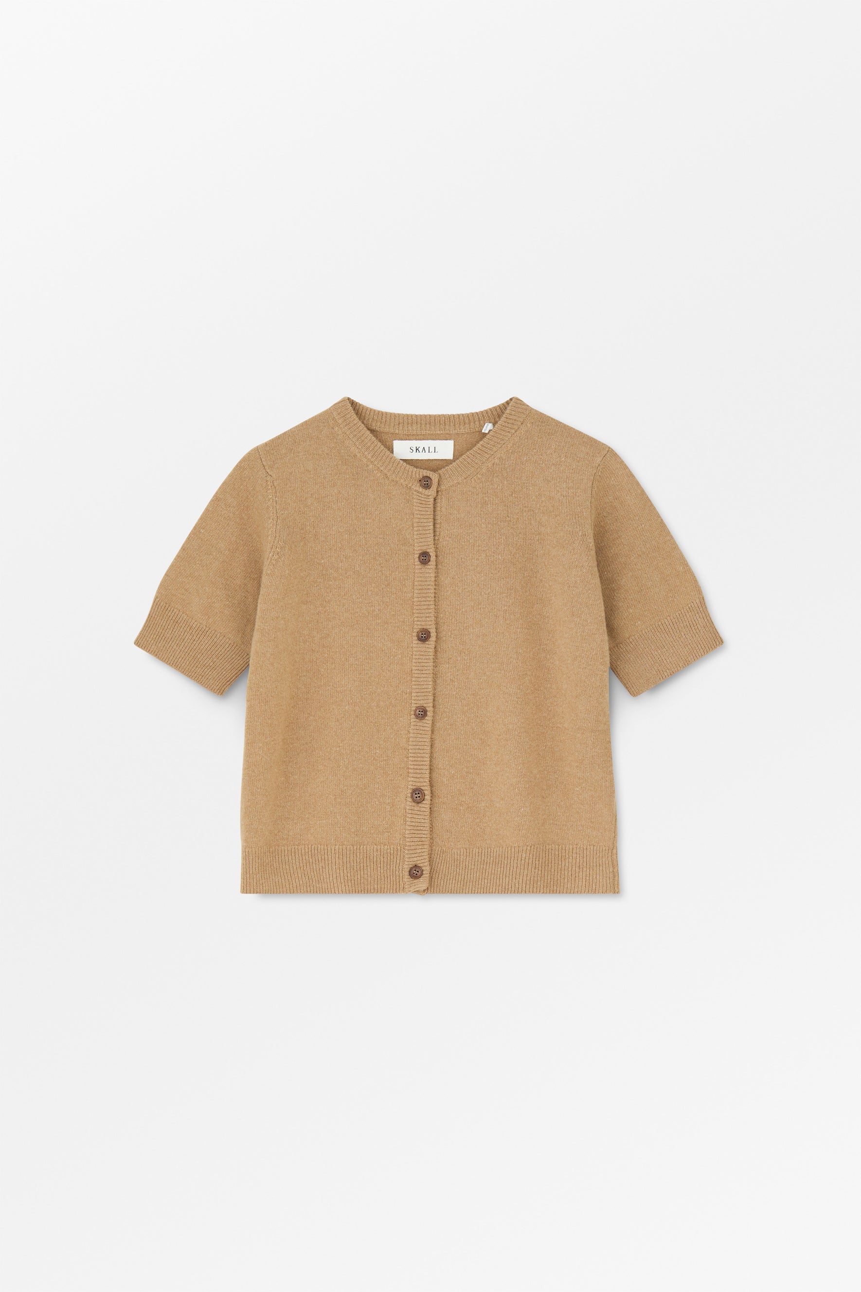 Diana Cardigan is a chic short-sleeved cardigan with a round neck and button up front. Made from 100% wool, it has double rib at the neck and ribbing at the hem and sleeves. Fashioning at the neck gives an elegant detail.