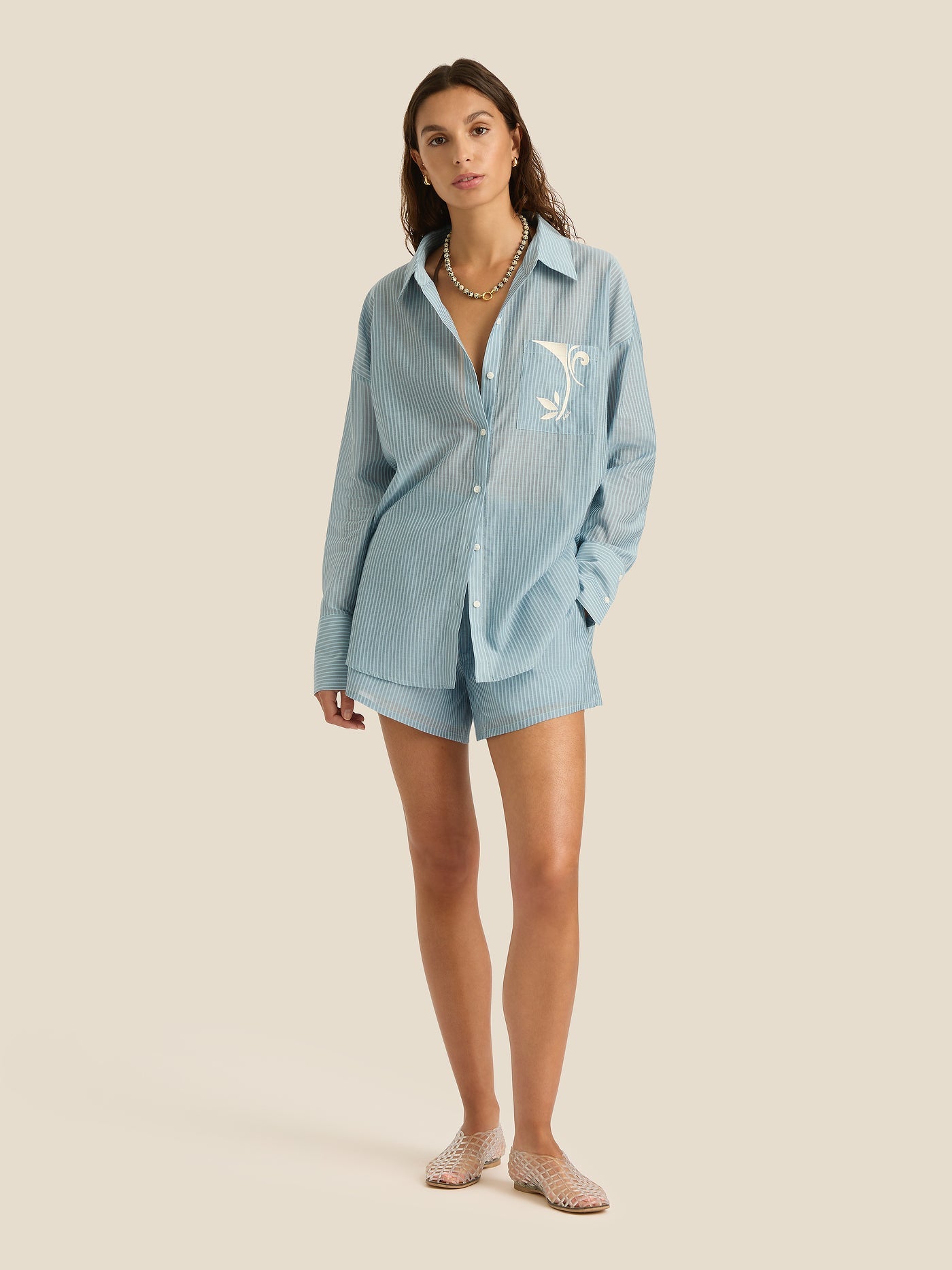 Scaling back our Reed motif into organic parallel lines, ‘Ripple’ is embroidered across ready-to-wear as a delicate woven stripe, and conceived as a colour-blocked pareo placement. Like ripples across the water’s surface, this print carries the collection’s core themes — a visual reflection of the ocean’s natural rhythm, and a symbol of the way the feeling of kindred flows through a group of people.
