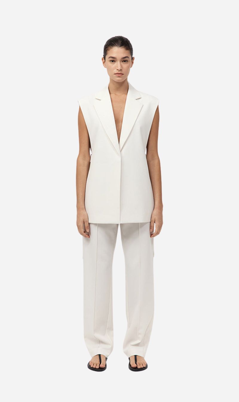The Relaxed Side Tie Vest offers a relaxed silhouette, crafted from a supple wool blend. Designed with a V-neckline and finished with open side seams with ties. The Relaxed Side Tie Vest brings ease to tailored ensembles and pairs perfectly with the Twill Wide Leg Pleat Pants.