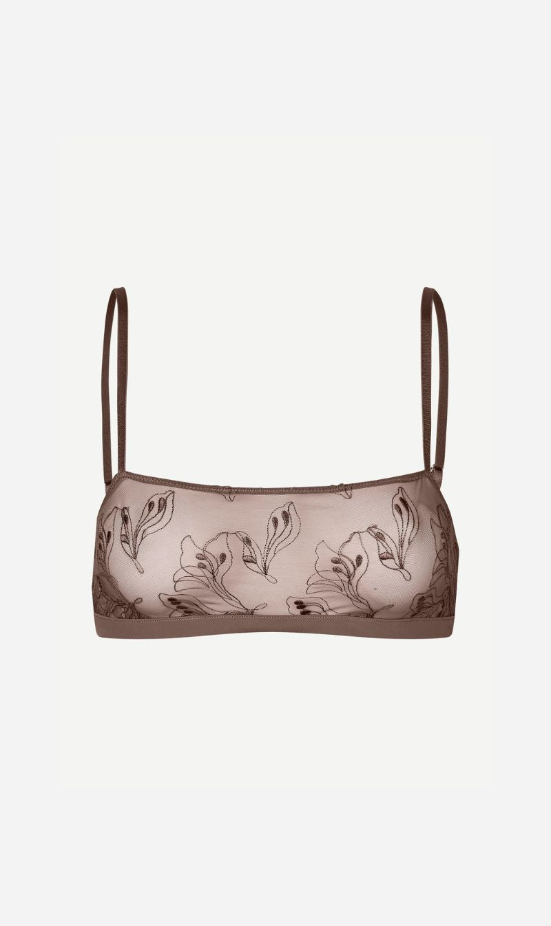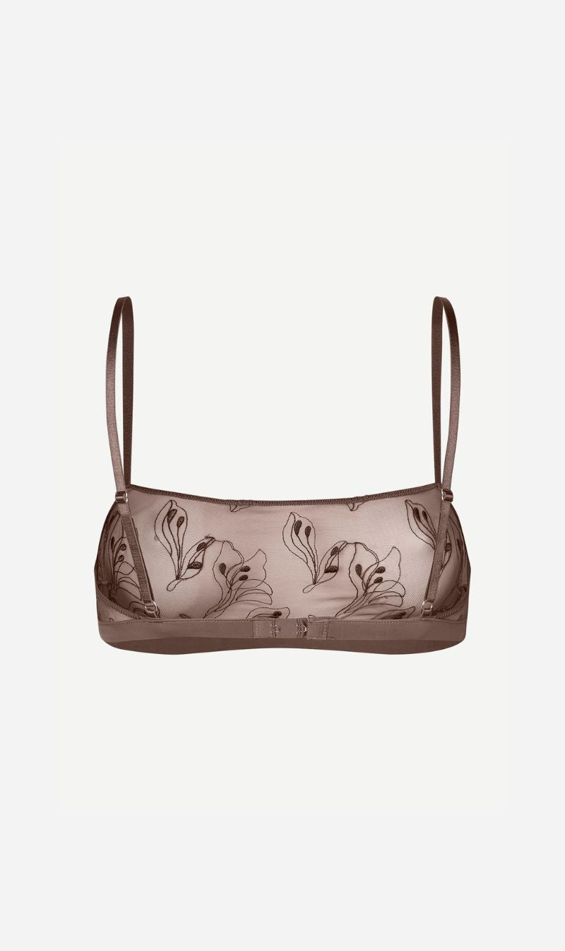 Sheer bralette with thin, adjustable straps. Hook and eye closure on the back. Floral embroidery. Main material made from an elastic blend of recycled polyamide. This product is GRS certified. Each stage of the supply chain has met strict social, environmental, and chemical requirements.
