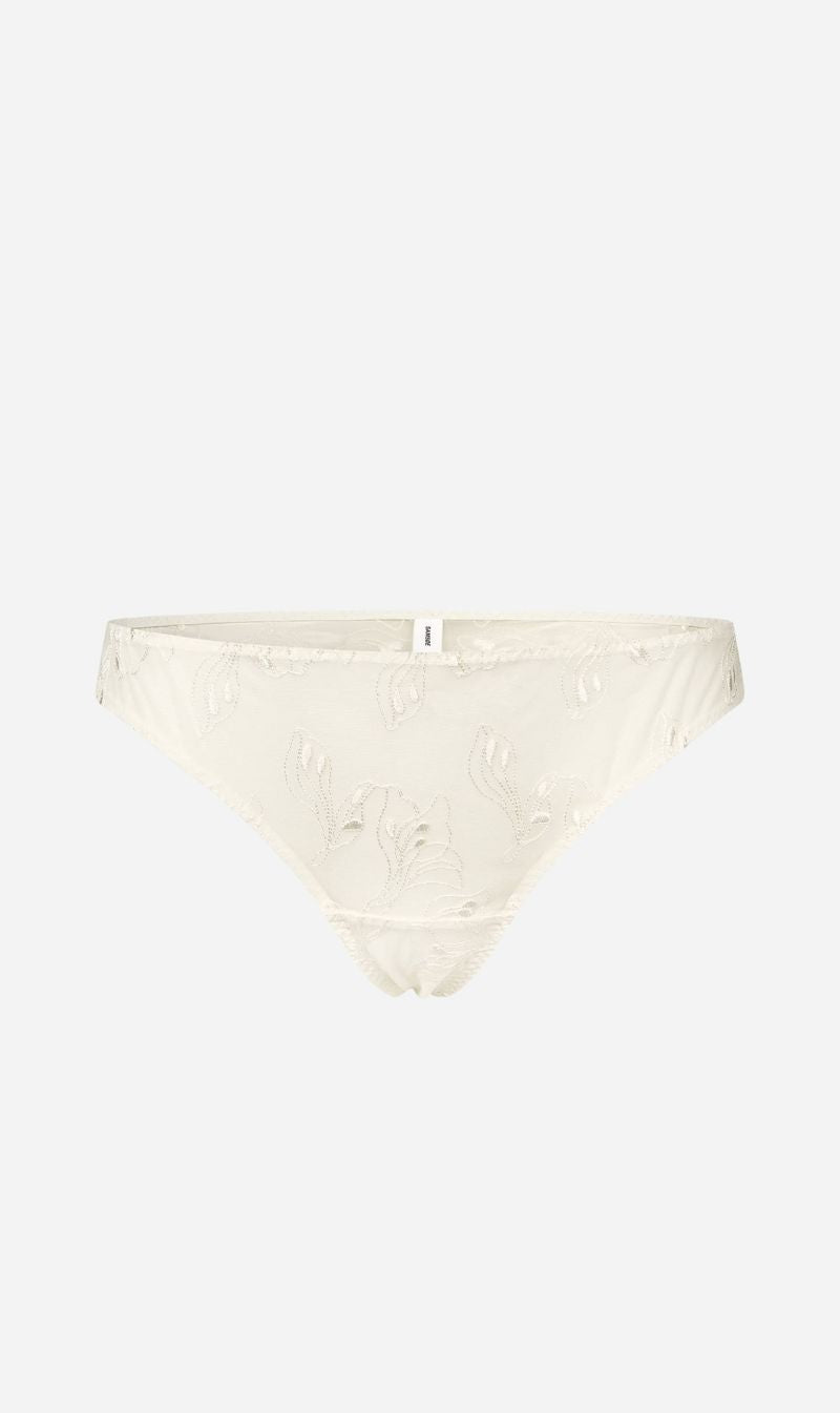 Mesh panties with a brazillian silhouette. Elastic seams and waistband. Embroidered flowers. Insert made from 100% cotton jersey. Main material made from an elastic blend including recycled polyamide. This product is GRS certified. Each stage of the supply chain has met strict social, environmental, and chemical requirements.
